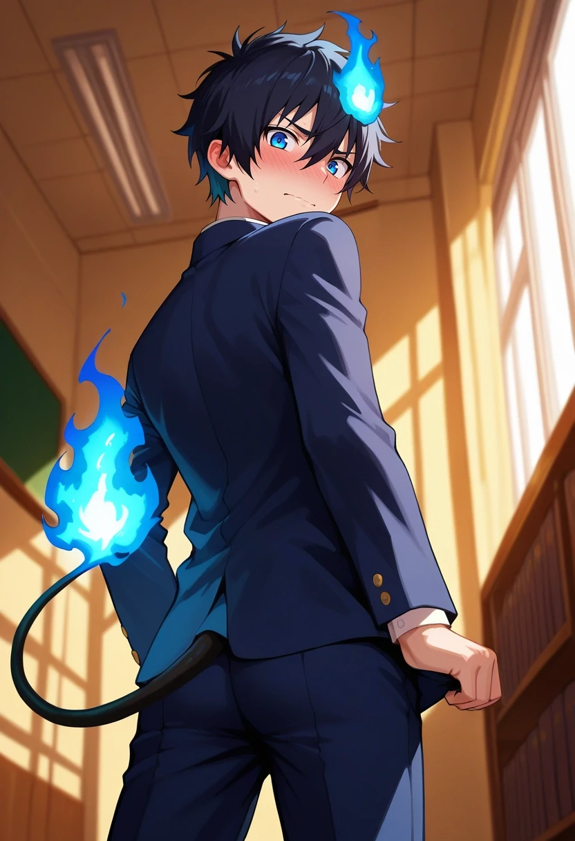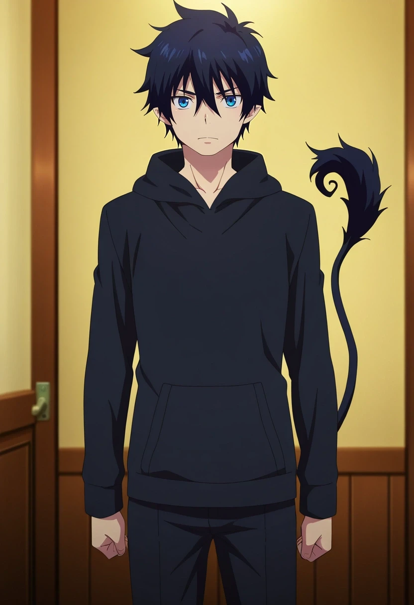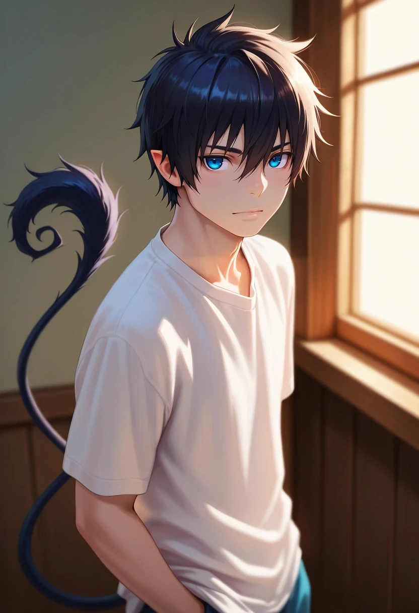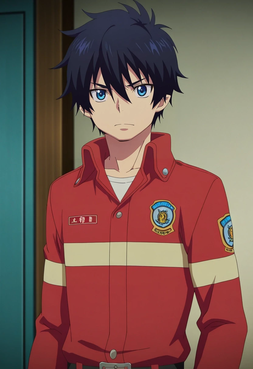 rin_okumura, black hair, blue eyes, short hair, pointy ears, hair between eyes
