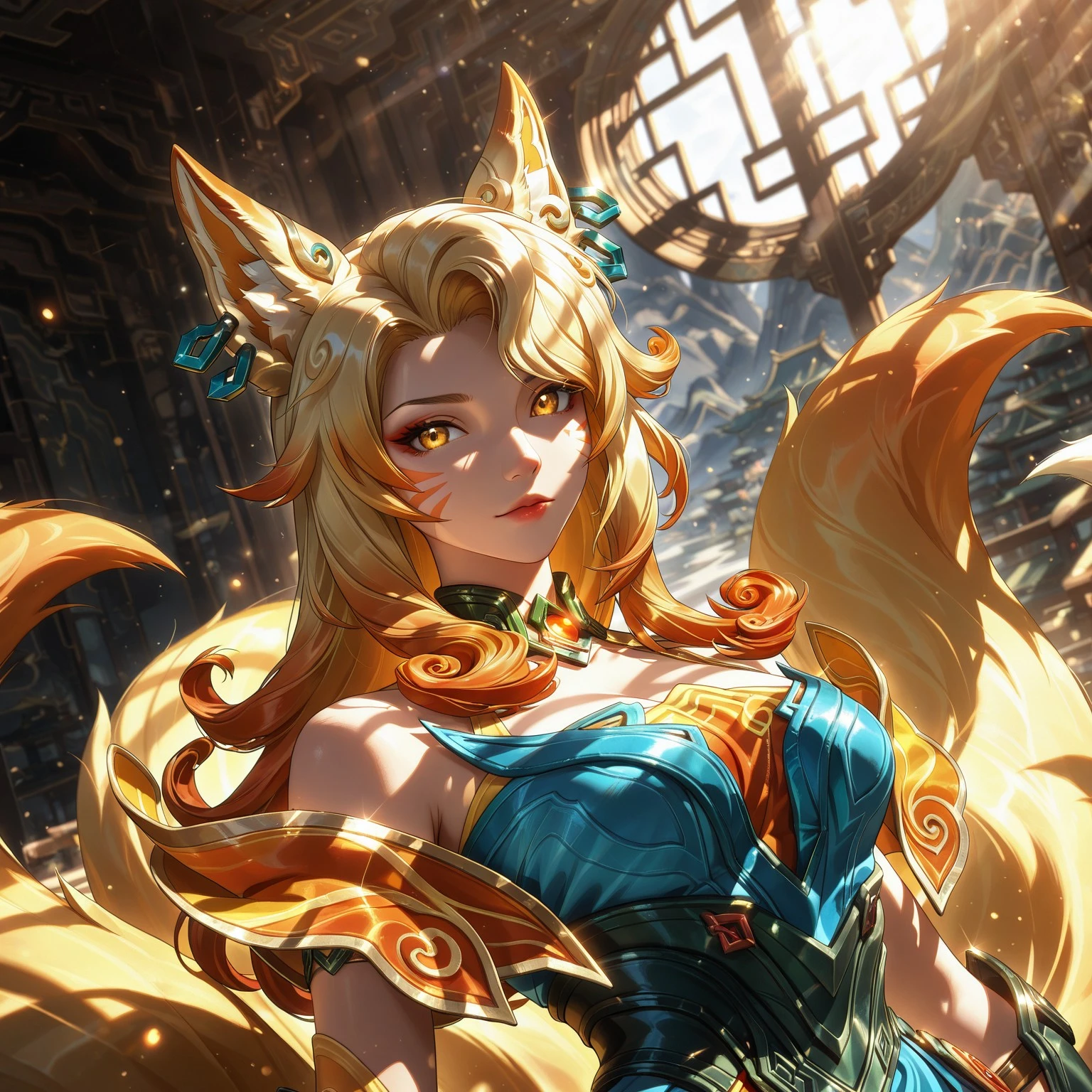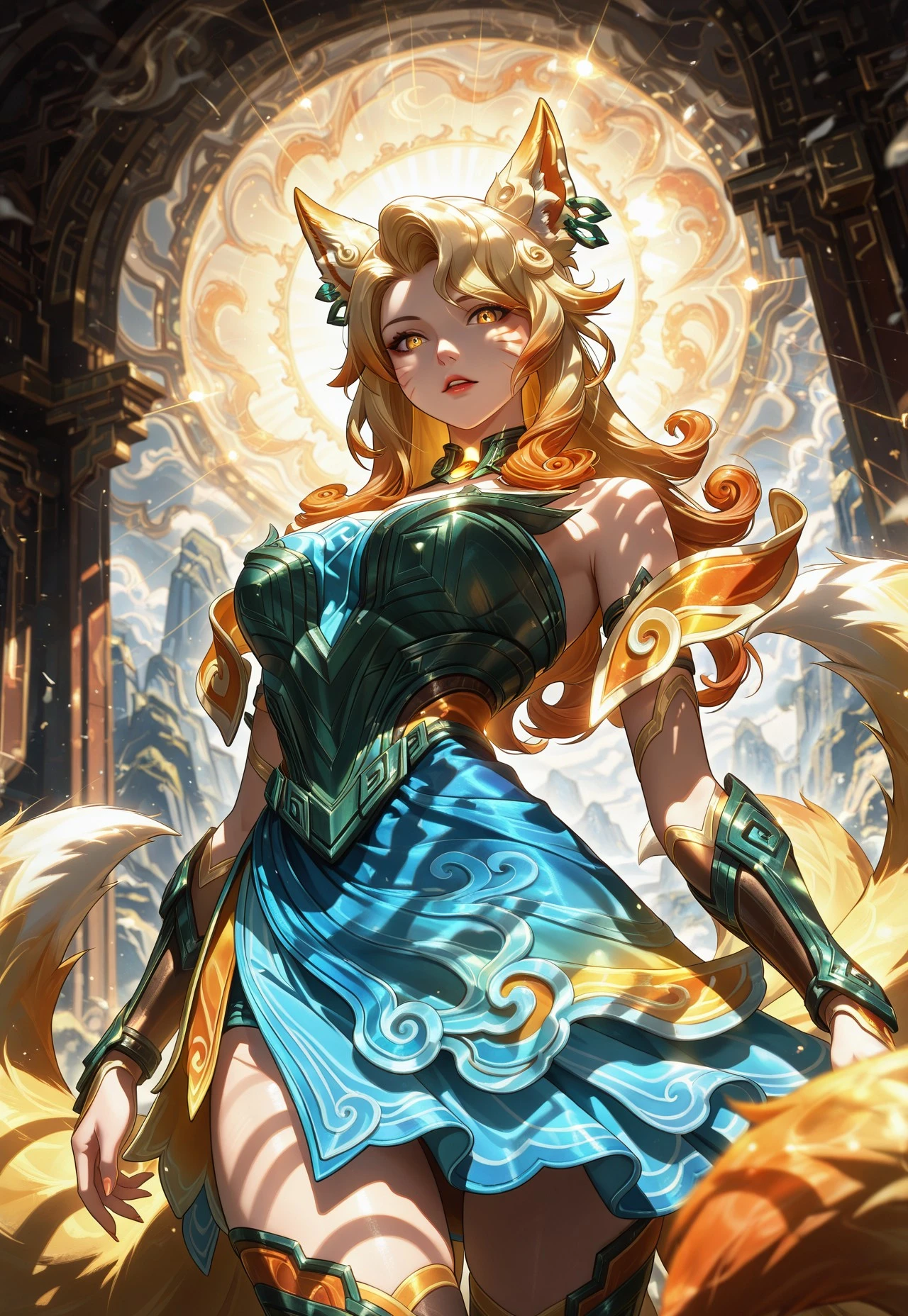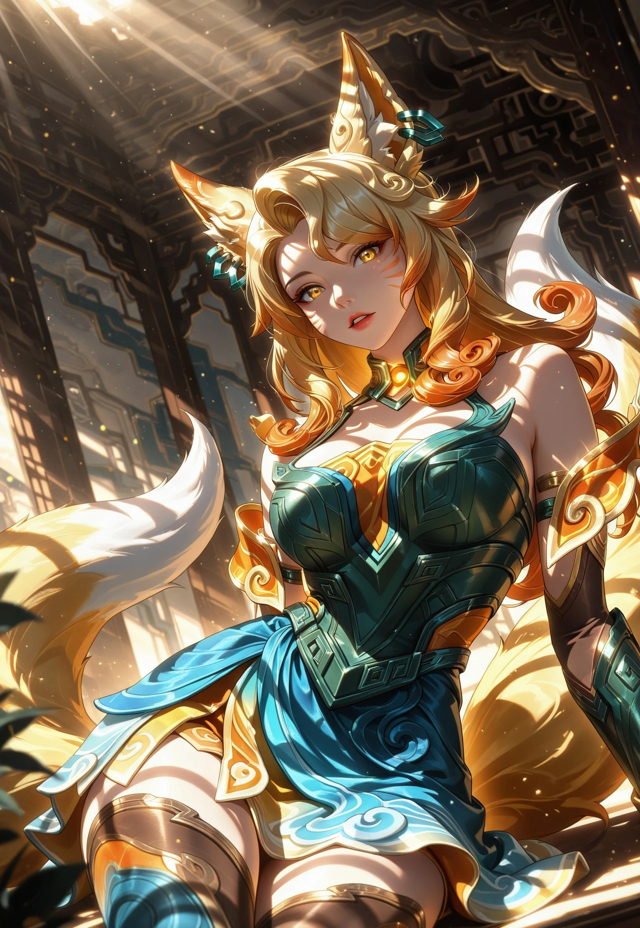 SHSahri, long hair, blonde hair, gradient hair, hair ornament, fox girl, fox tails, multiple tails, whisker markings, golden eyes, earrings, shoulders, detached sleeves, bracer, multicolored dress, thighhighs,