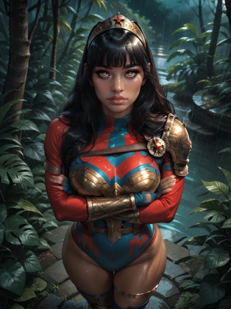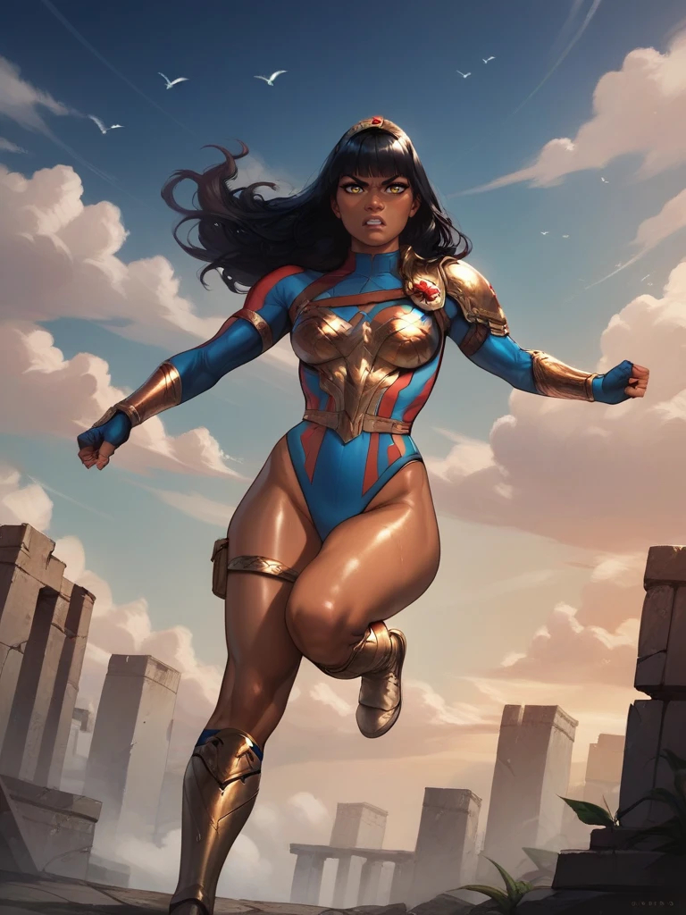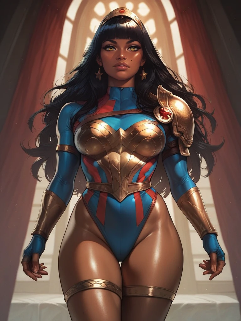 • Hero Prompt: YaraWG, dark-skinned female, amber eyes, mole on cheek, tiara, long hair, blunt bangs, single pauldron, shoulder armor, leotard, long sleeves, leg band, knee boots,