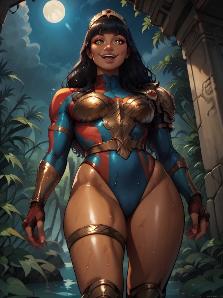 • YaraWG, dark-skinned female, amber eyes, mole on cheek, tiara, long hair, blunt bangs, single pauldron, shoulder armor, leotard, long sleeves, leg band, knee boots,