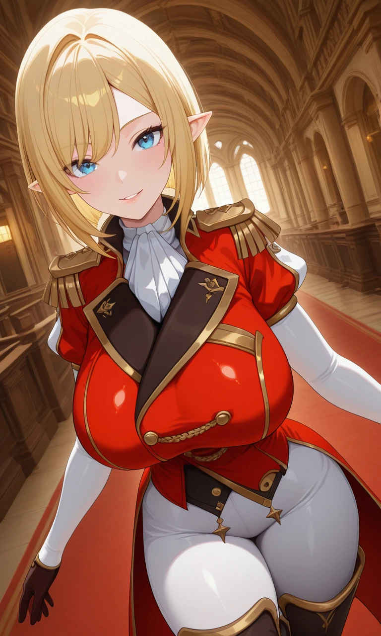 short hair, Bob cut, asymmetrical bangs, blonde hair, blue eyes, pointy ears, red riding clothes, Brown gloves, gold decorations, gold Epaulette, white riding breeches, Brown thigh boots, gold high heel,