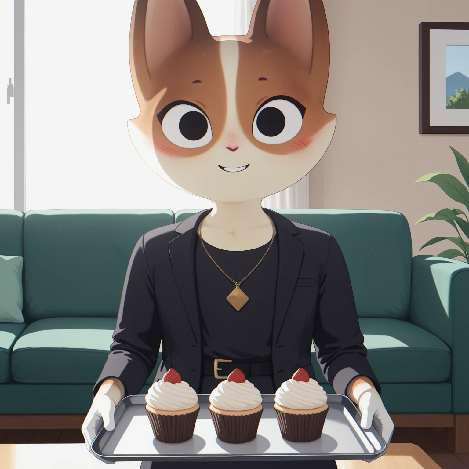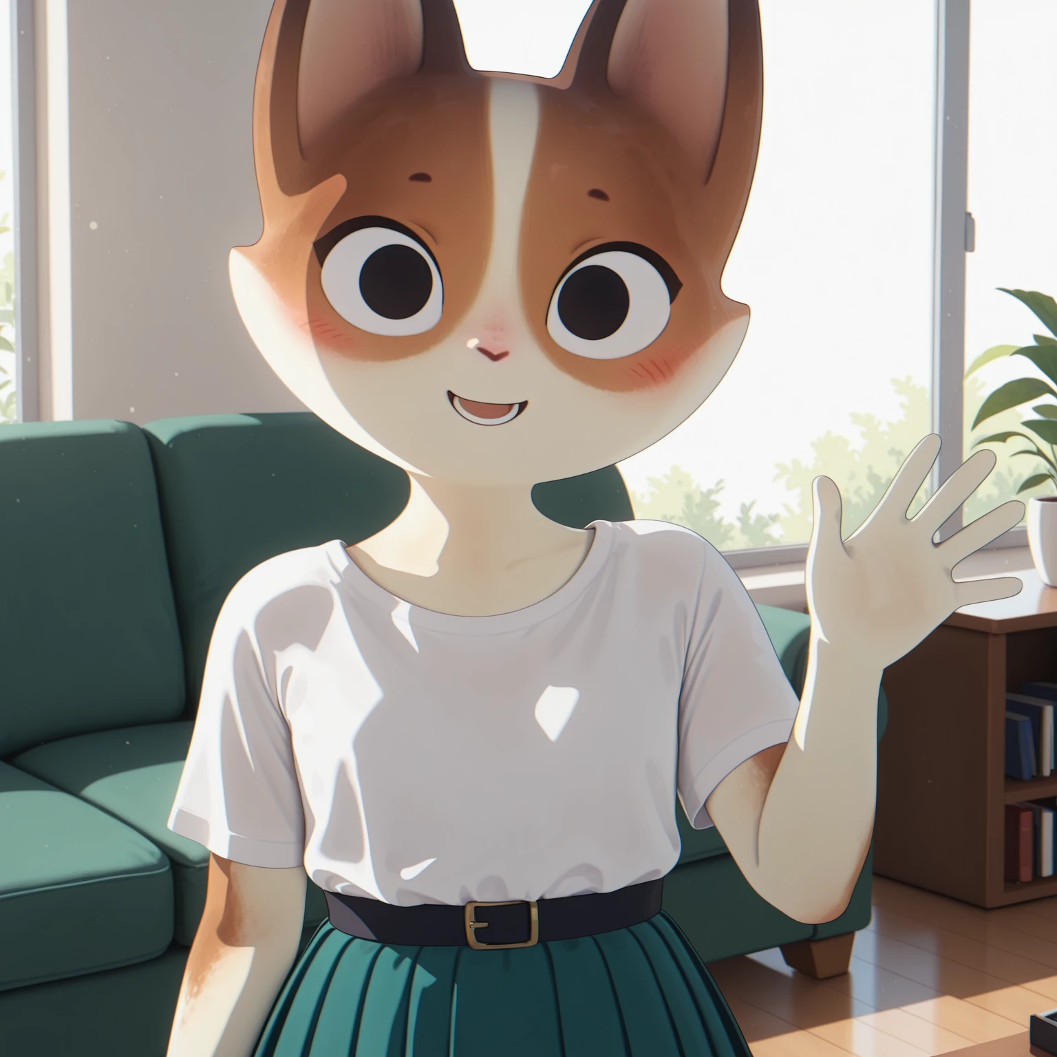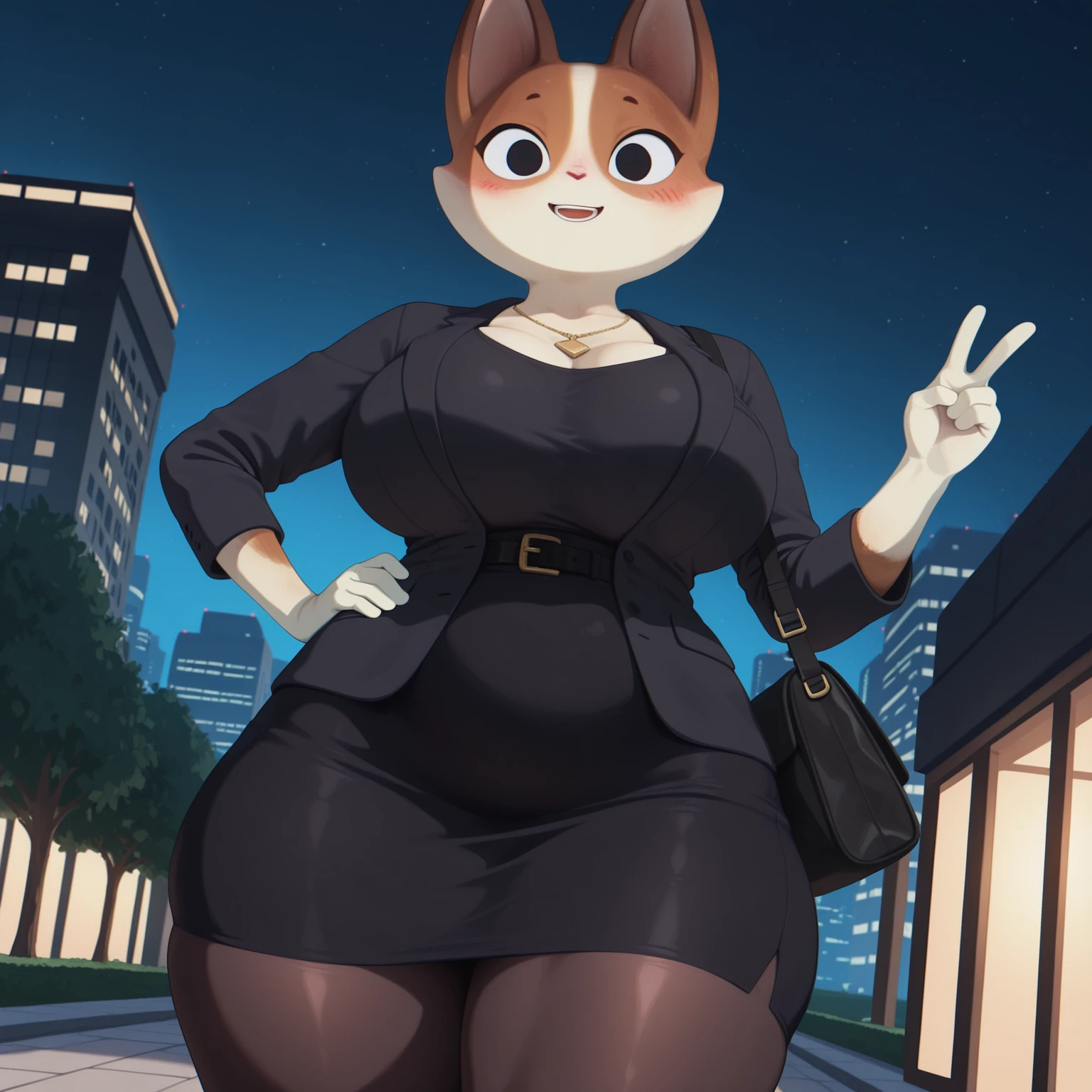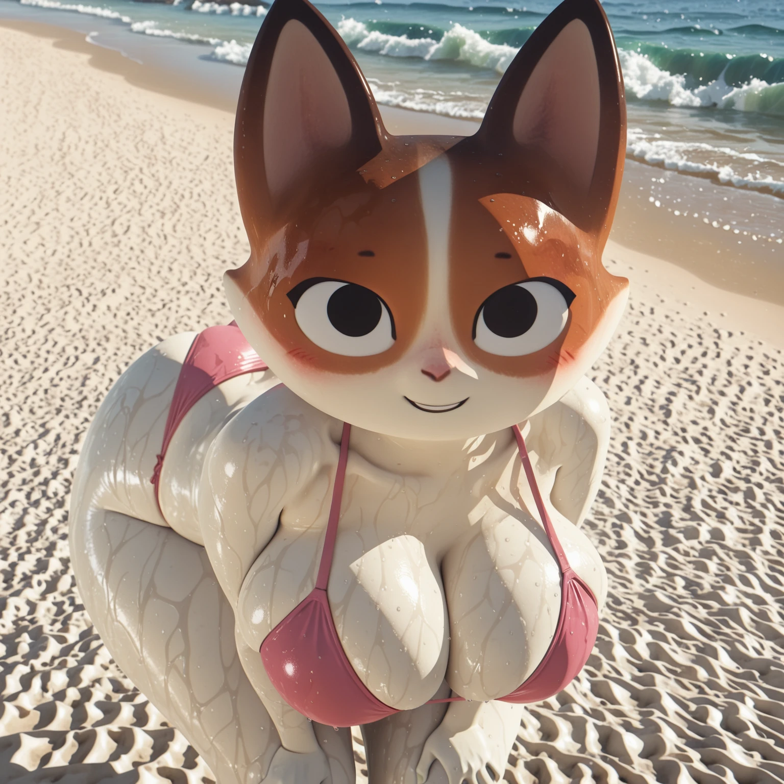 Positive Prompts: KatHTP, furry female, anthro, feline, cat, black eyebrows, tiny eyebrows, black eyes, no pupils, pink nose, orange fur, white fur, white body, blushing, flat chested