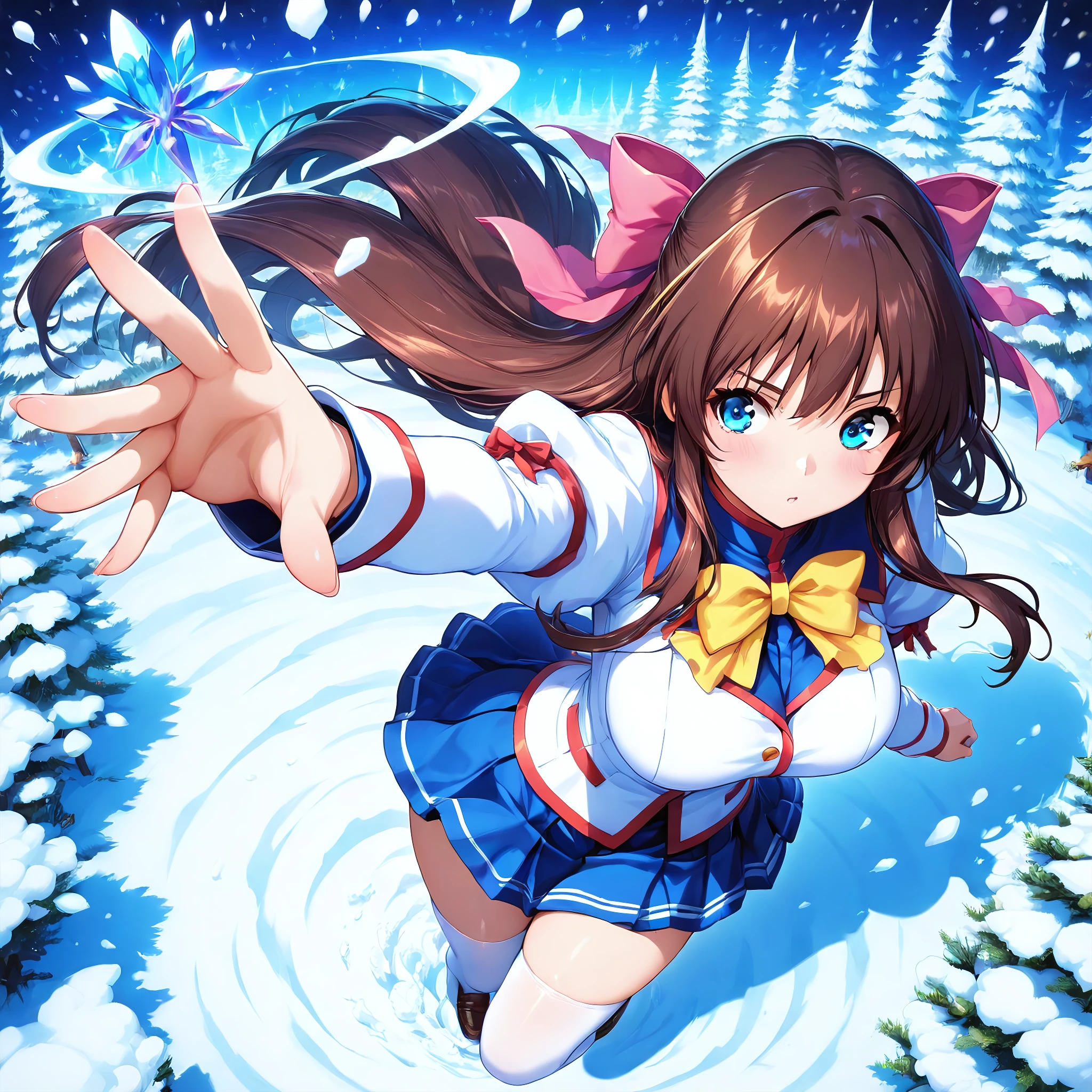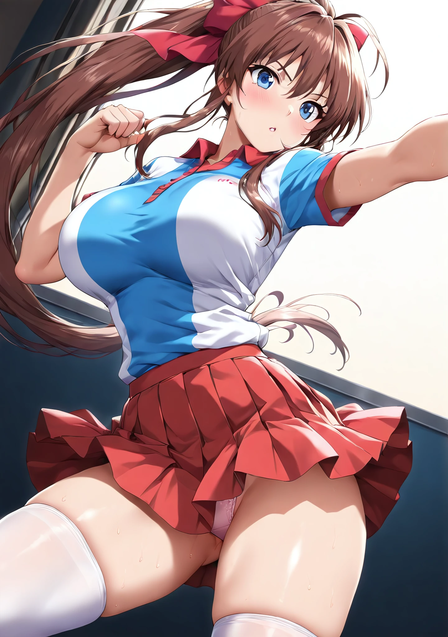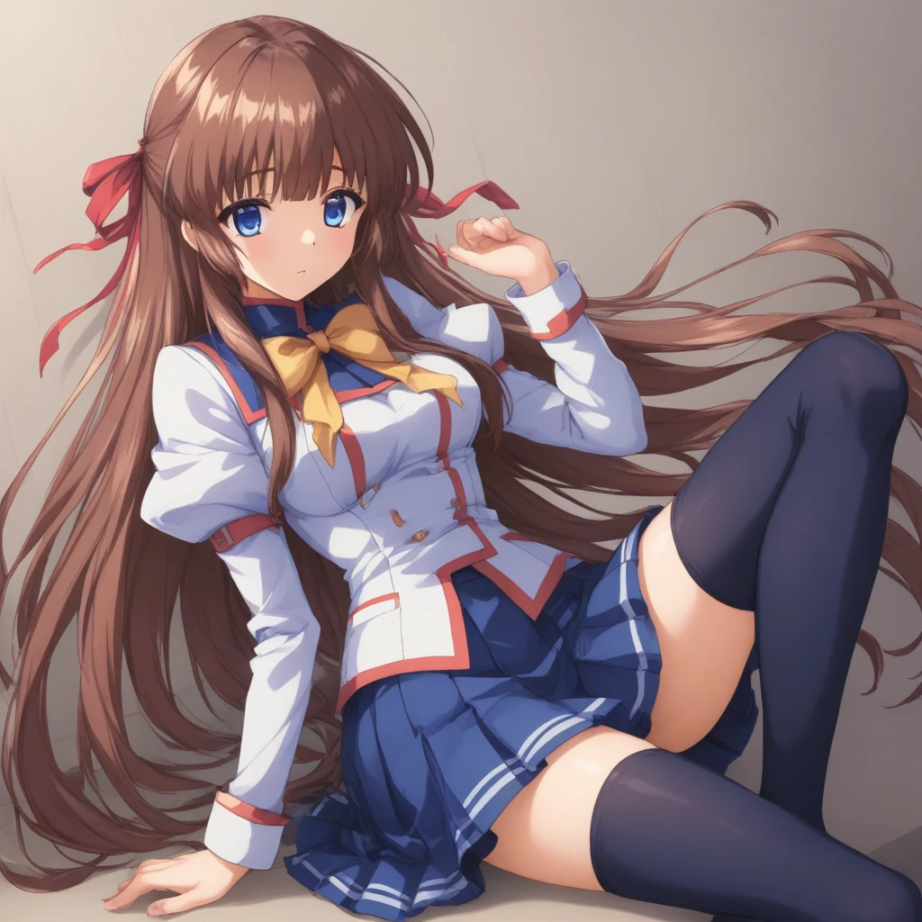 Kanzaki_aoiTB, long hair, brown hair, hair ribbon, bangs, blue eyes, school uniform, skirt, White thighhighs, long sleeves, white jacket, blue skirt, miniskirt, puffy sleeves, pleated skirt
