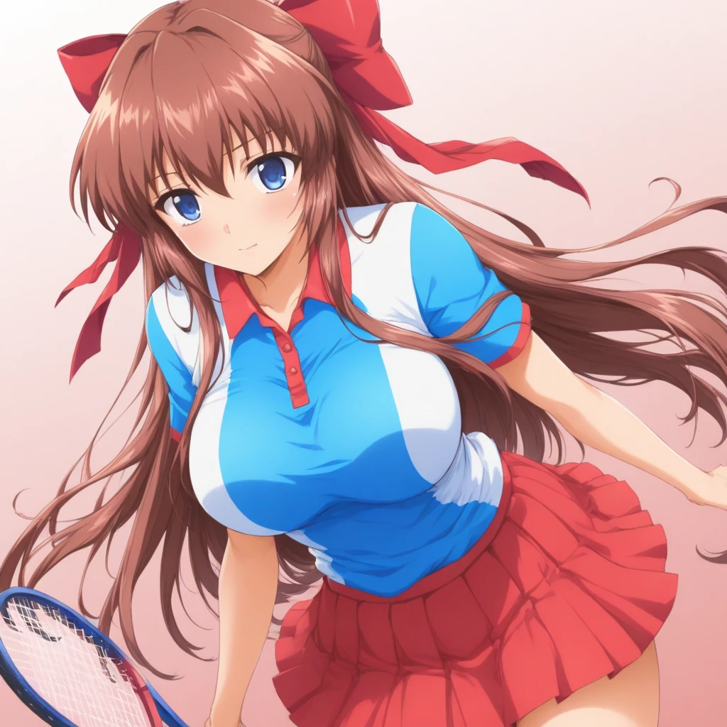 Kanzaki_aoiTB, blue eyes, hair bow, tennis uniform, polo shirt, raglan sleeves, pleated skirt, red skirt, short sleeves,