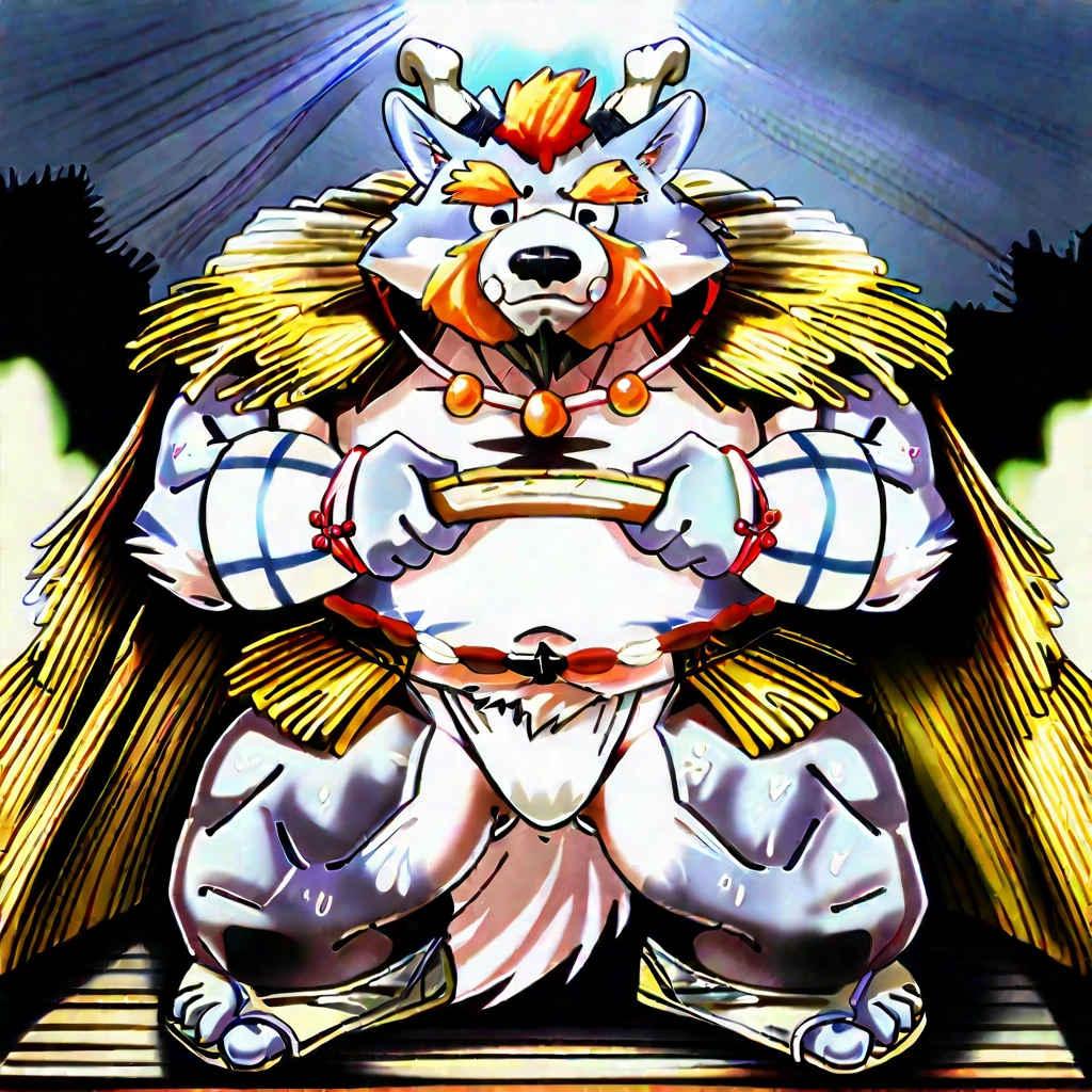wolf spirit man, kemono, anthro wolf, furry, chubby, muscular, bara, blue fur, white fur, two tone fur, light brown hair,armpit hair, belly hair, beard tufts, ????? hair, elbow hair, black goatee, fluffy tail, sharp claws, beastly legs, short muzzle, pointed wolf ears, dark bone horns, fangs visible, Japanese folklore style, yokai aesthetic,