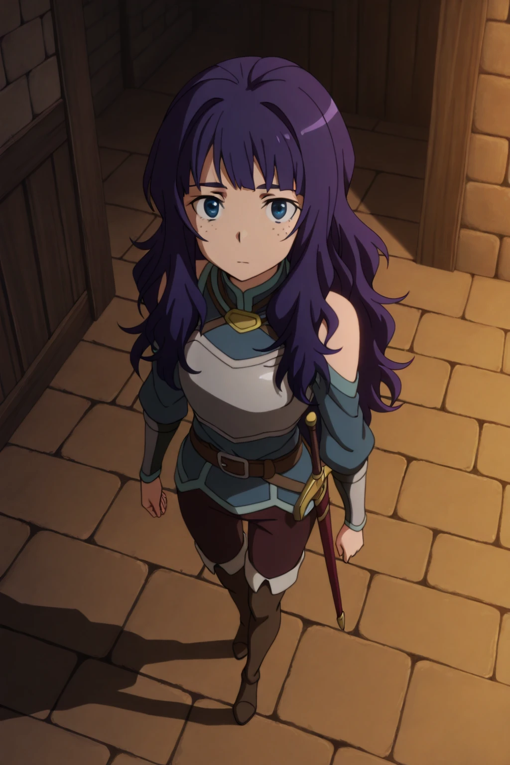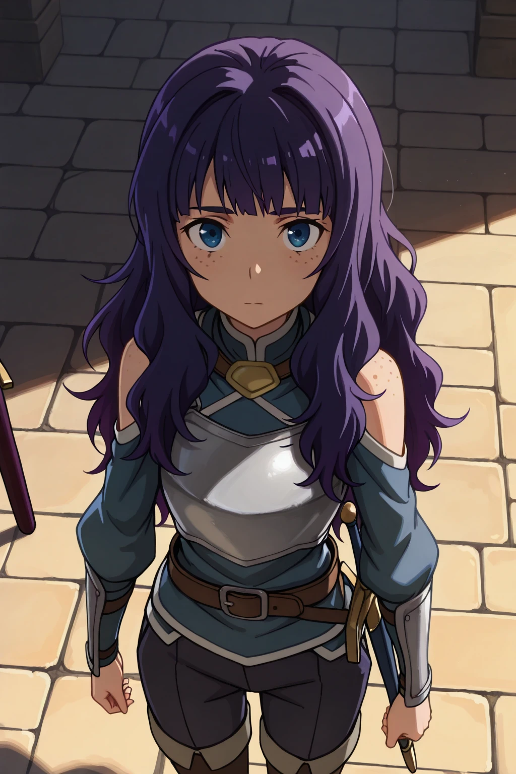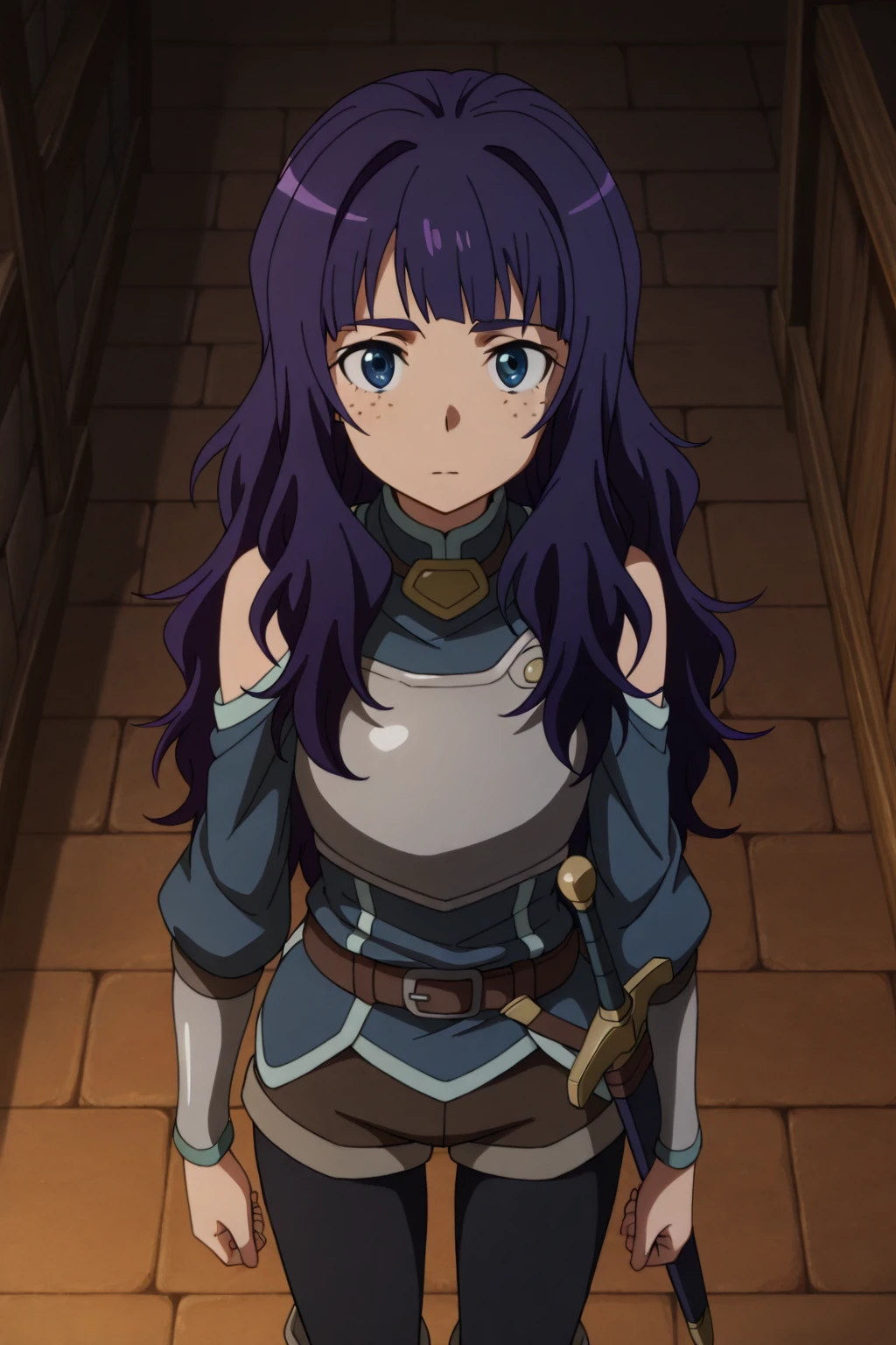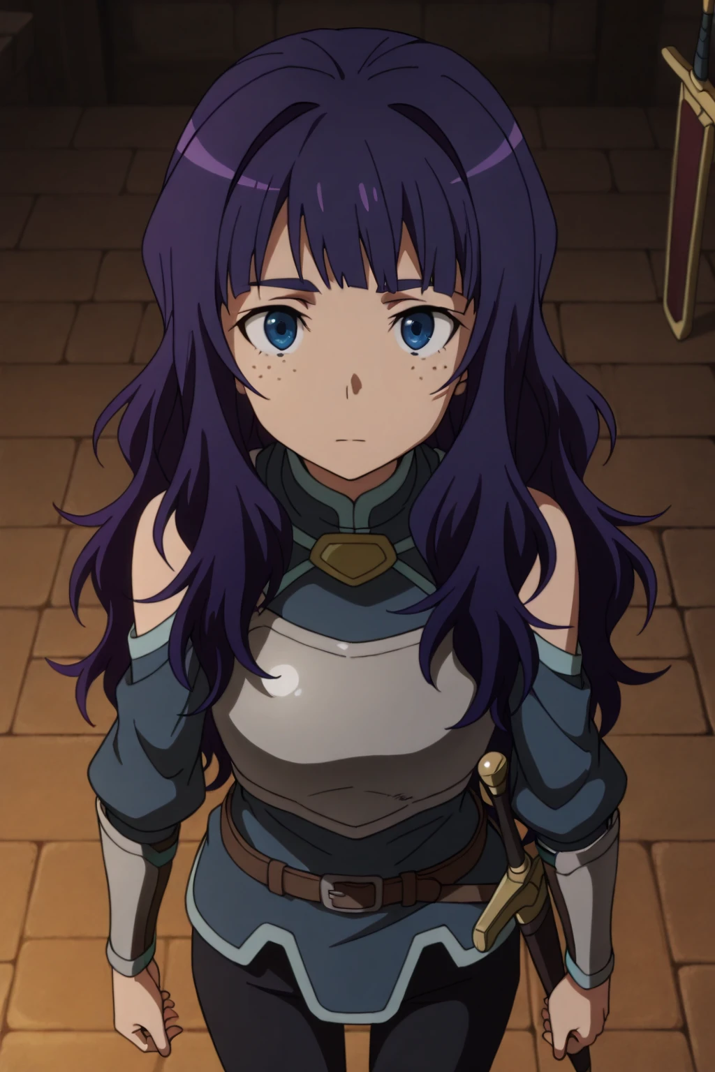long hair, purple hair, blue eyes, freckles
