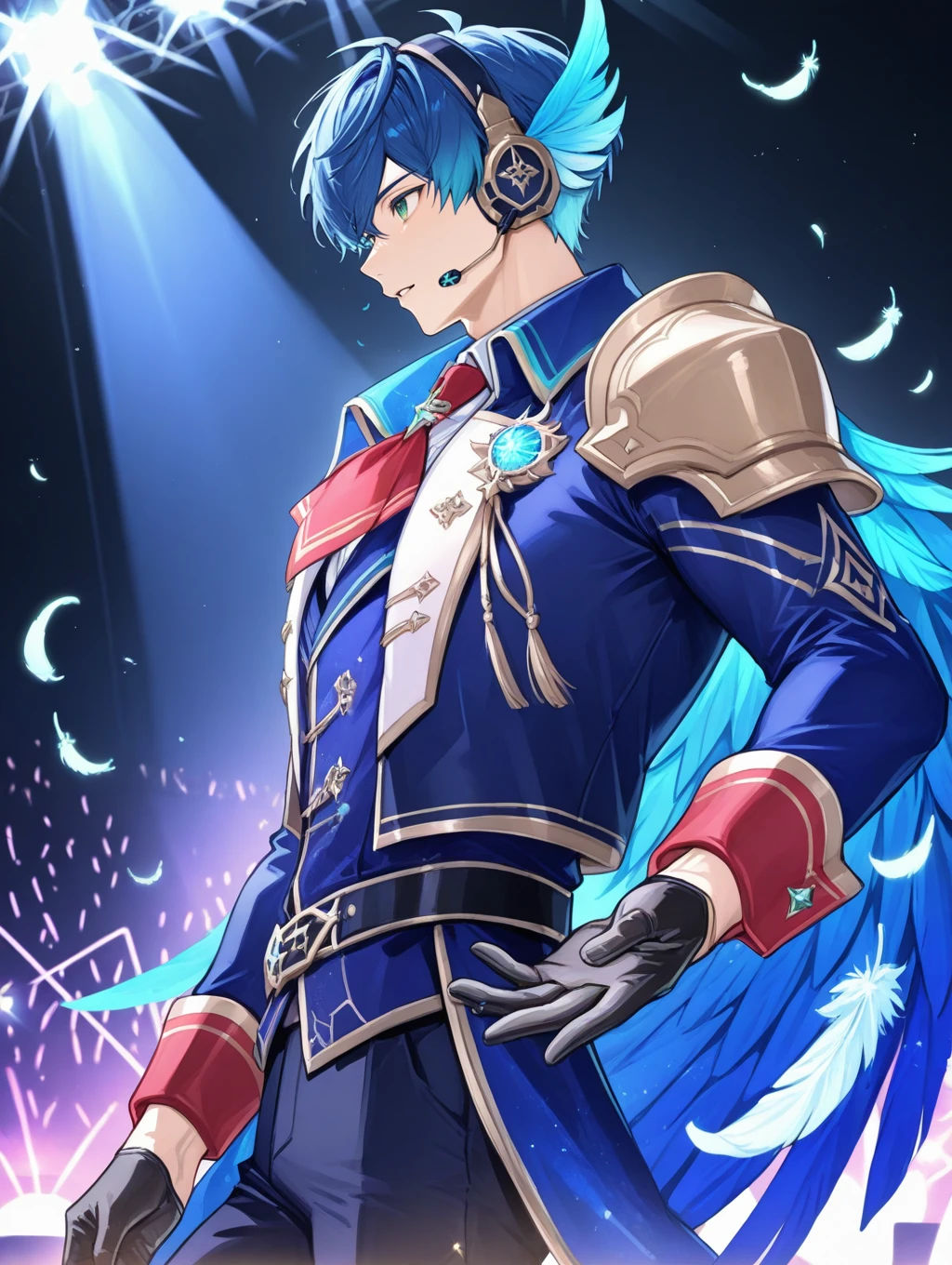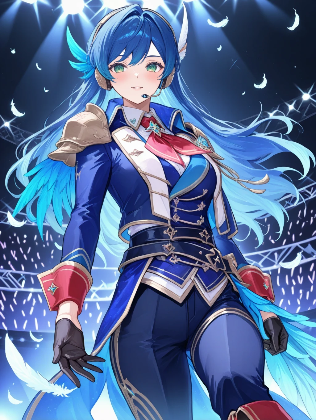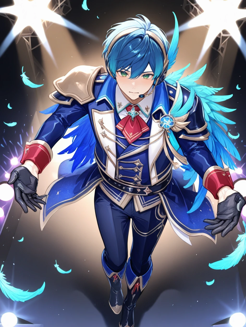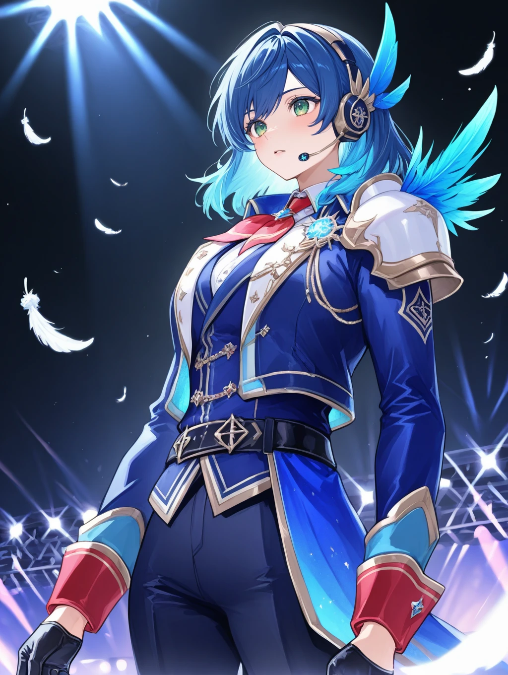 utahosi,blue hair,green eyes,headset,feathers,blue jacket,pauldrons,long sleeves,black gloves,pants,stage lights,red cuffs,red neckerchief,boots,
