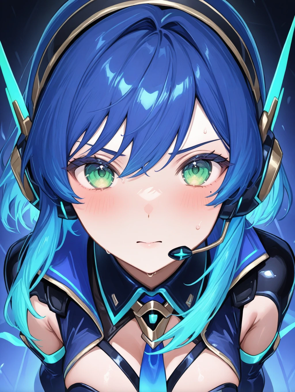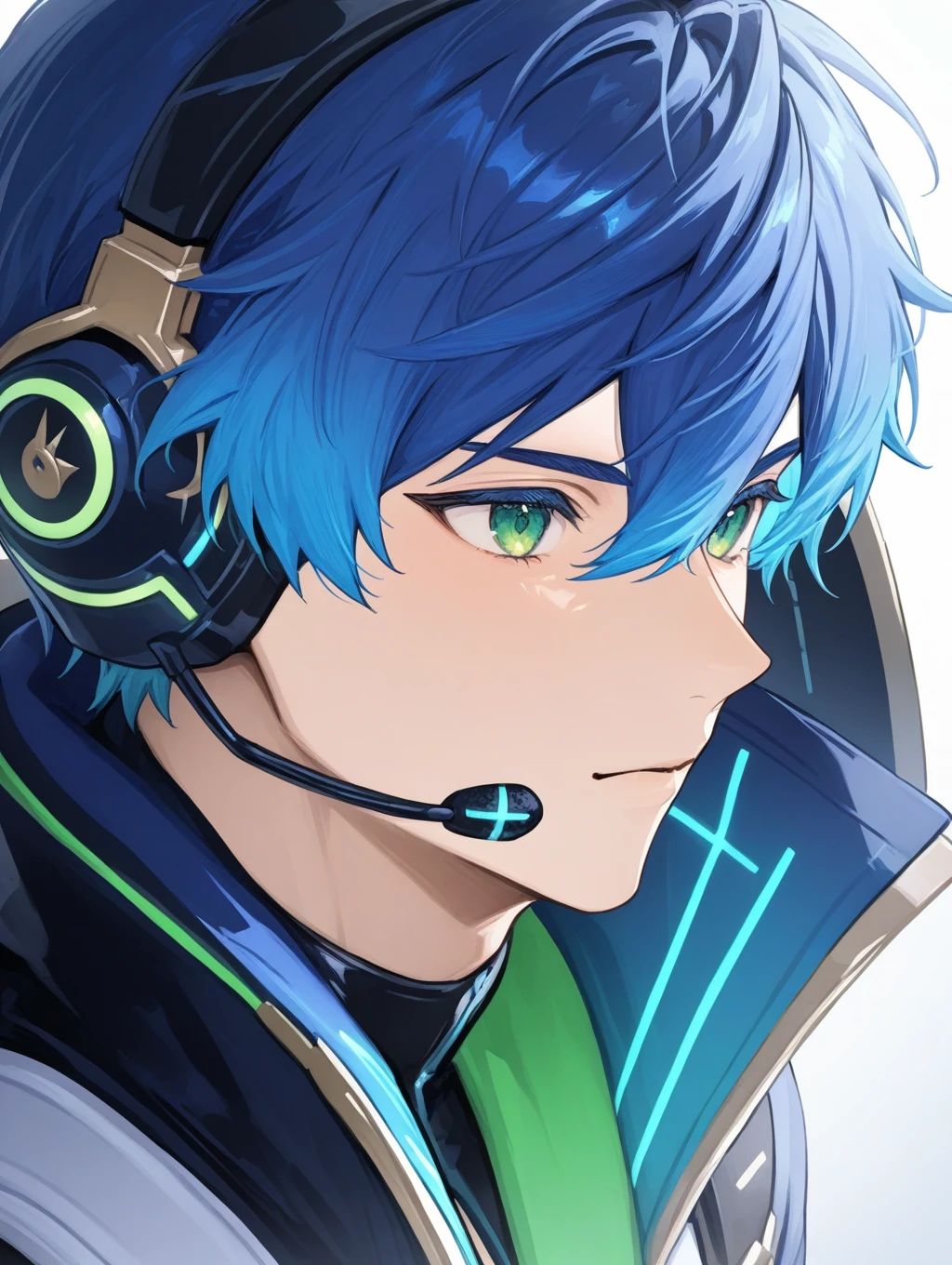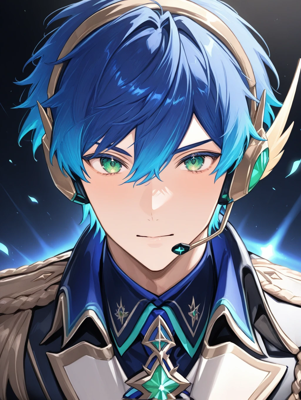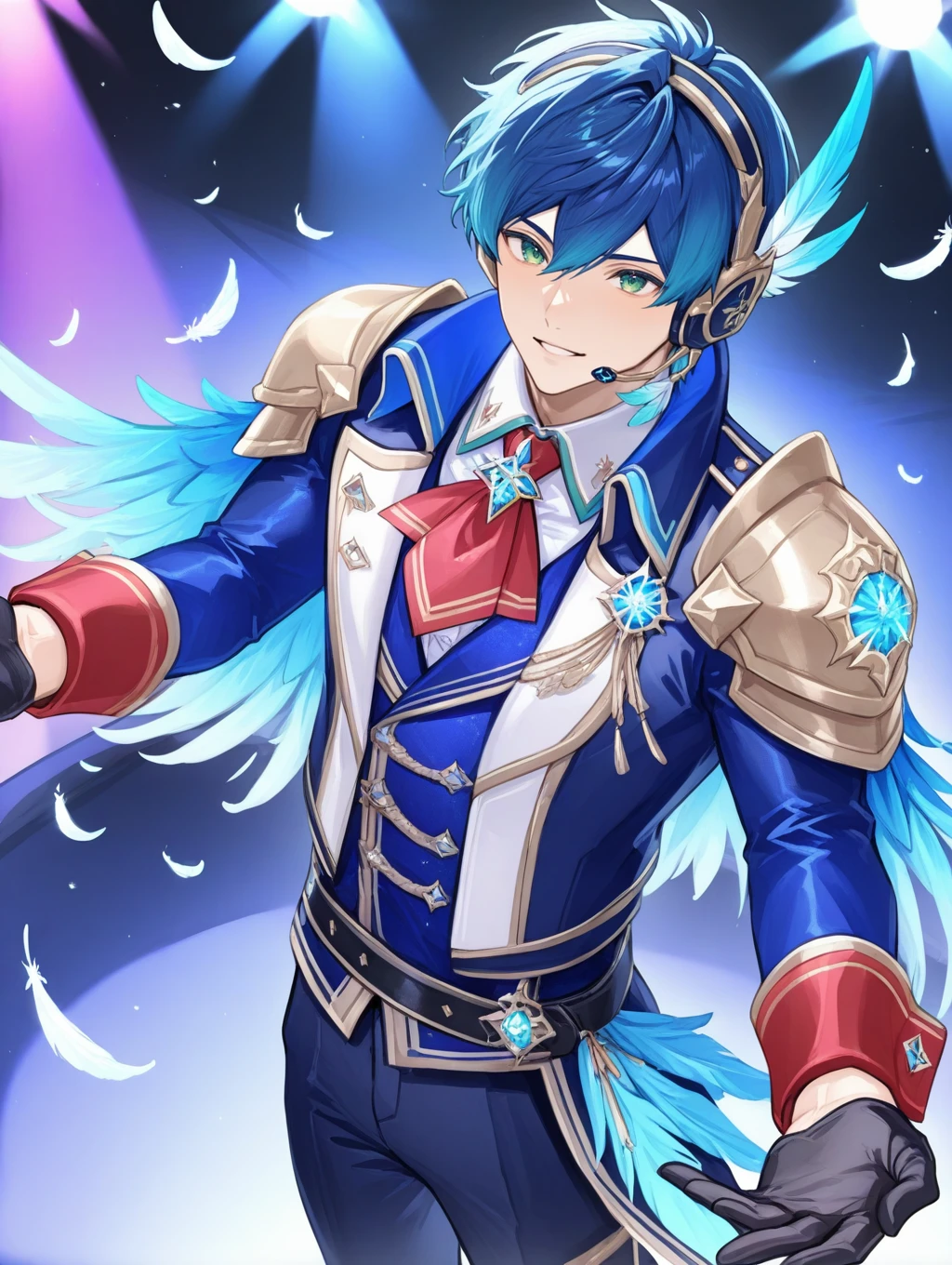 utahosi,blue hair,green eyes,headset,feathers,blue jacket,pauldrons,long sleeves,black gloves,pants,stage lights,red cuffs,red neckerchief,boots,