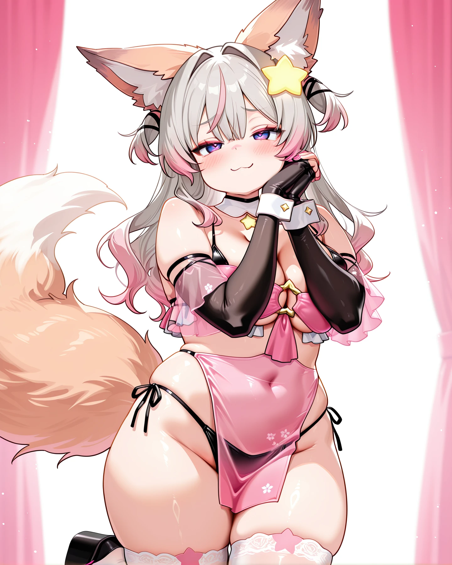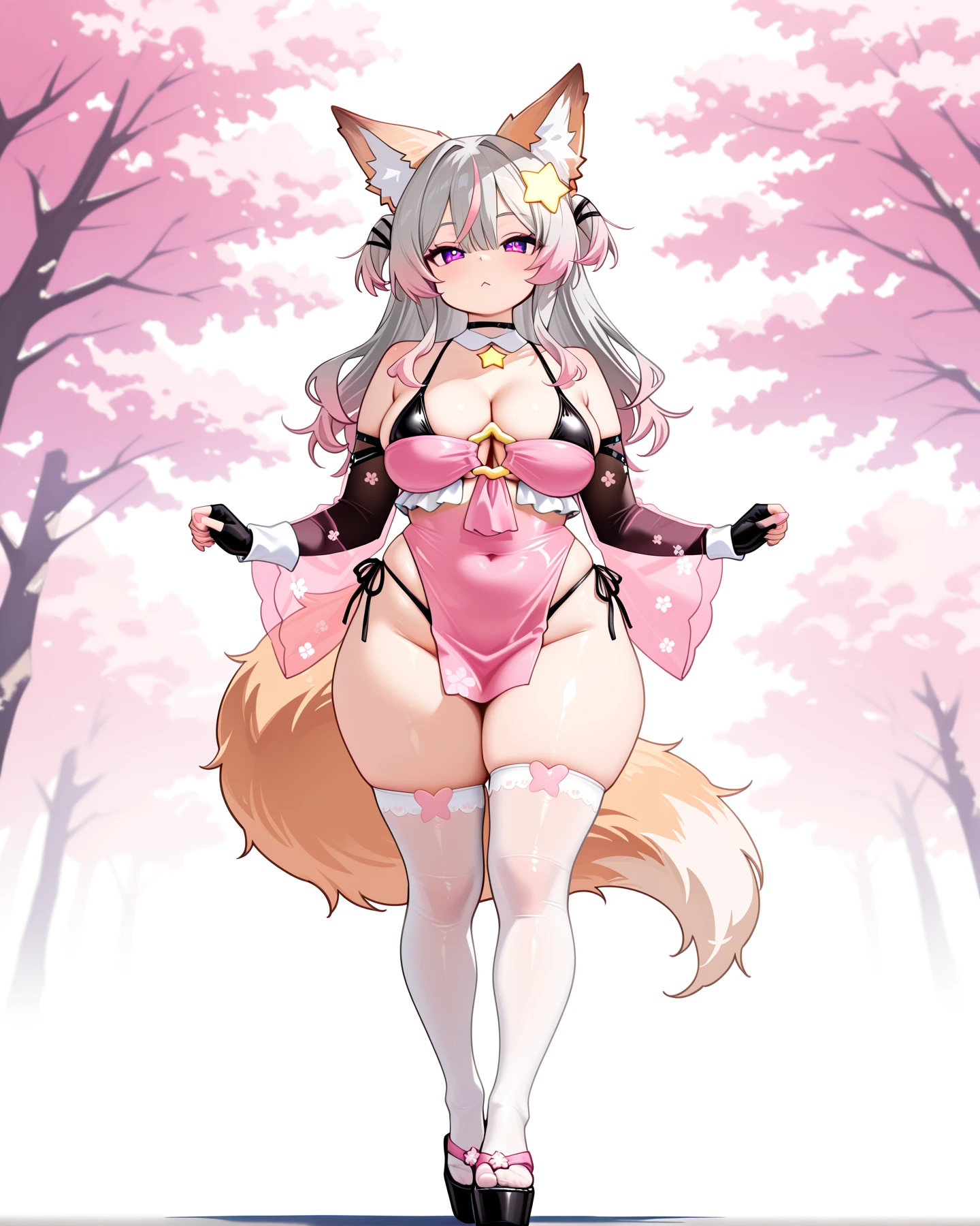 fox ears, fox tail, multicolor hair, grey hair, pink tips, bangs, long hair, star hair ornament, purple eyes, large breasts, ClassicOutfit, detached collar, star shaped o-ring, cleavage, black straps, two-tone bikini, covered navel, pink dress, clothing cutout, pelvic curtain, side-tie bikini bottom, see-through sleeves, detached pink wide sleeves, fingerless gloves, black elbow gloves, white cuffs, pink trim white lace thighhighs, platform sandals,