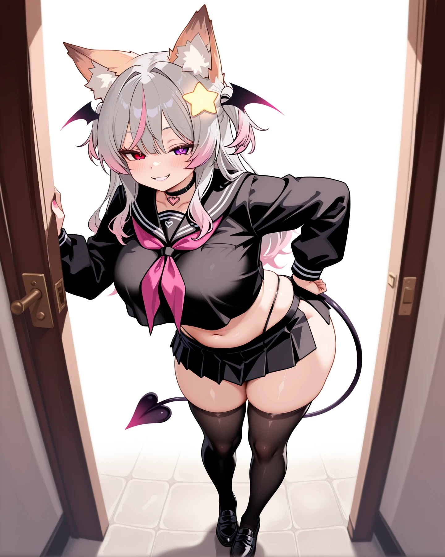 fox ears, demon tail, multicolor hair, grey hair, pink tips, bangs, long hair, star hair ornament, head wings, heterochromia, red eye, purple eye, large breasts, SucScho, choker, serafuku, black crop top, black school uniform, navel, black miniskirt, black thong, side slit, black thighhighs,