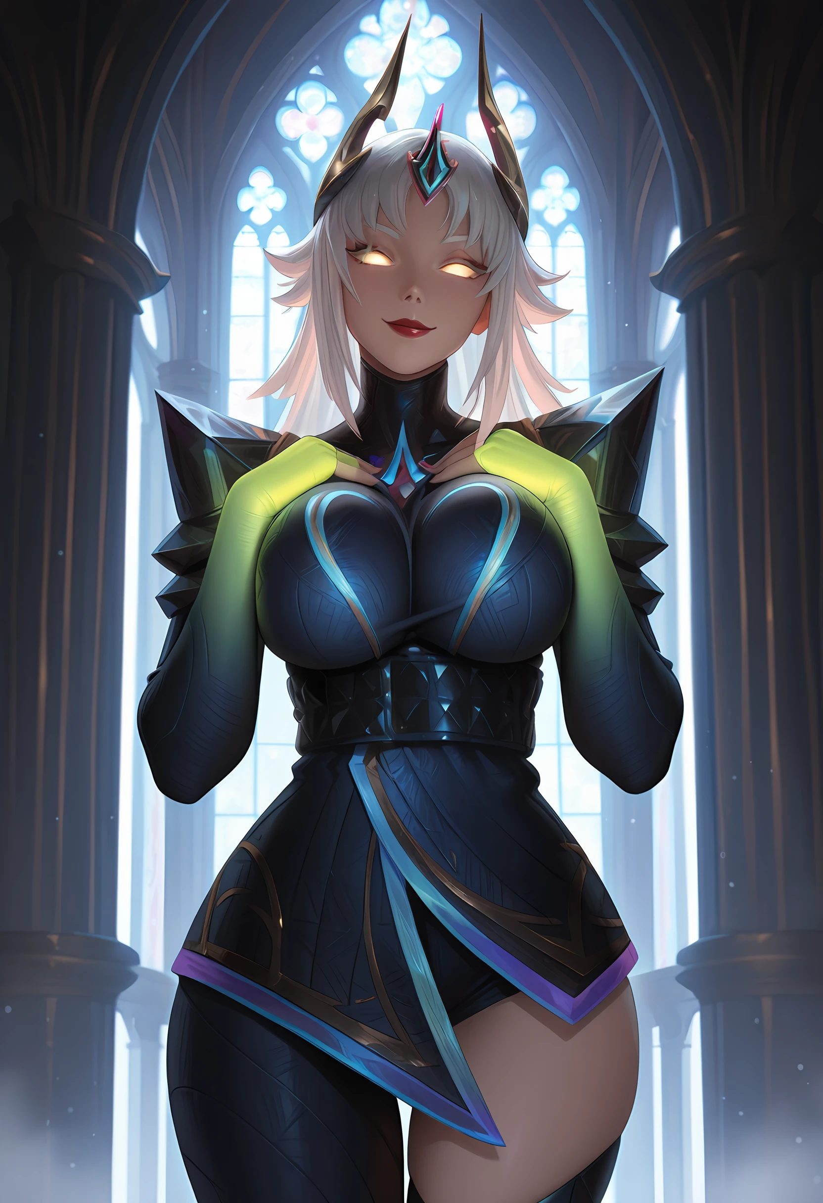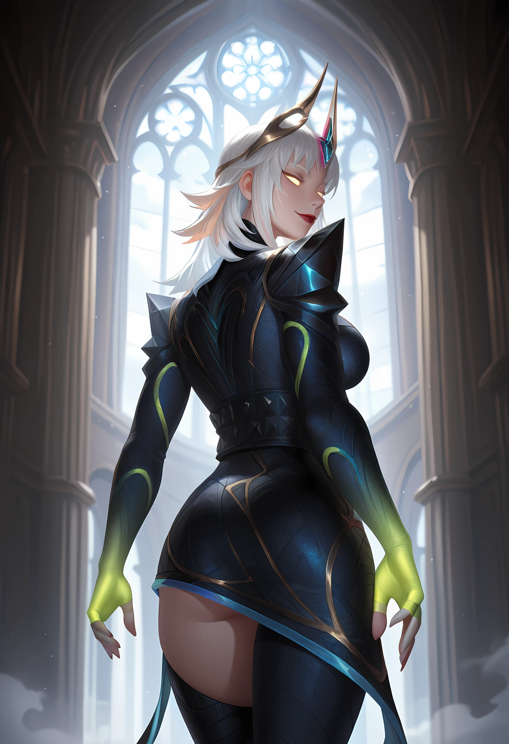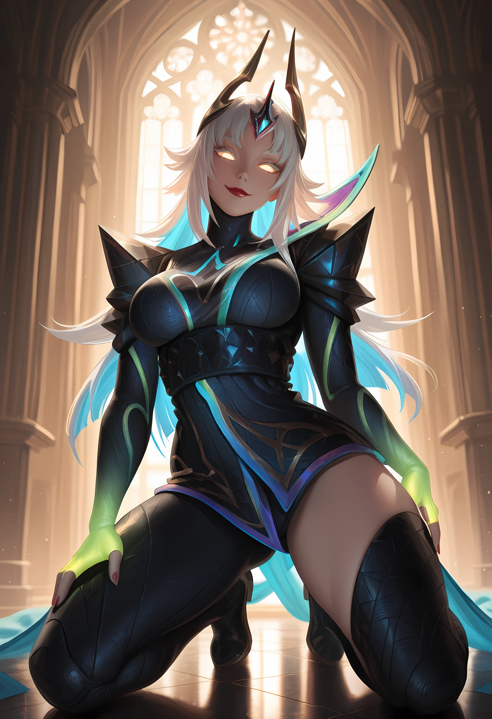 pekayleil, long hair, white hair, multicolored hair, glowing, fingerless gloves, hair ornament, hair ornament, red lips, yellow eyes, glowing eyes, large breasts, wings, armor, belt, asymmetrical legwear, no pupils, multicolored clothes, gem,dual wielding, holding sword, I use V12 WAI-NSFW-illustrious-SDXL checkpoint for my images.