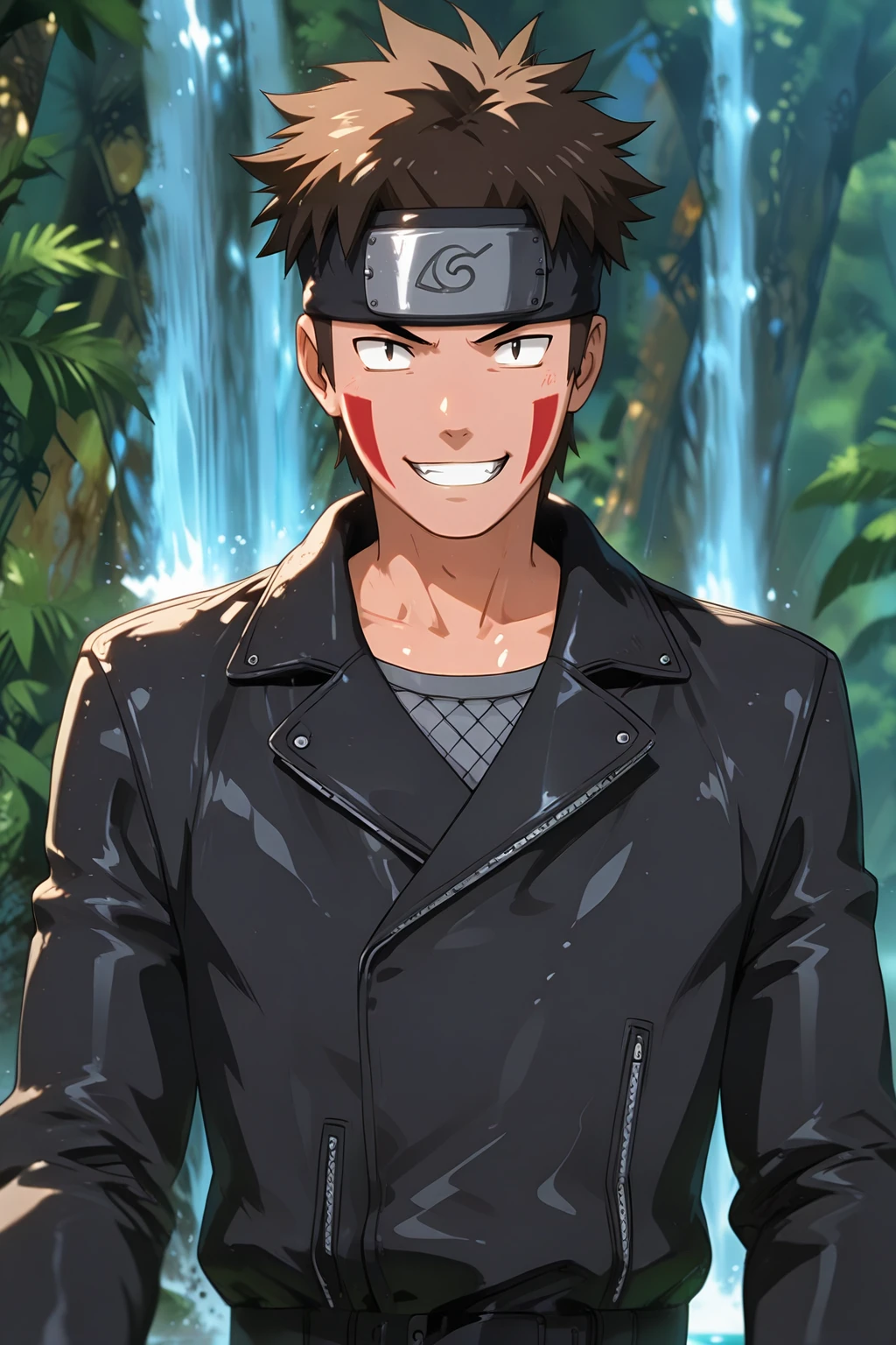 KibaInuzuka, brown hair, black slit pupils, red face markings, forehead protector,