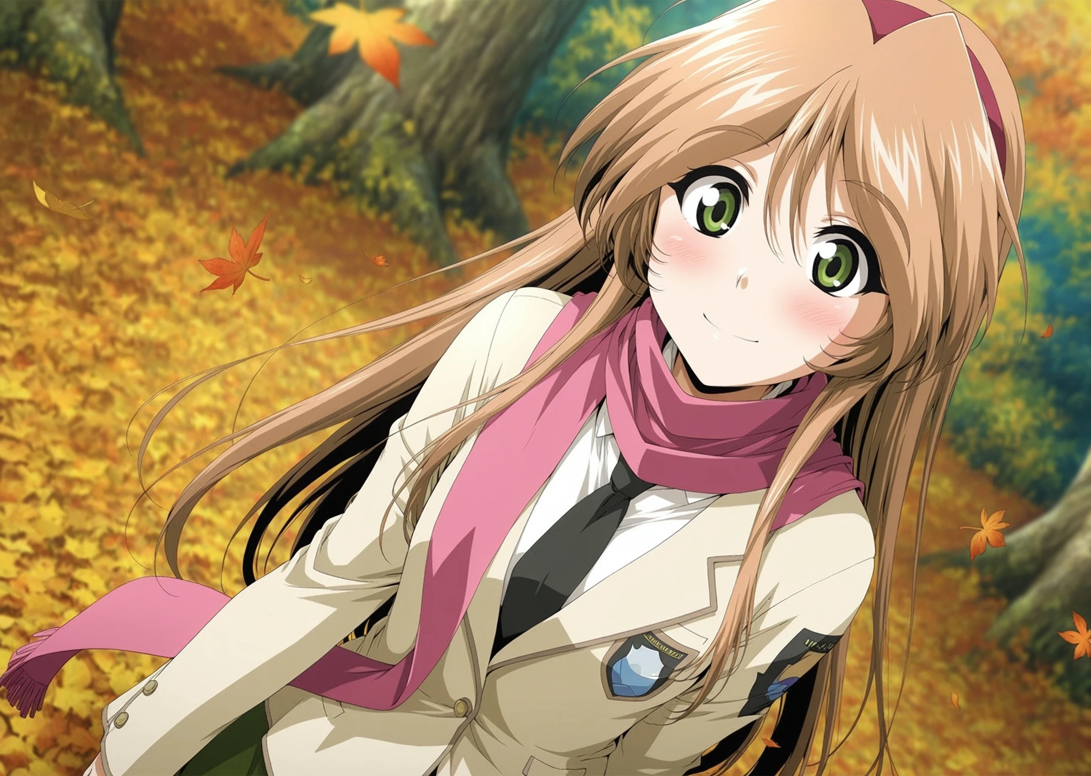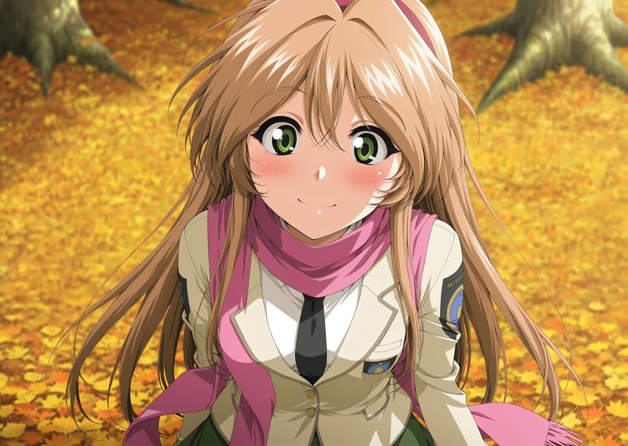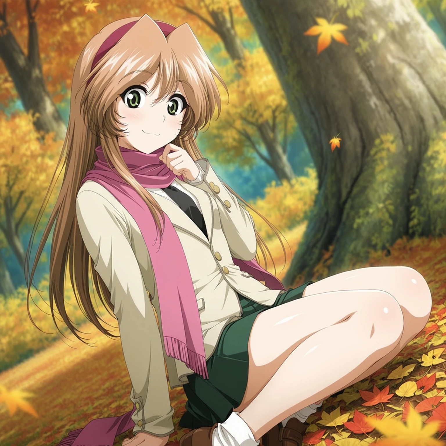 black necktie,beige blazer,emblem,green skirt,pink scarf,long scarf,smile,scarf over ,brown footwear,white ankle socks