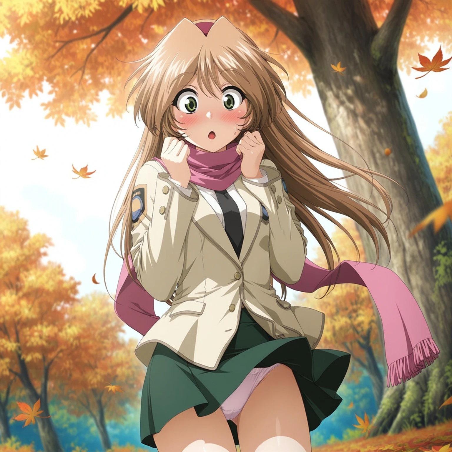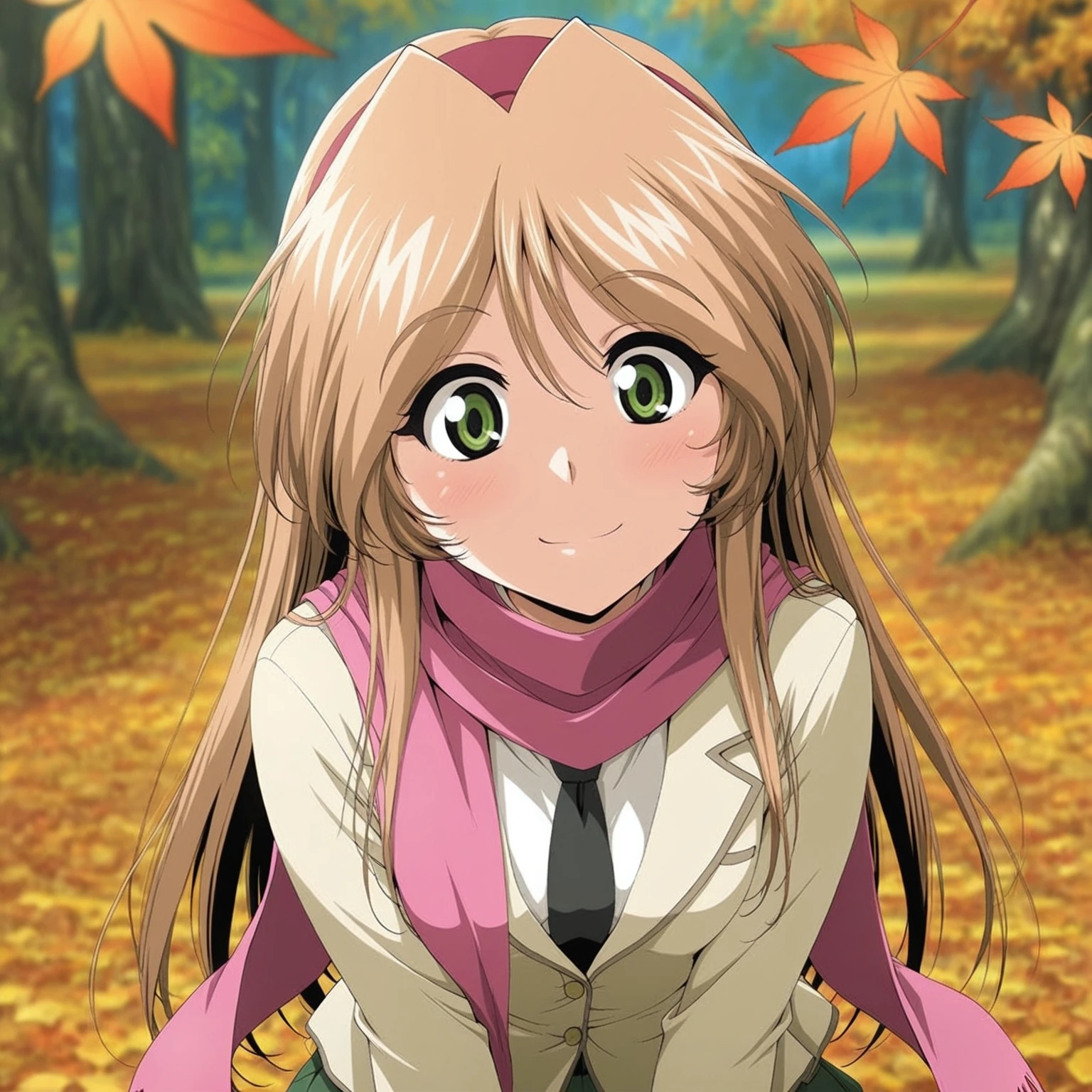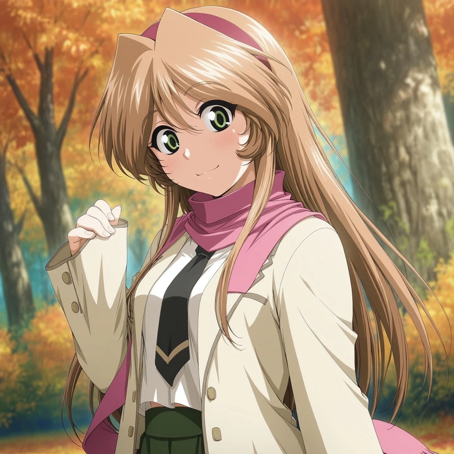 black necktie,beige blazer,emblem,green skirt,pink scarf,long scarf,smile,scarf over ,brown footwear,white ankle socks