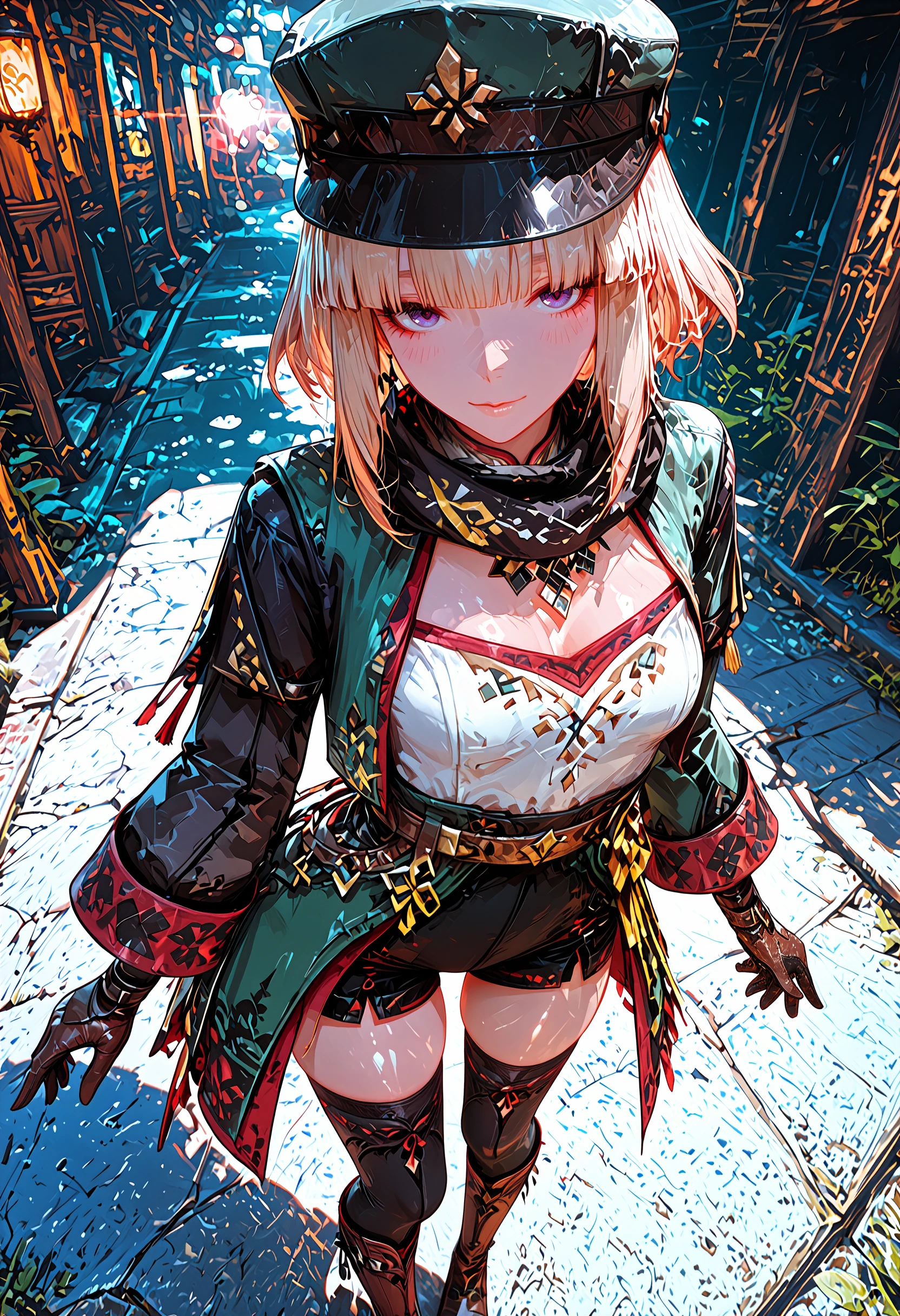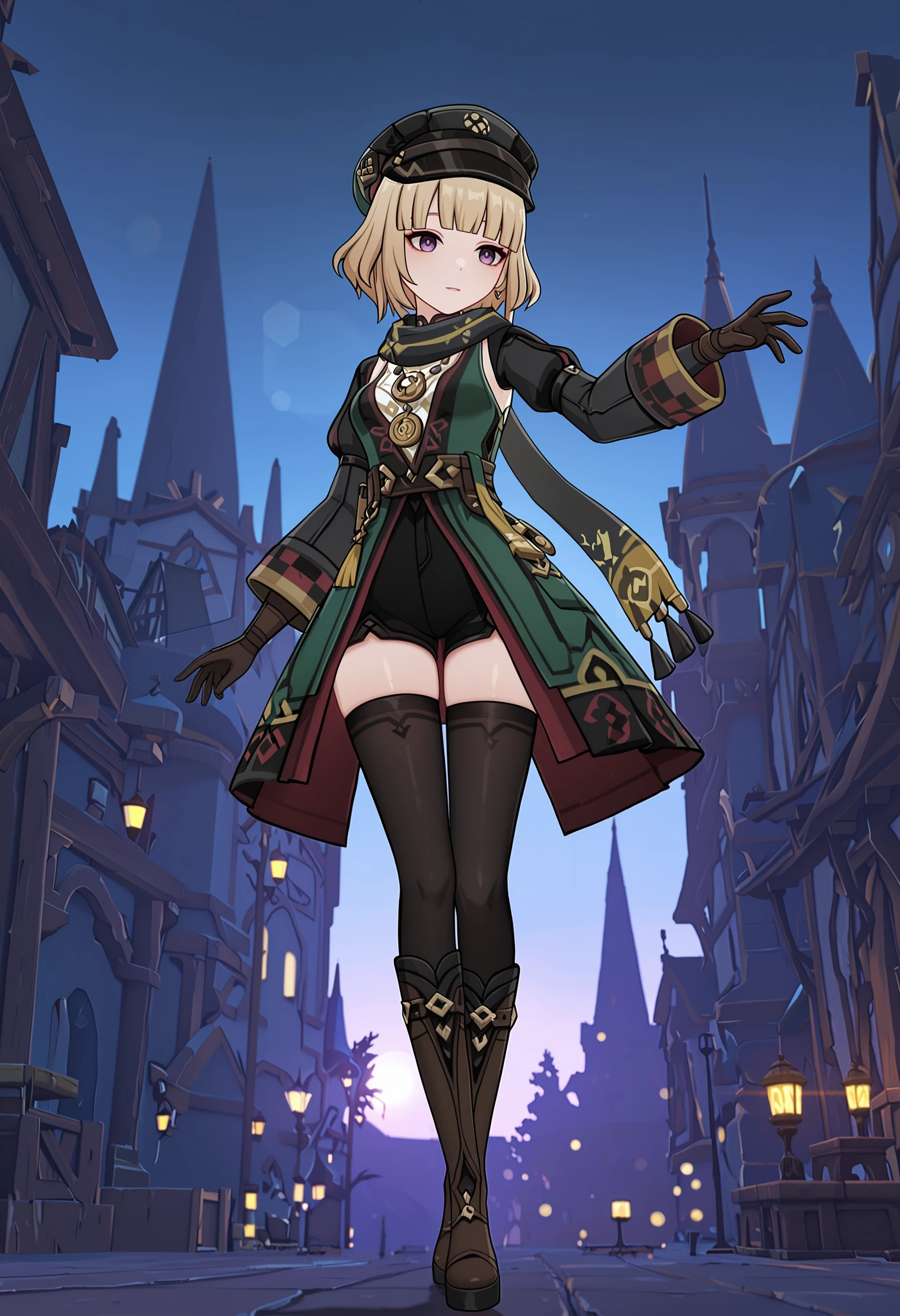 brown gloves, black shorts, black thighhighs, peaked cap, scarf, neckerchief, medallion, uniform, two-tone coat, grey coat, green coat, checkered trim, long sleeves, knee boots, brown boots, belt,