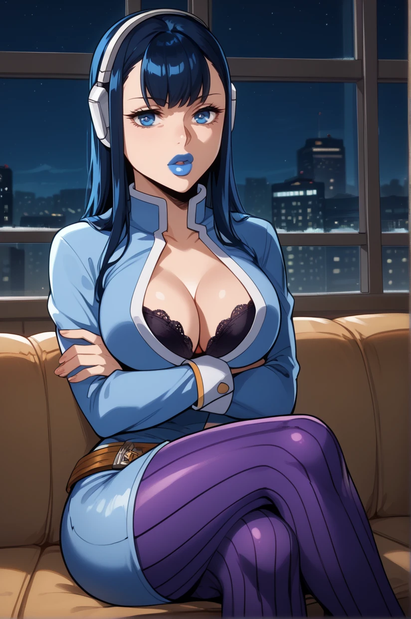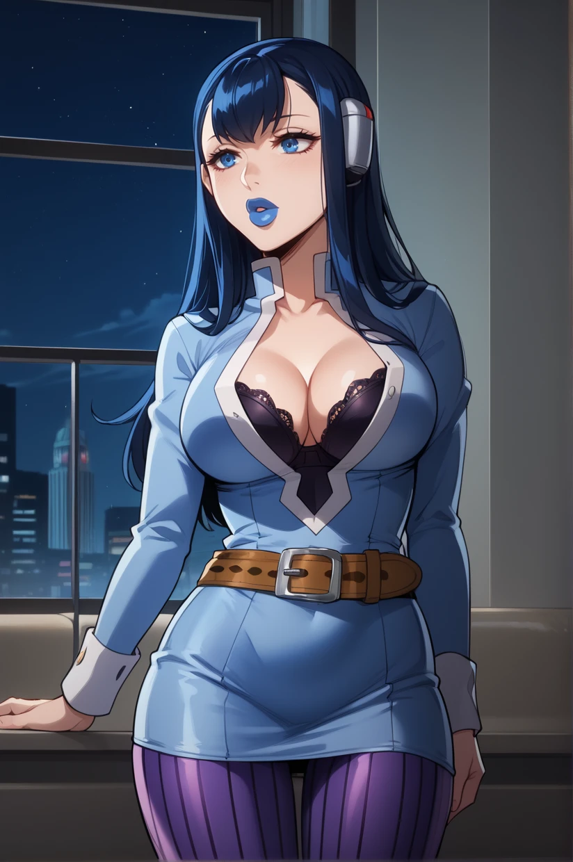 cleavage, black bra, blue dress, bodysuit, open clothes, headphones,  purple pantyhose, belt, striped pantyhose, high heels, purple footwear