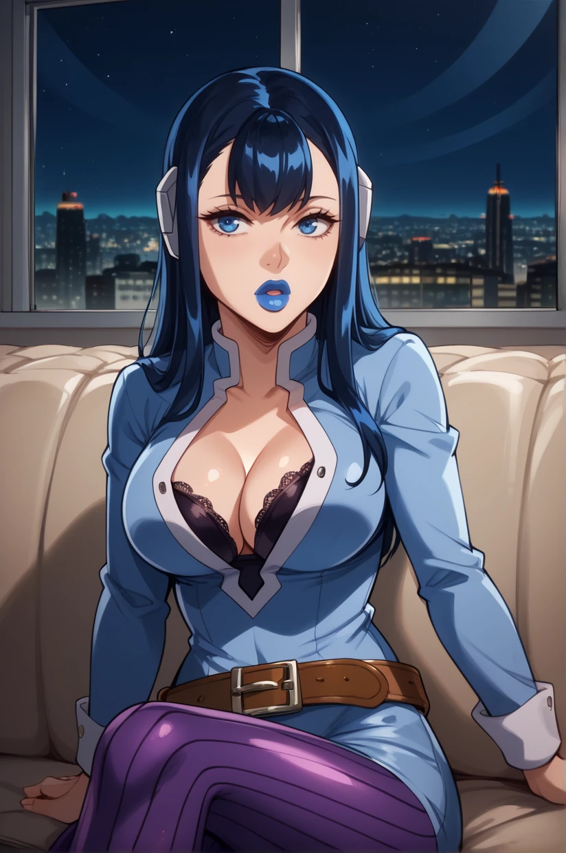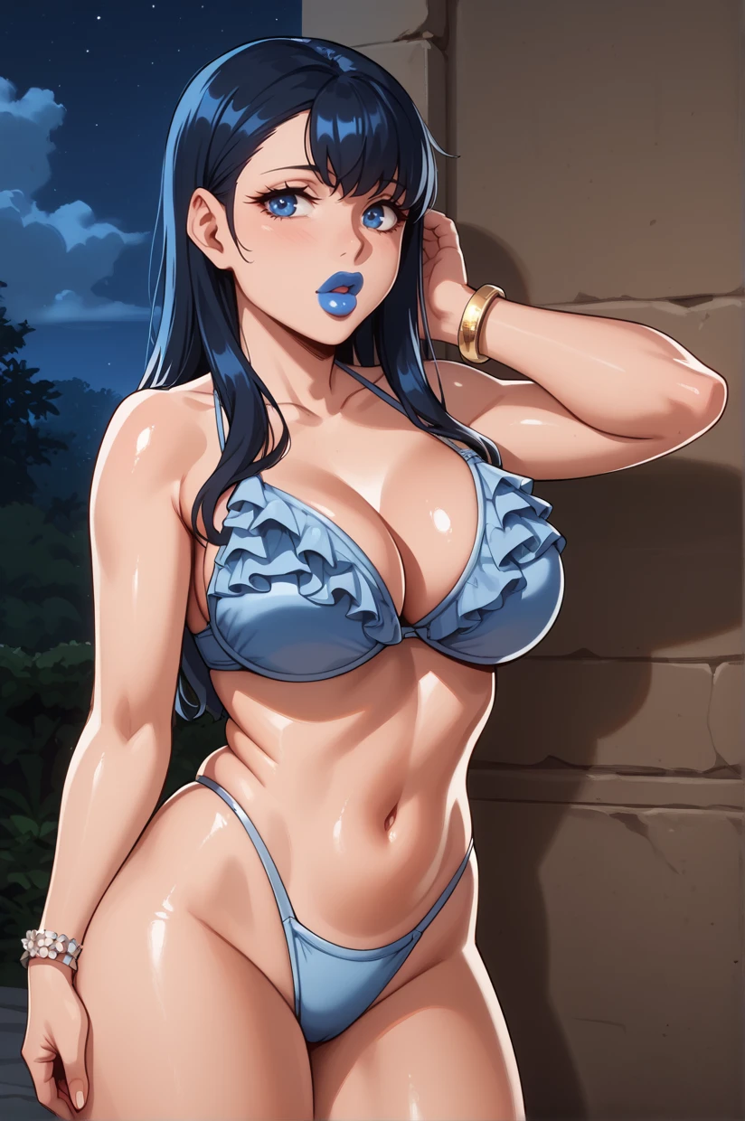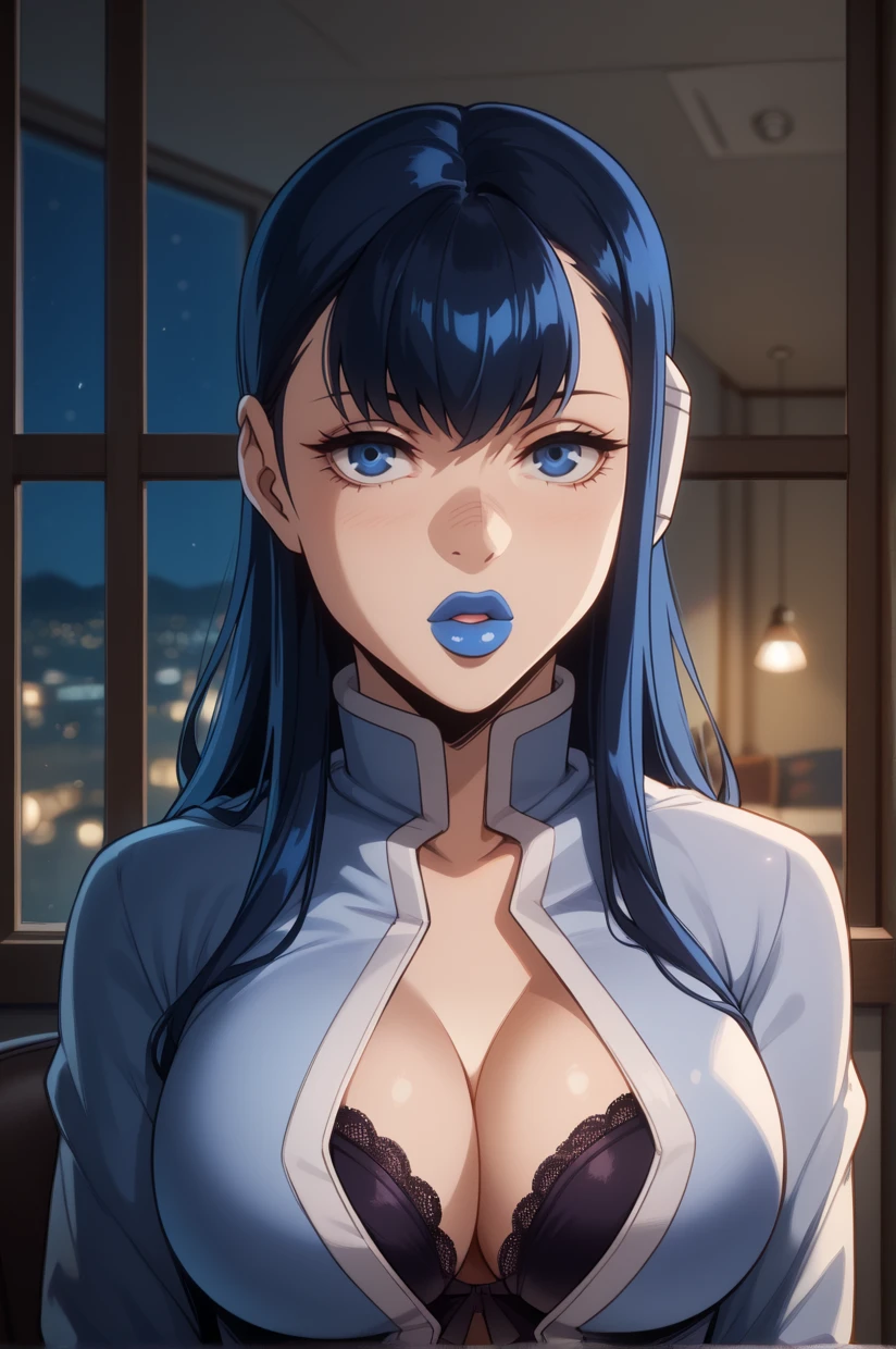 long hair, black hair, blue hair, blue eyes, makeup, blue lipstick, large breasts