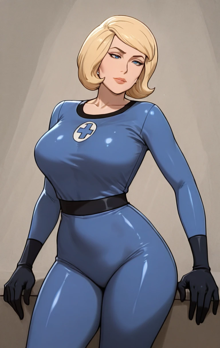 1girl, solo,breasts, short hair, blonde hair, gloves, medium breasts, blue eyes, black gloves,blue jumpsuit, bodysuit,sus4nst0rm