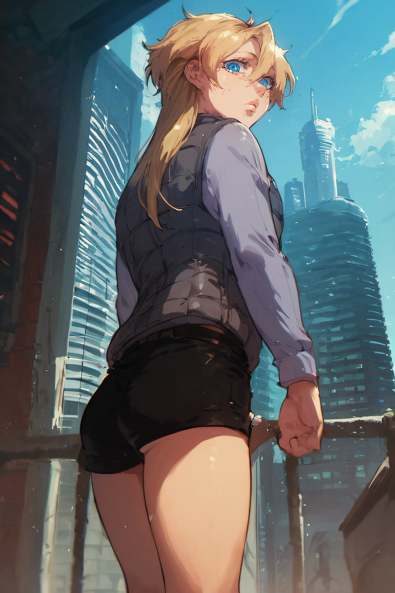 grey shirt, long sleeves, short shors, black shorts, boots, vest