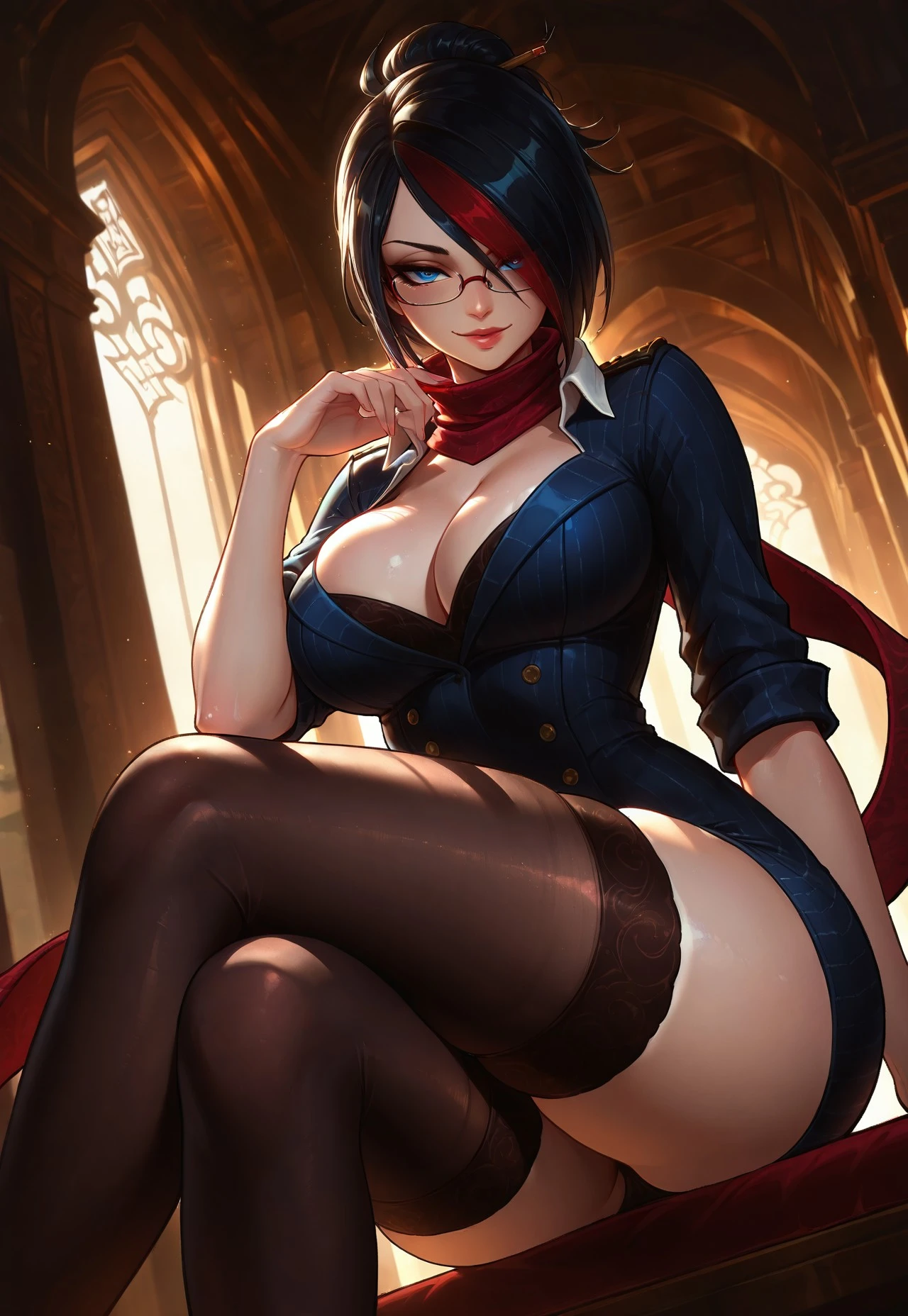 HMfiora,black hair,red strand,multicolored hair,eyewear,blue eyes,scarf,cleavage,,stockings,uniform,