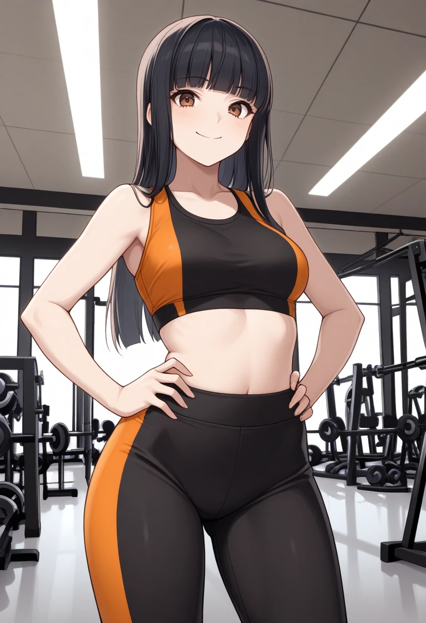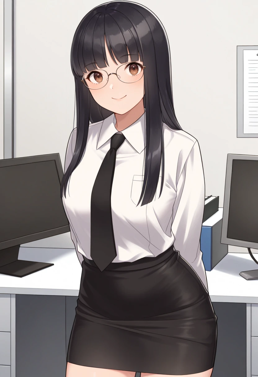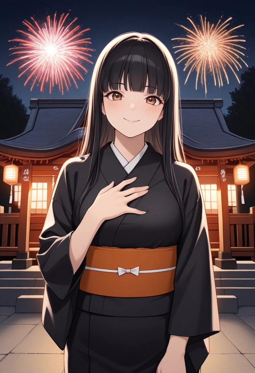 m1y4bip2, black hair, long hair, blunt bangs, black school uniform, turtleneck, ribbon, black skirt