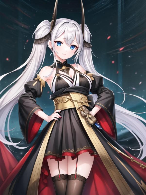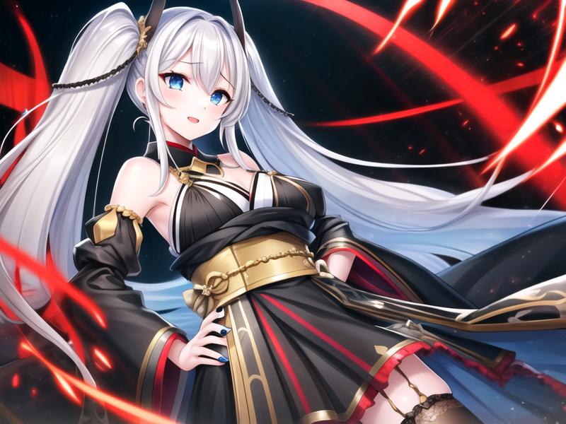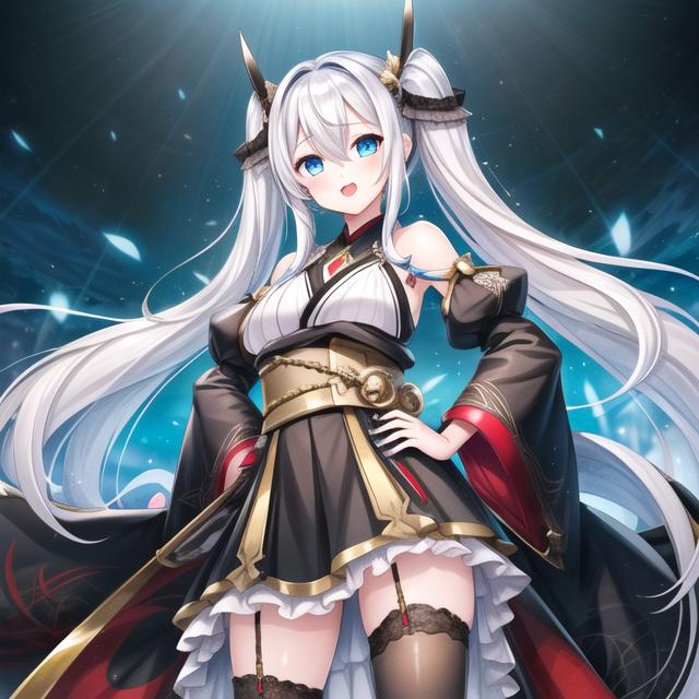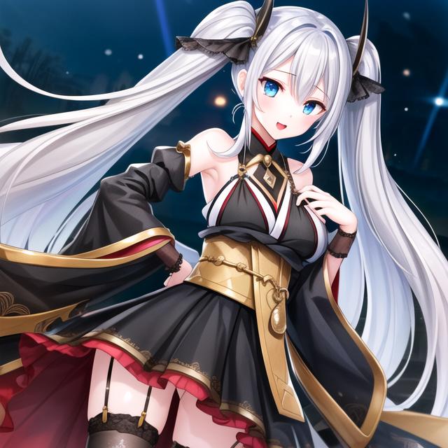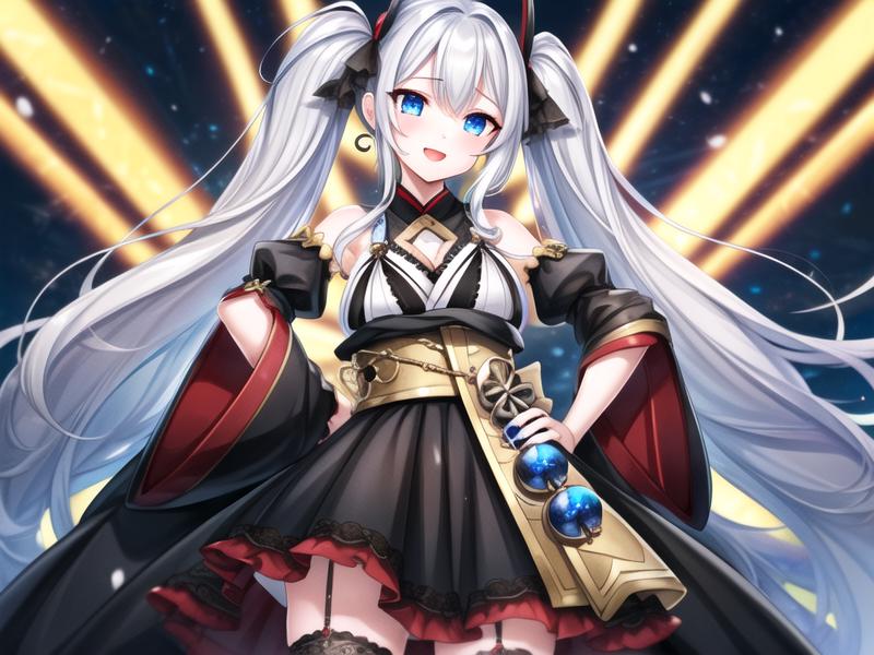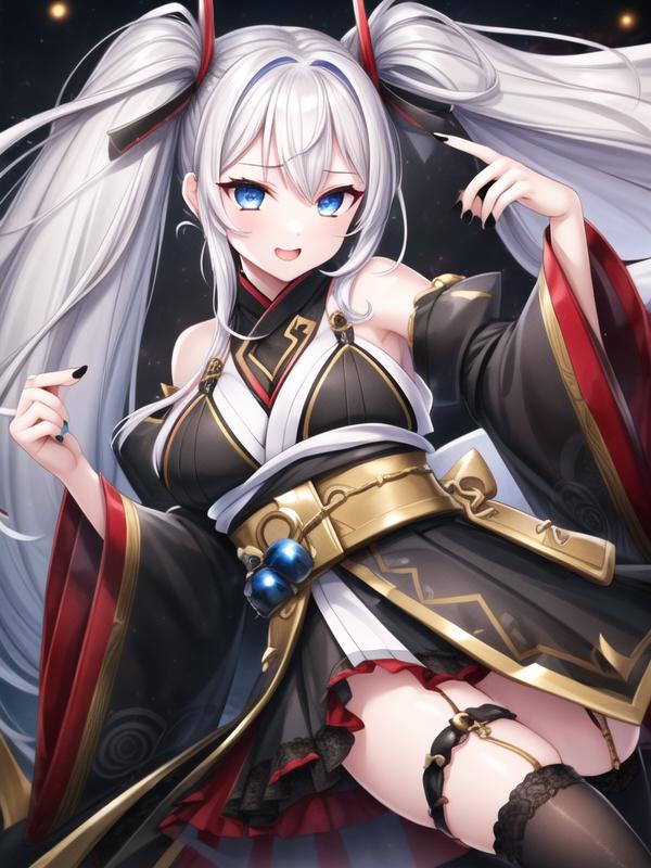 Urayodo,twintails, blue eyes,white hair,hair ornament, black nail, black dress,wide sleeves, black thighhighs,