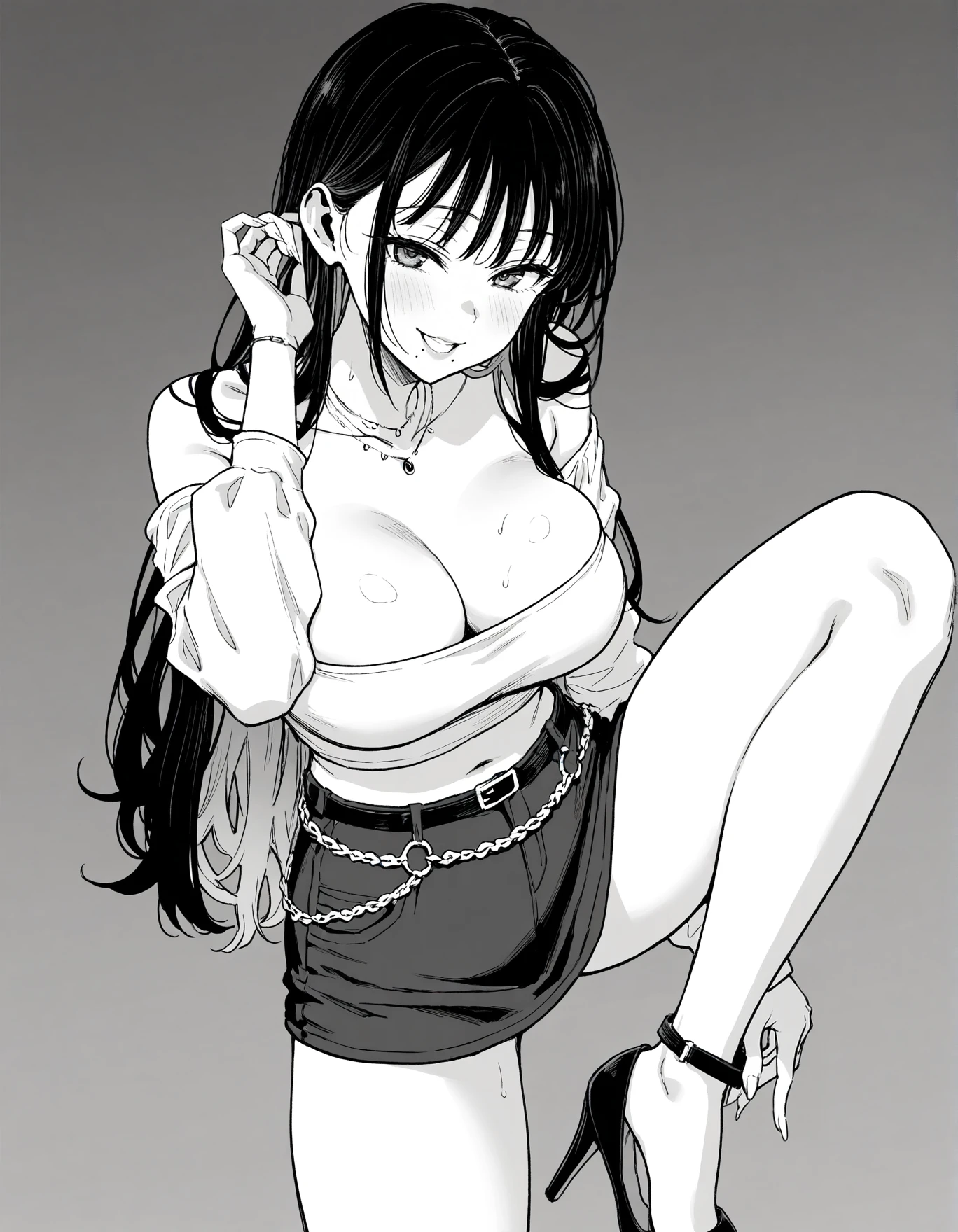 runateikoku, long hair, multicolored hair, mole under mouth, bandeau shirt, shite shirt, long sleeves, bare shoulders, pencil skirt, black skirt, belt, heels, necklace,