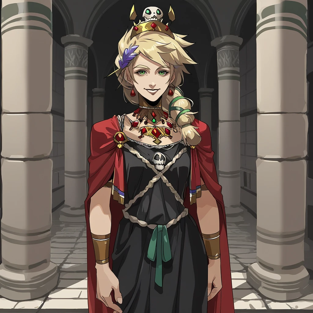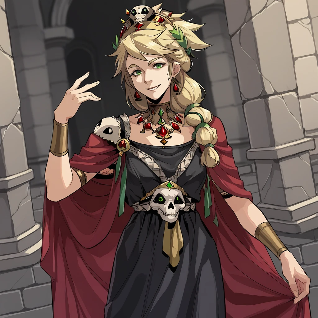 greek clothes, skull crown, black dress, red cape, gold accents, jewellery