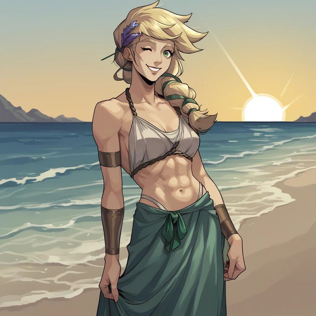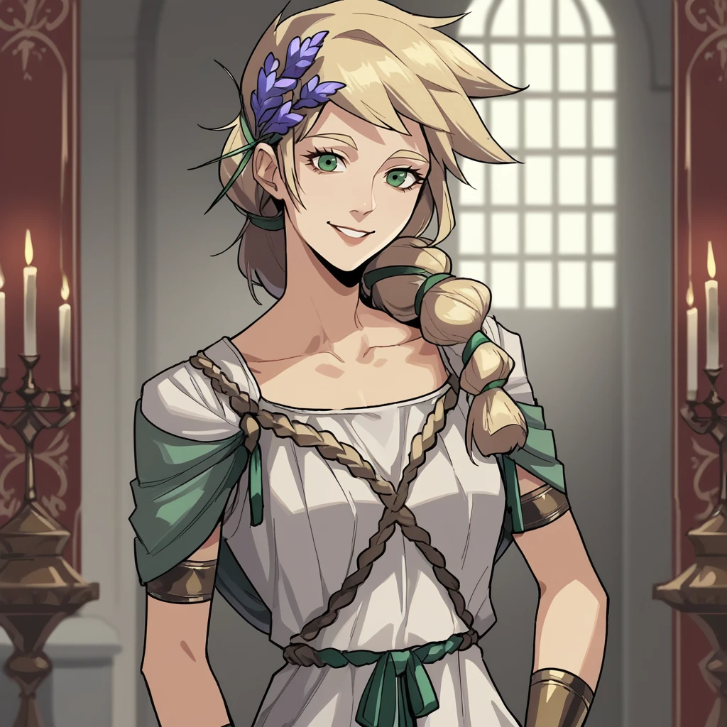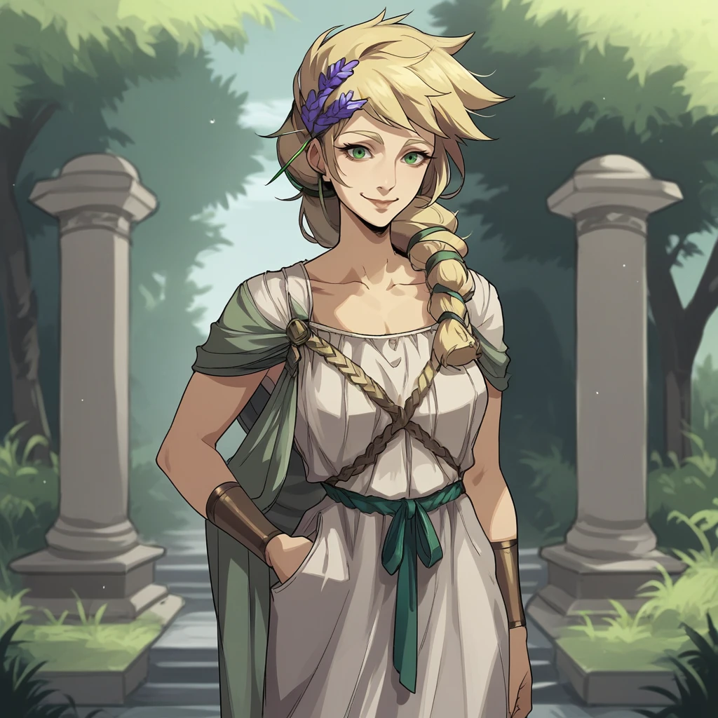 green eyes, blonde hair, braided ponytail, greek clothes, hair flower, white dress,