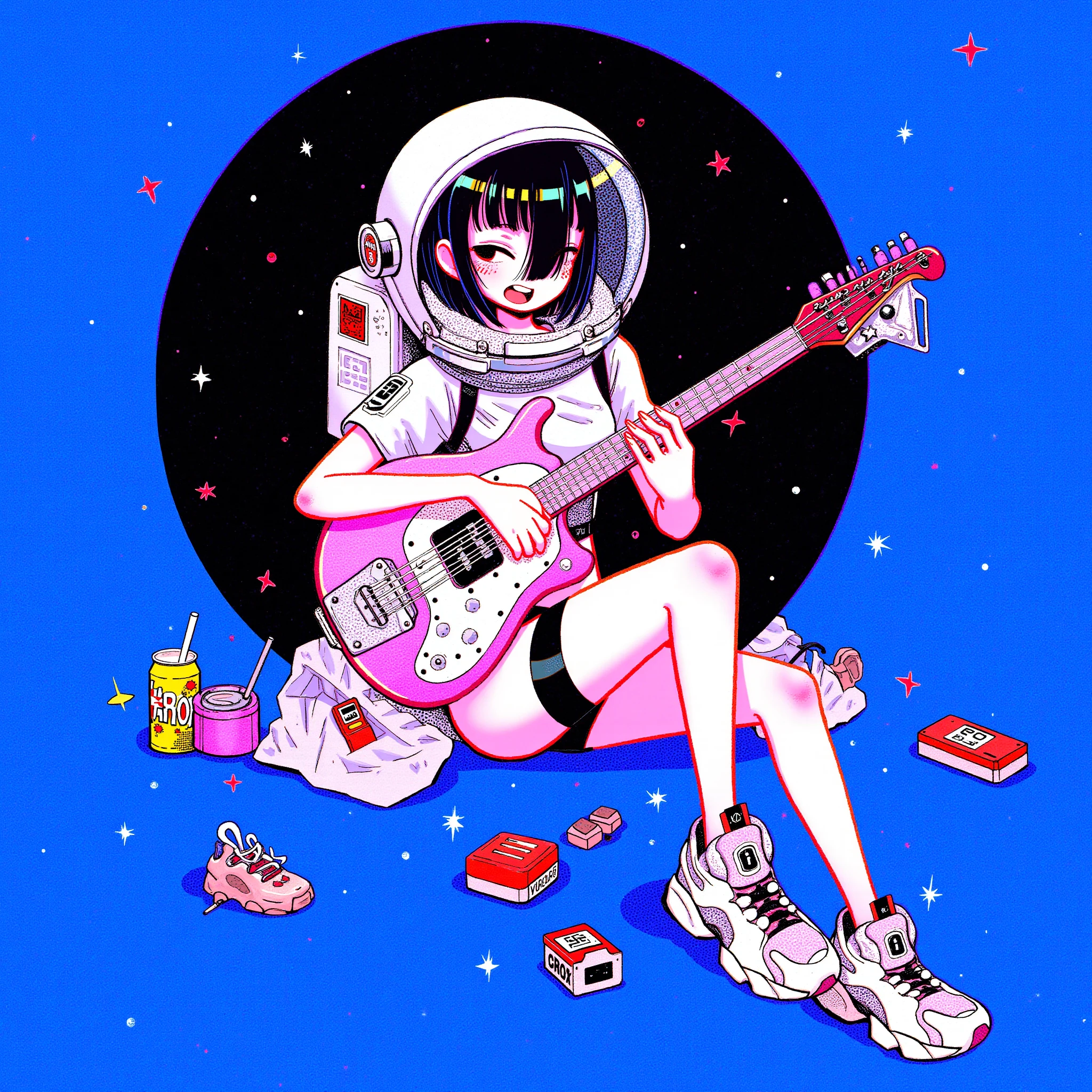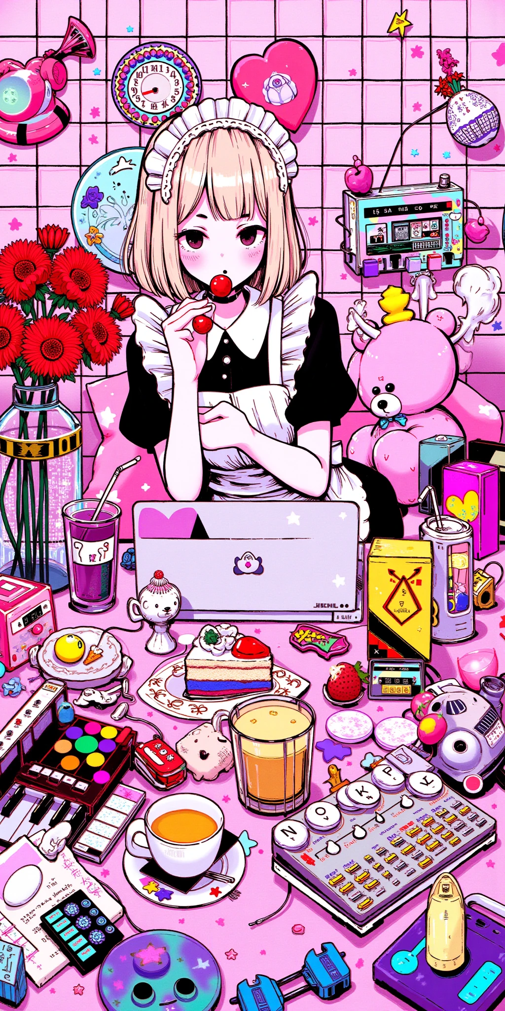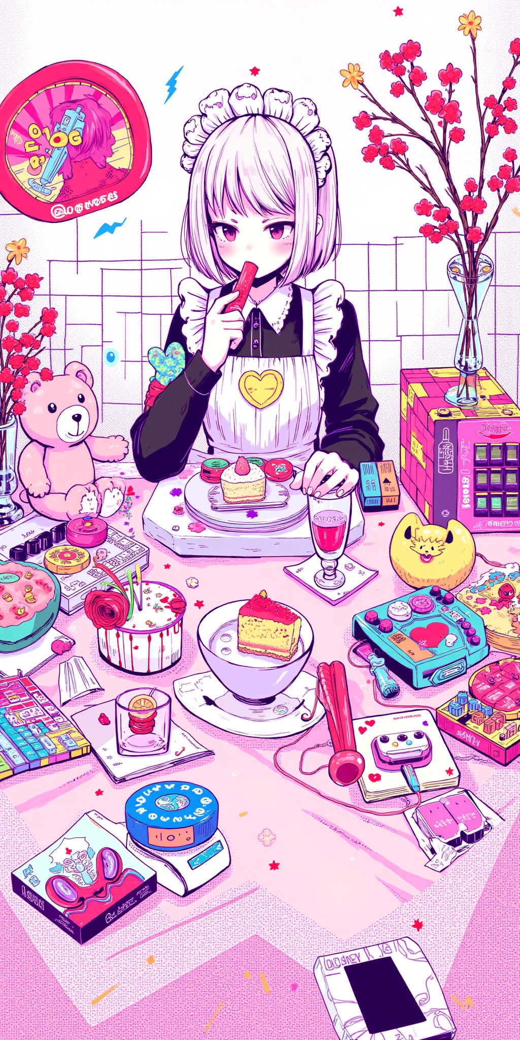 The illustration style is reminiscent of modern anime and manga, with bold lines and vivid colors, and the overall composition is dynamic, with a mix of playful and edgy elements. The scene is filled with a sense of youthful exuberance and nostalgia for retro gaming.