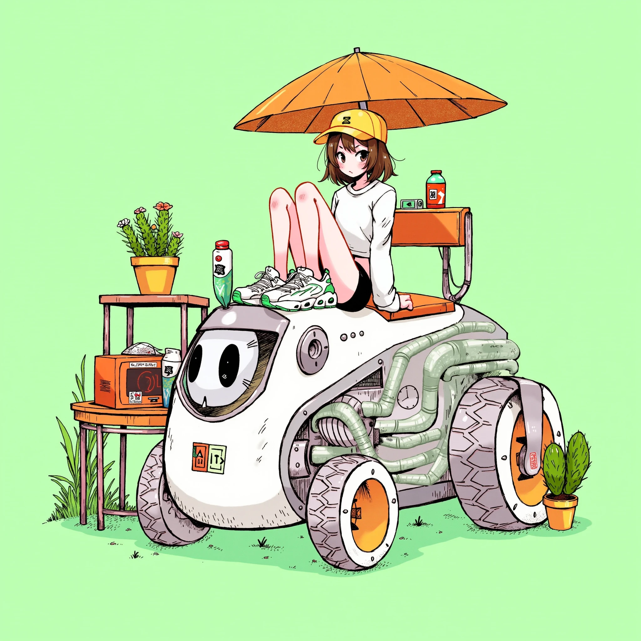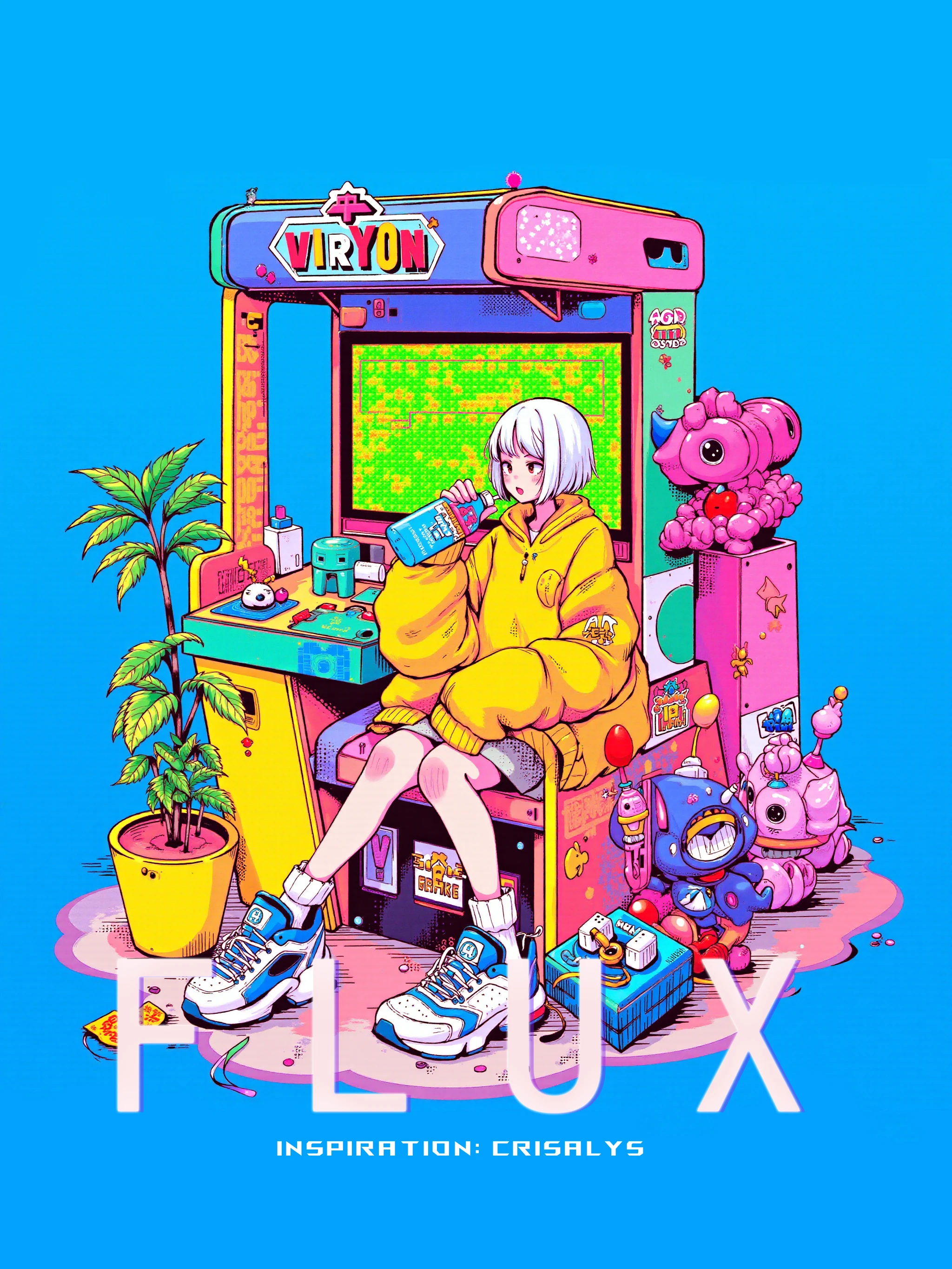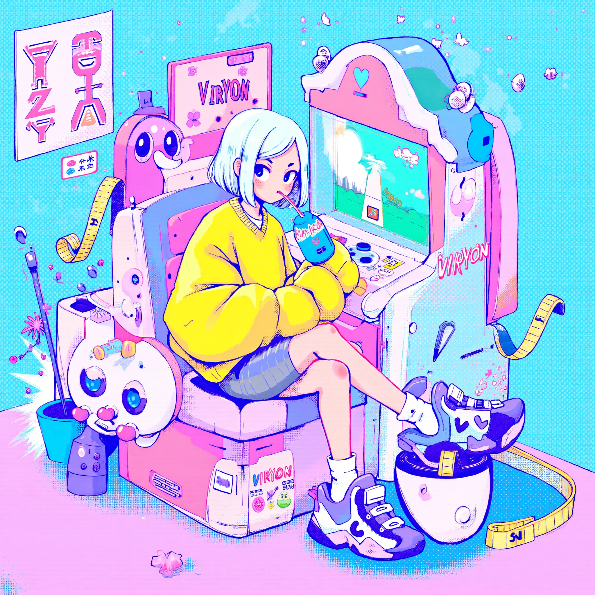 Tangguo_style_01,This is a vibrant, digitally rendered illustration featuring a young woman with pale skin, short white hair, and a youthful appearance. She is seated in a futuristic, brightly colored arcade game booth, labeled "VirYON." Her attire includes a yellow oversized jacket, a grey skirt, and white socks with blue sneakers. She holds a blue milk bottle with a straw, sipping casually while engaged in the game. The arcade game screen displays a pixelated, retro-style game with a green and yellow color scheme.