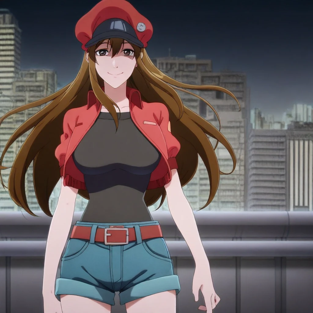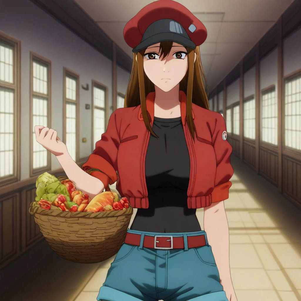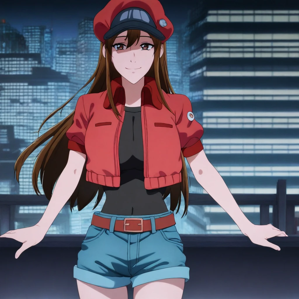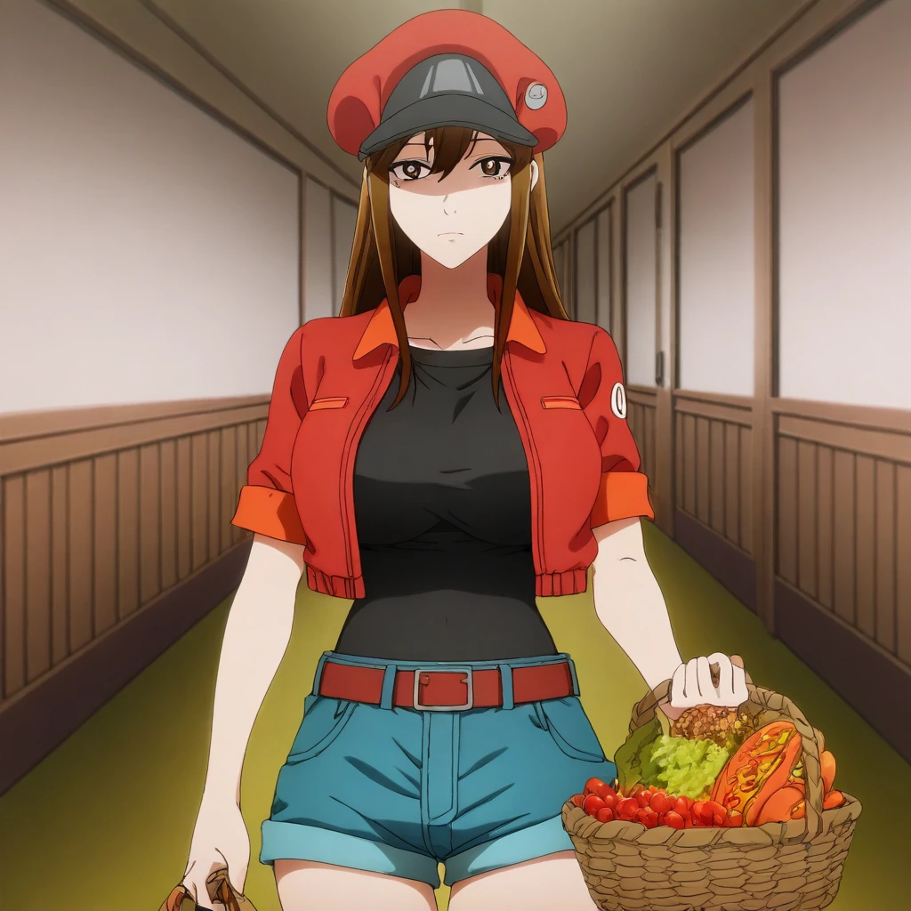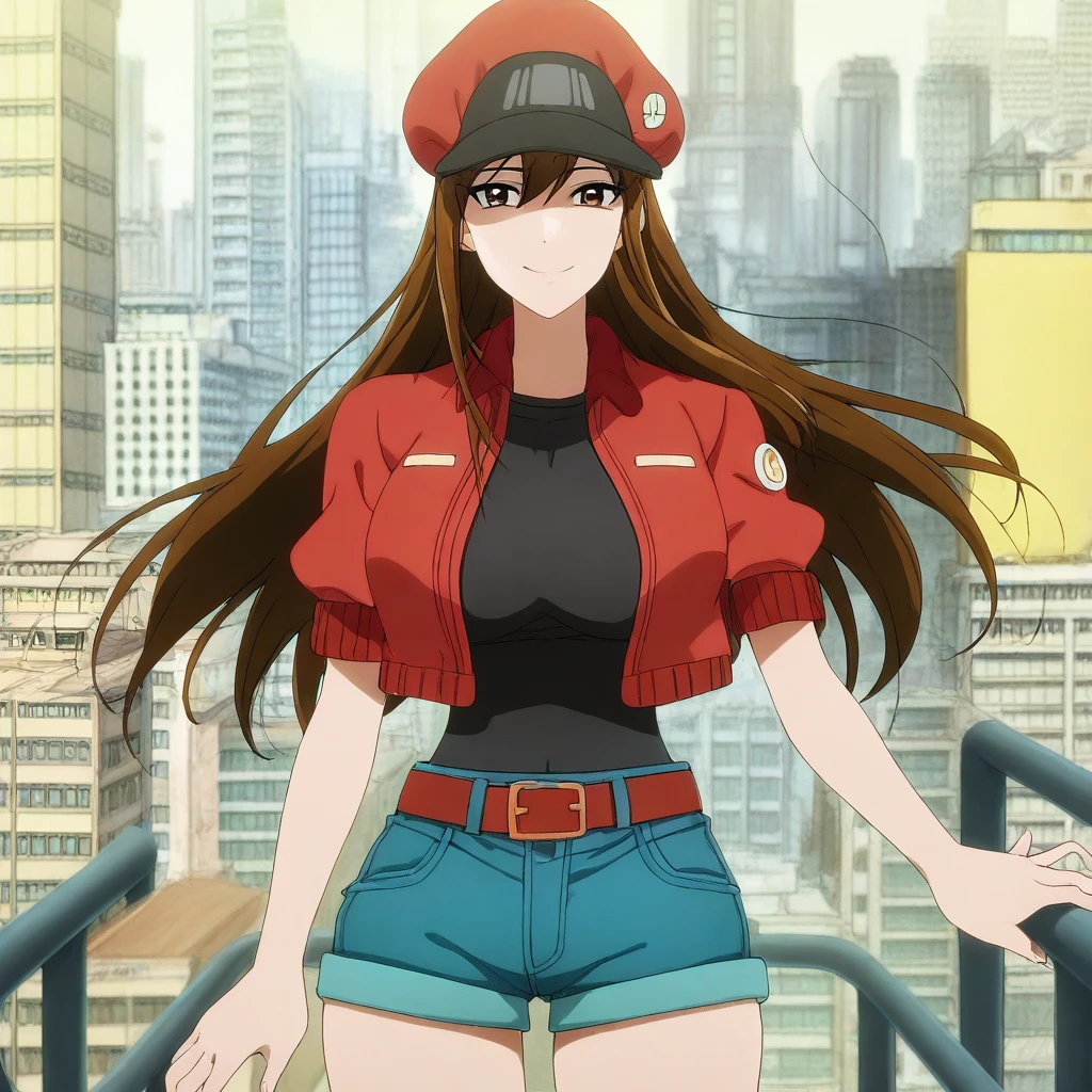 red cabbie cap, badges, red crop-top jacket, short-sleeves, black undershirt, belt, belt buckle, blue denim shorts,