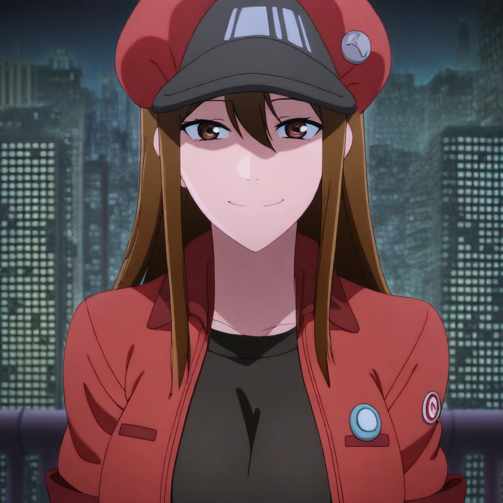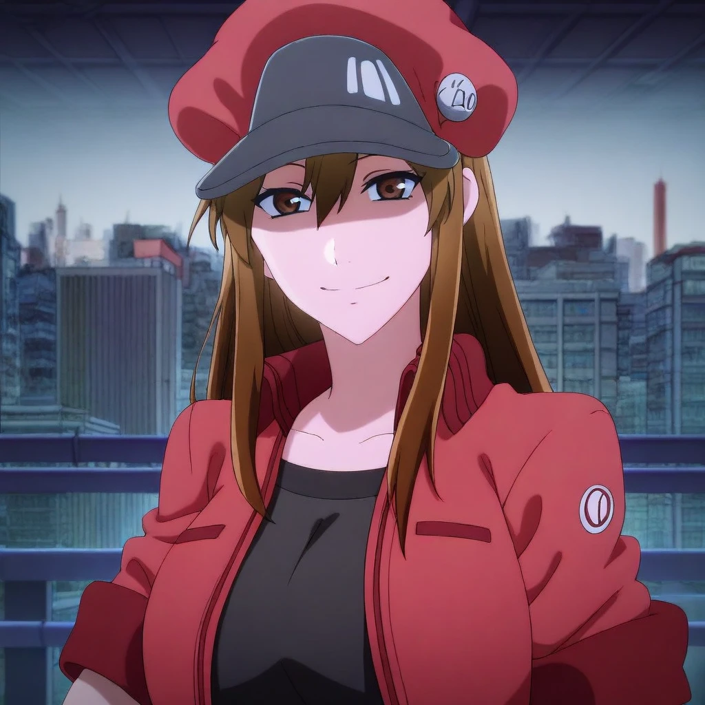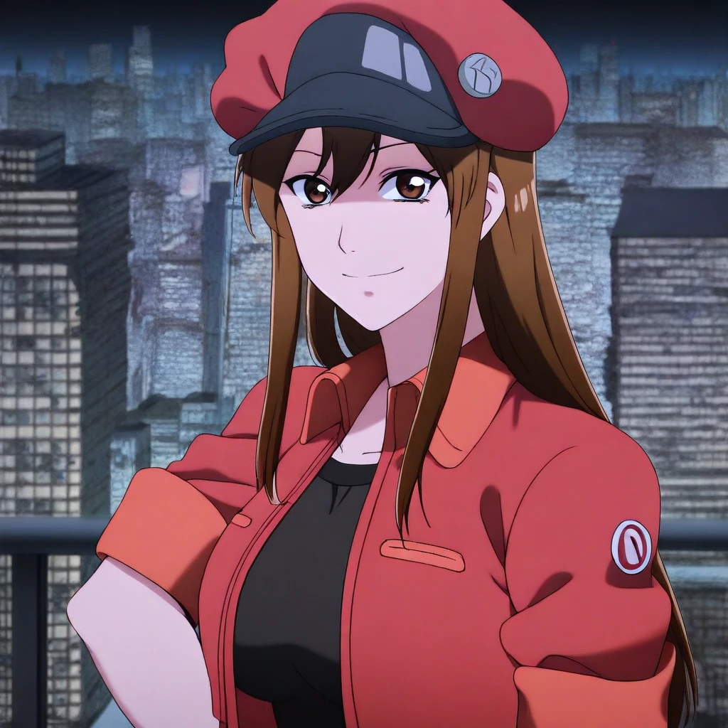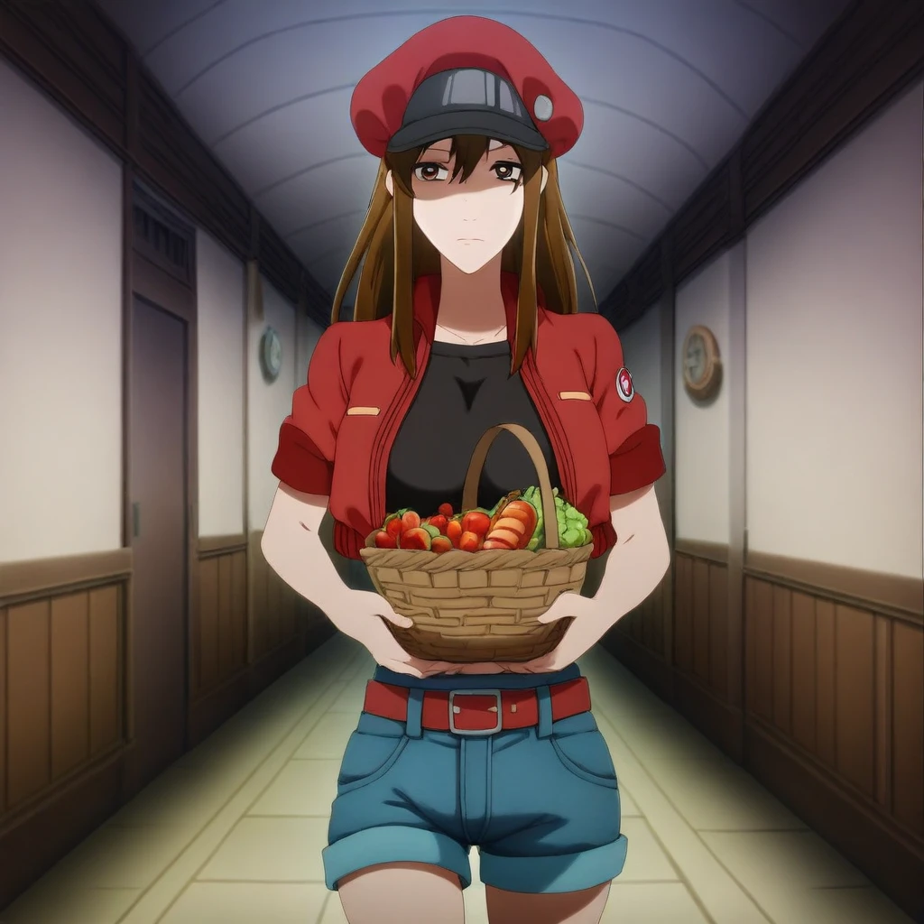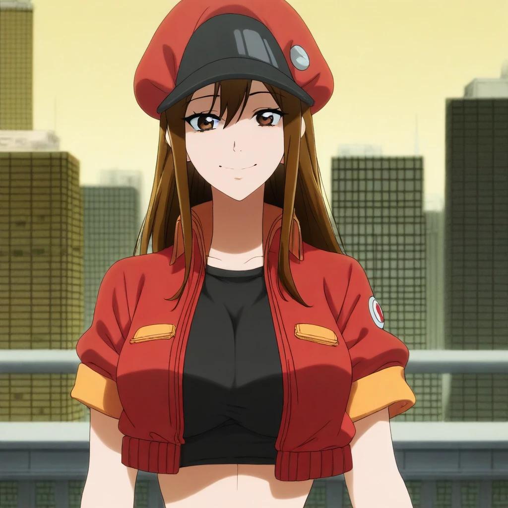 red cabbie cap, badges, red crop-top jacket, short-sleeves, black undershirt, belt, belt buckle, blue denim shorts,