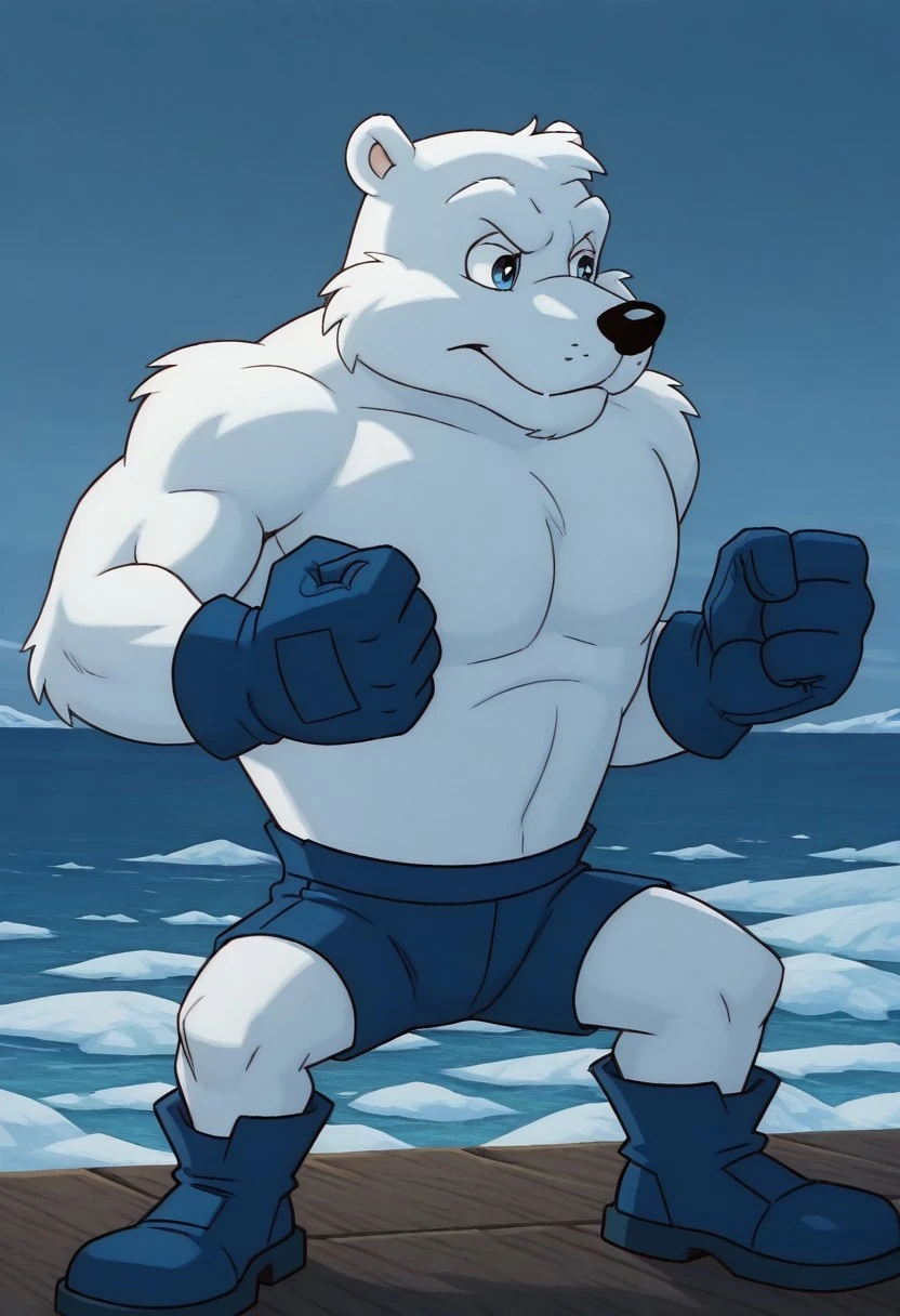 Augustus the Polar Bear, white fur, blue eyes, black nose, buff, muscular, blue shorts, blue gloves, blue boots