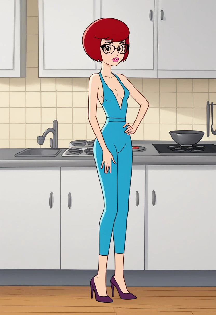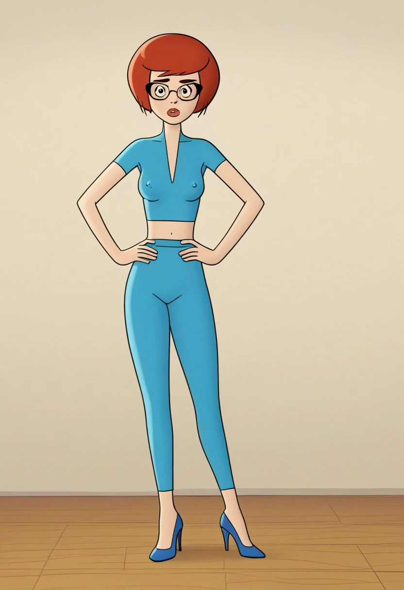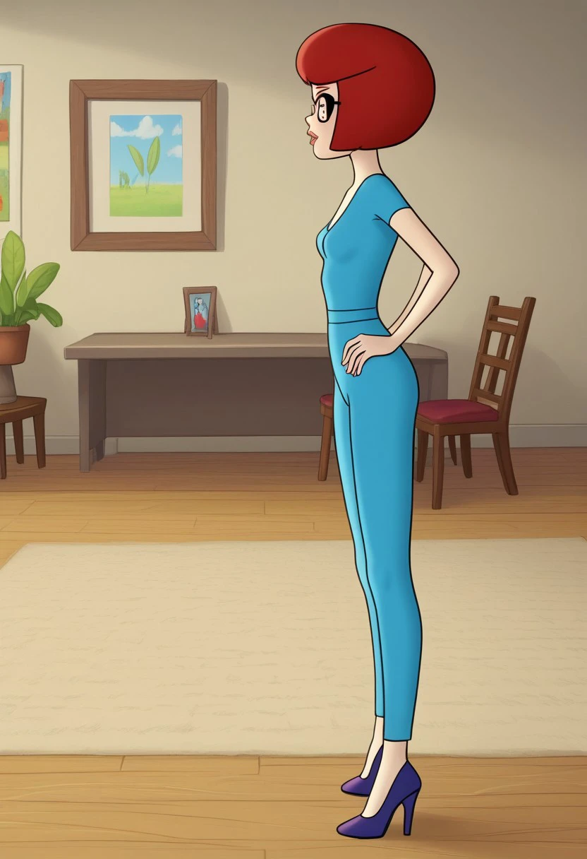 solo focus, short red hair bob cut, uncle fyodor's mother, rimma, cateye glasses, prostokvashino, blue tight bodysuit, blue high heels
