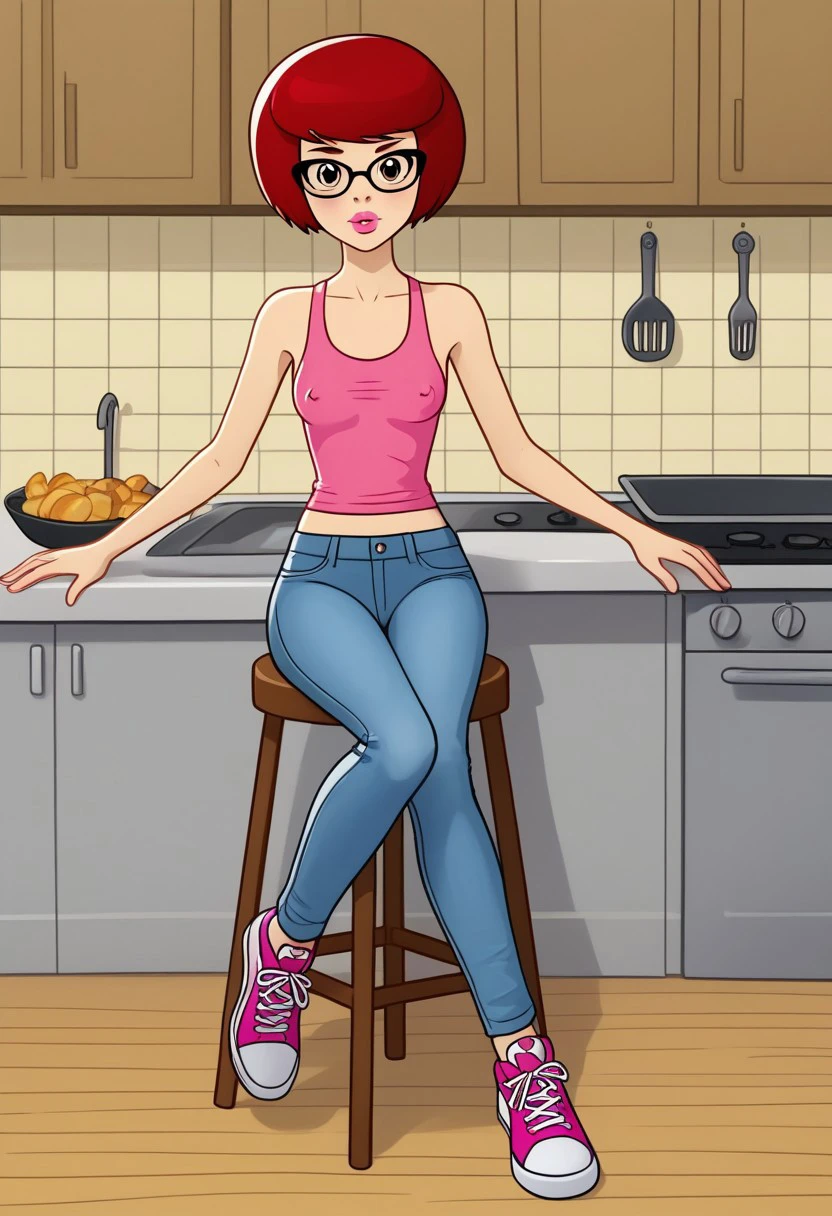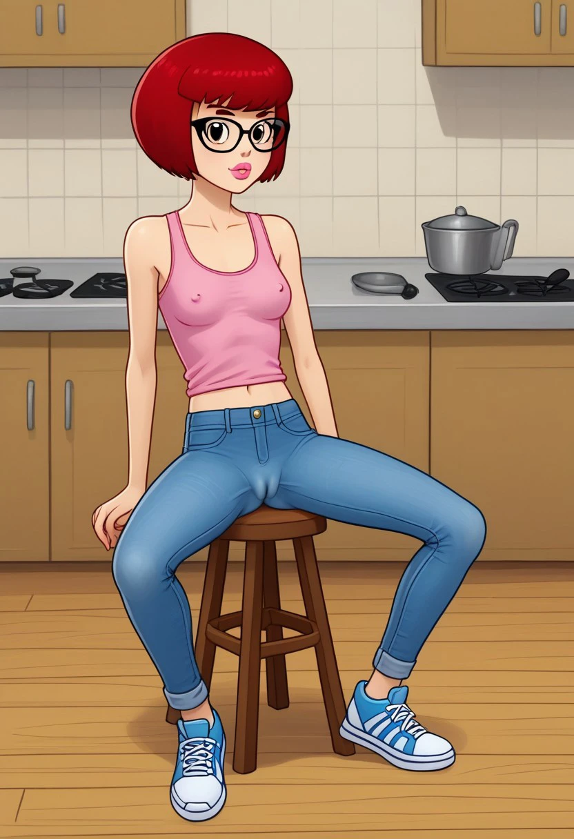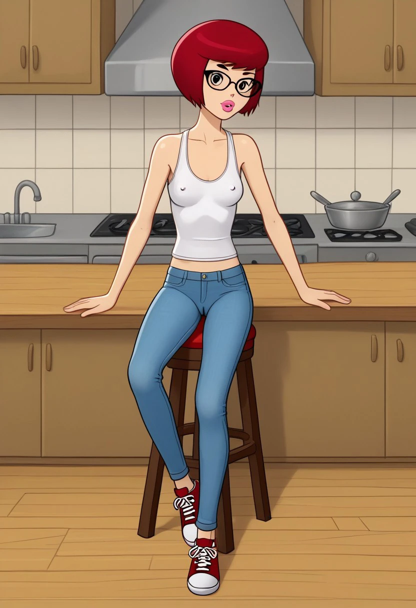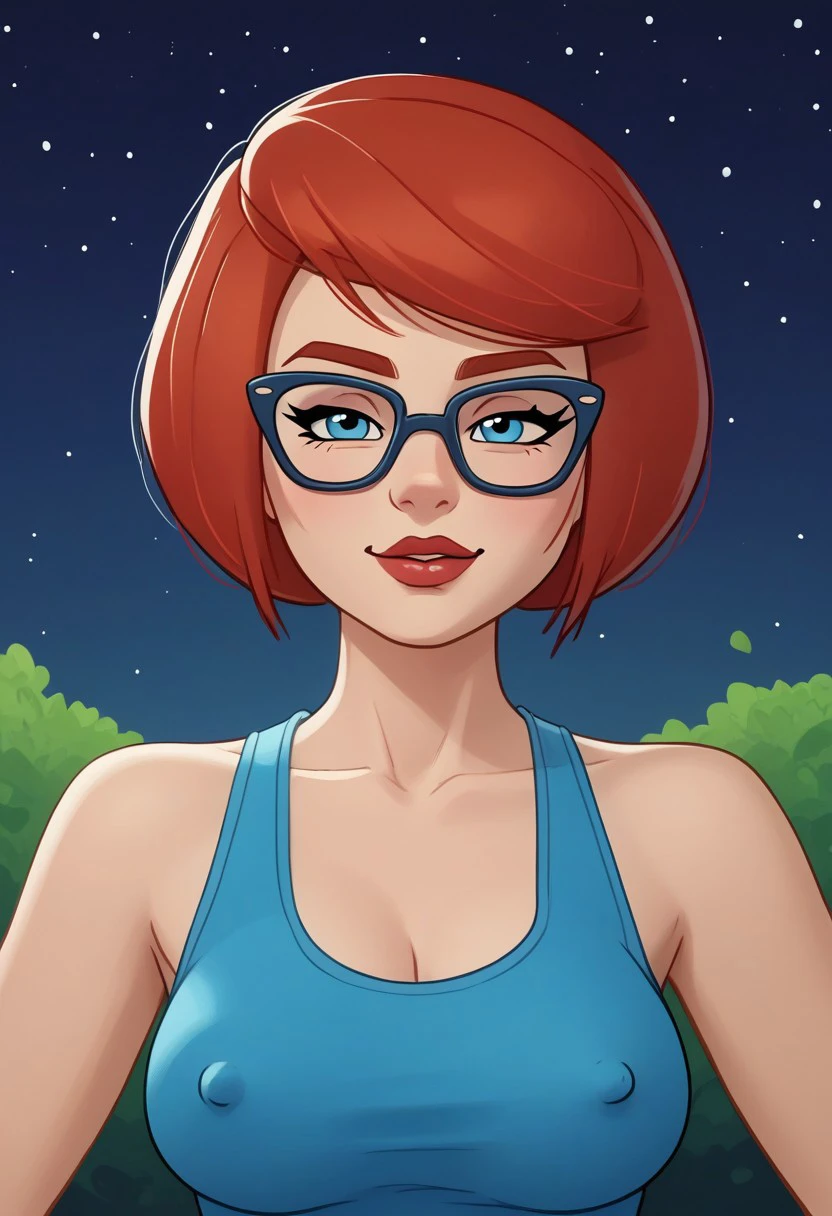 solo focus, short red hair bob cut, uncle fyodor's mother, rimma, cateye glasses, prostokvashino, blue tight bodysuit, blue high heels