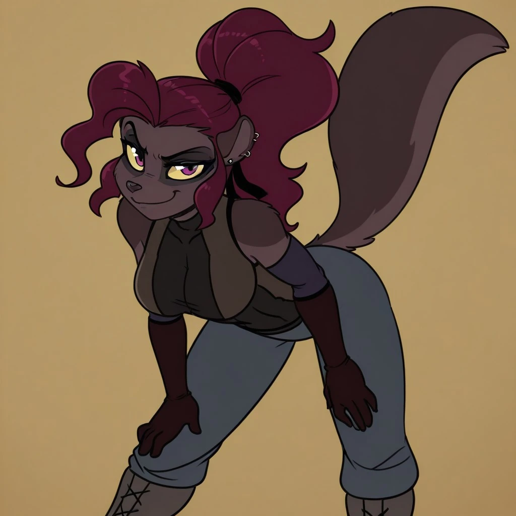 dante_j, furry, 1girl, solo, animal ears, furry female, breasts, purple eyes, tail, dark skin, jewelry, earrings, dark-skinned female, red hair, long hair, ponytail, colored sclera, yellow sclera,