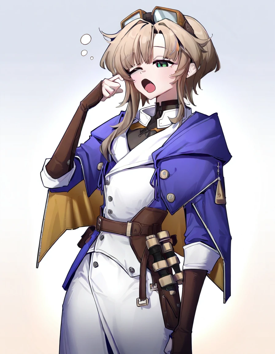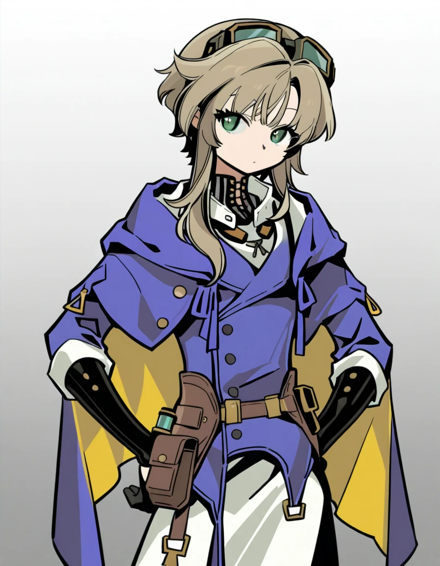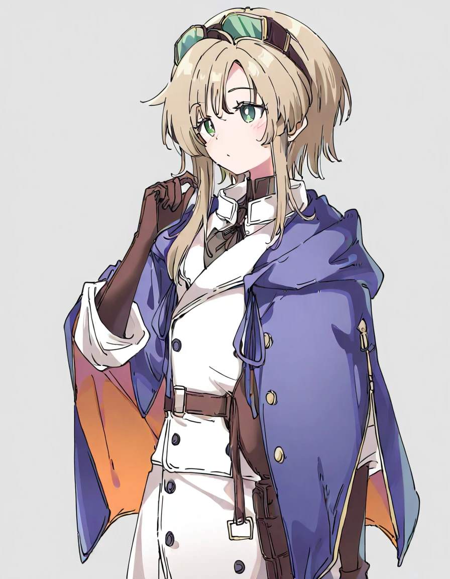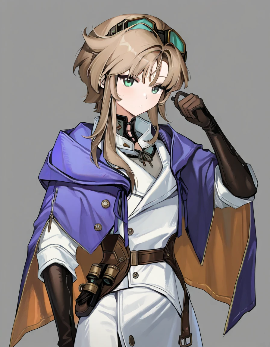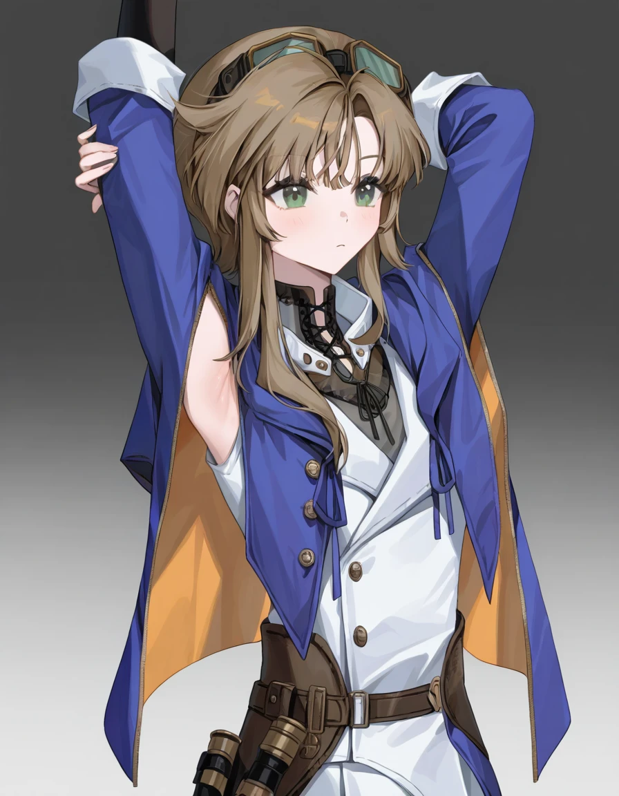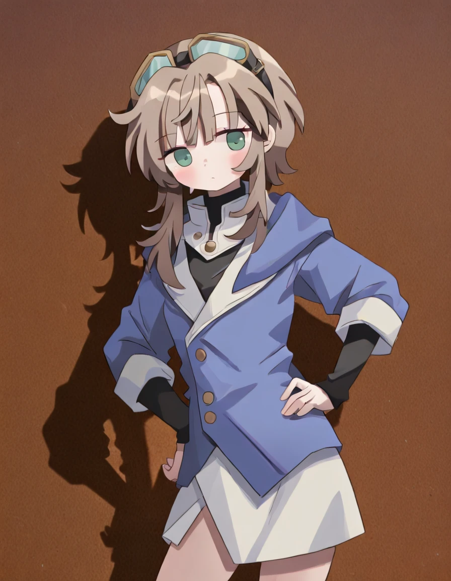 green eyes,shirt,blue jacket,dress,goggles on head,sidelocks,brown hair,short hair with long locks,long sleeves,