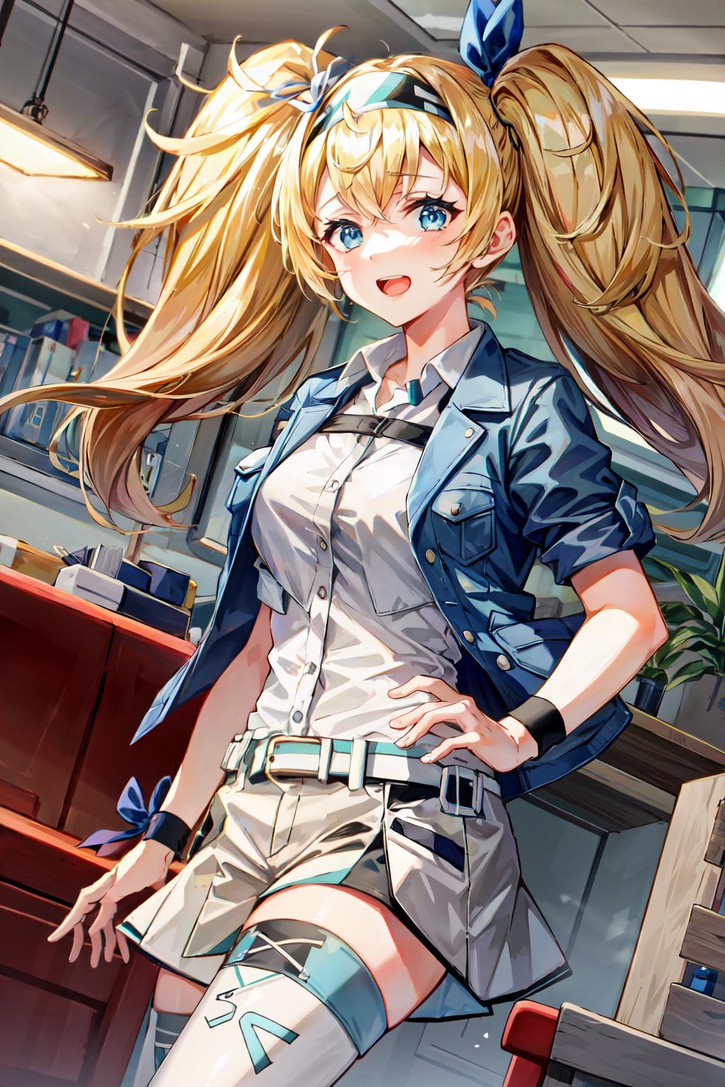 -thigh boots, (white) footwearGambierBaySanmaKC, (camouflage) hairband, (long sleeves) shirt, (white) shirt, (blue) jacket, (denim) shorts, shoes