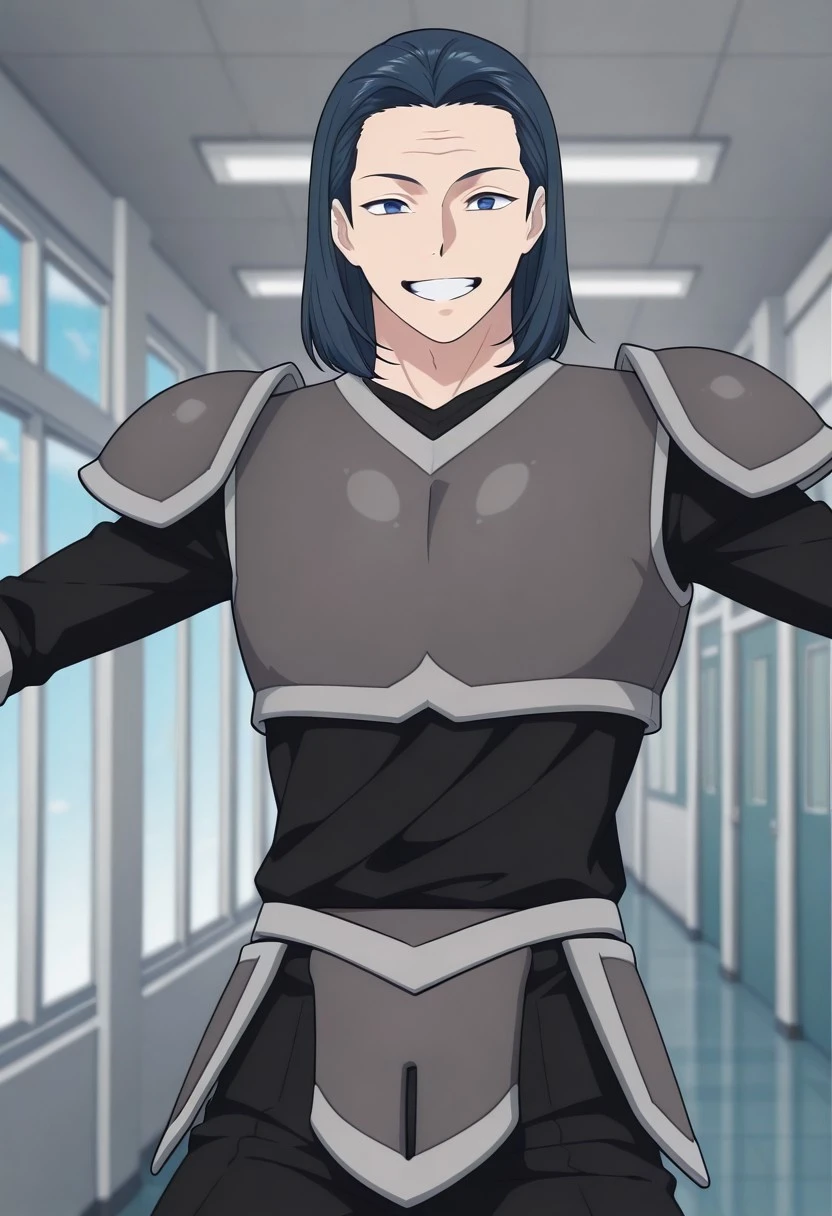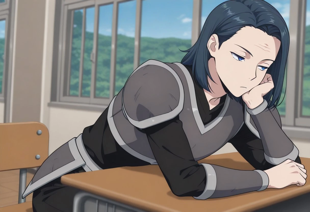 blue hair, medium hair, straight hair, blunt hair, hair slicked back off his forehead,