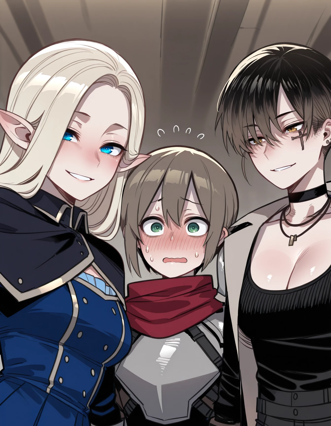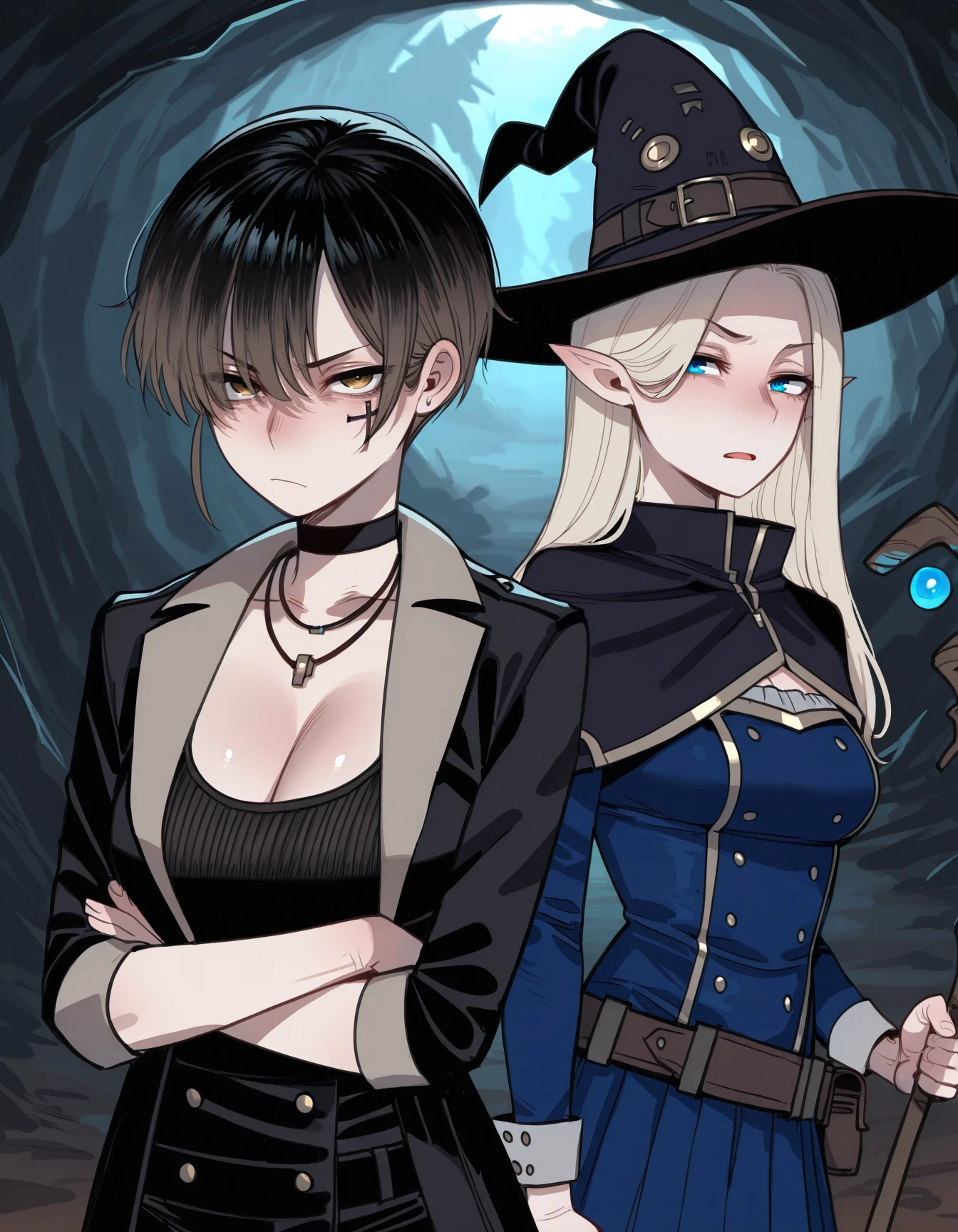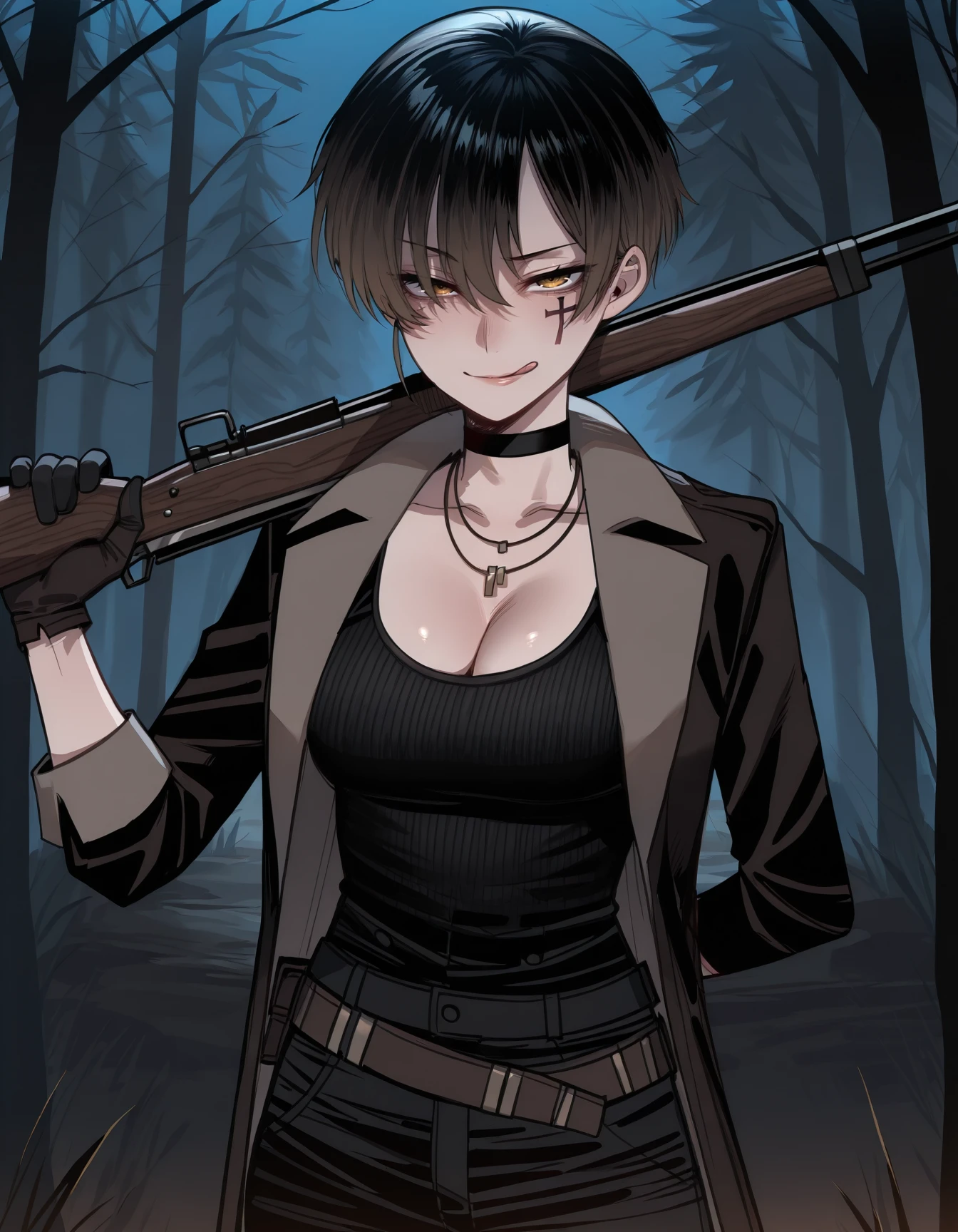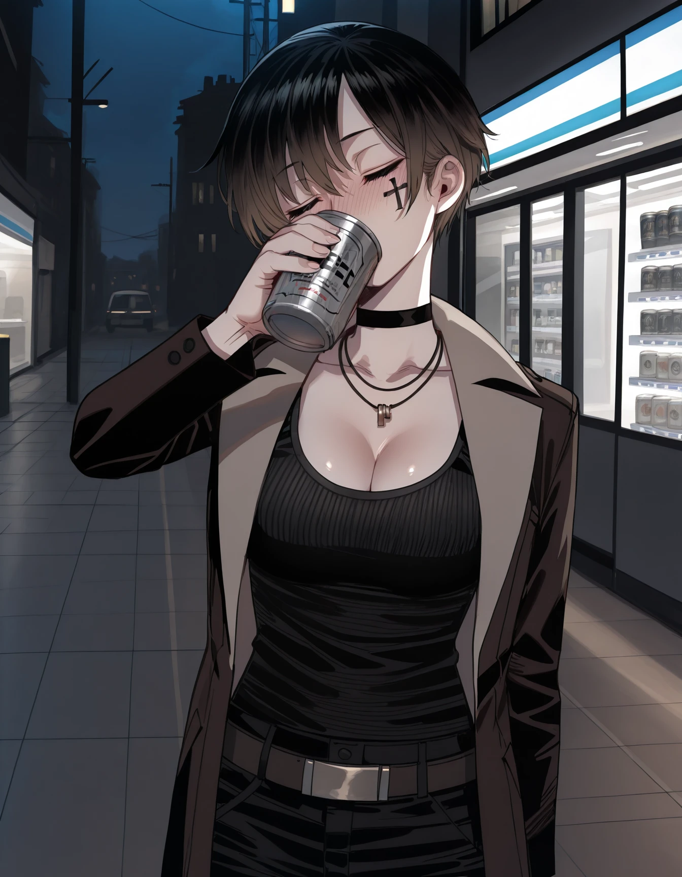 r31t0m, cross facial mark, choker, necklace, coat, tank top, cleavage, belt, pants