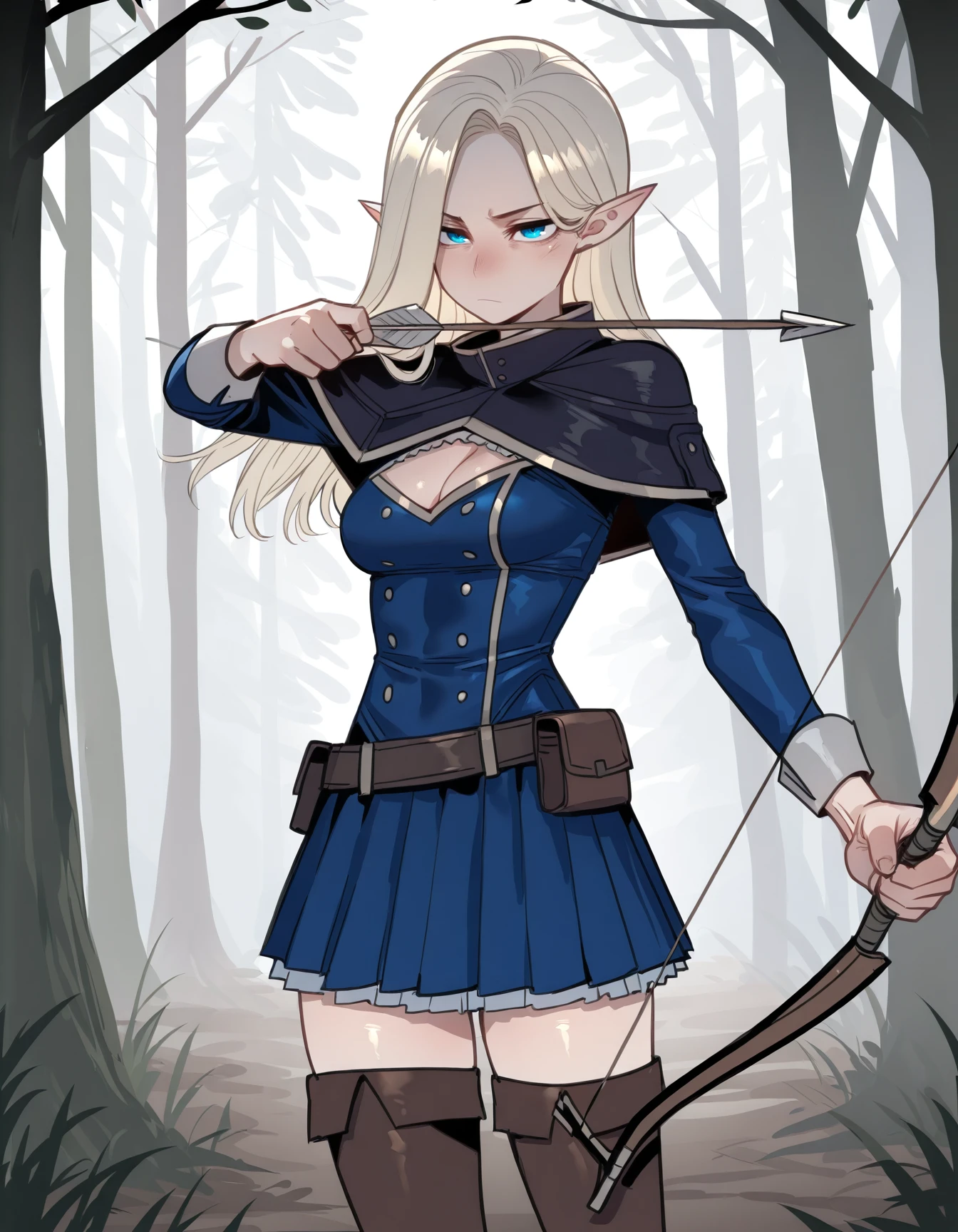 a5h3m4g3, capelet, cleavage cutout, blue dress, blue skirt, belt, belt pouch, thigh boots