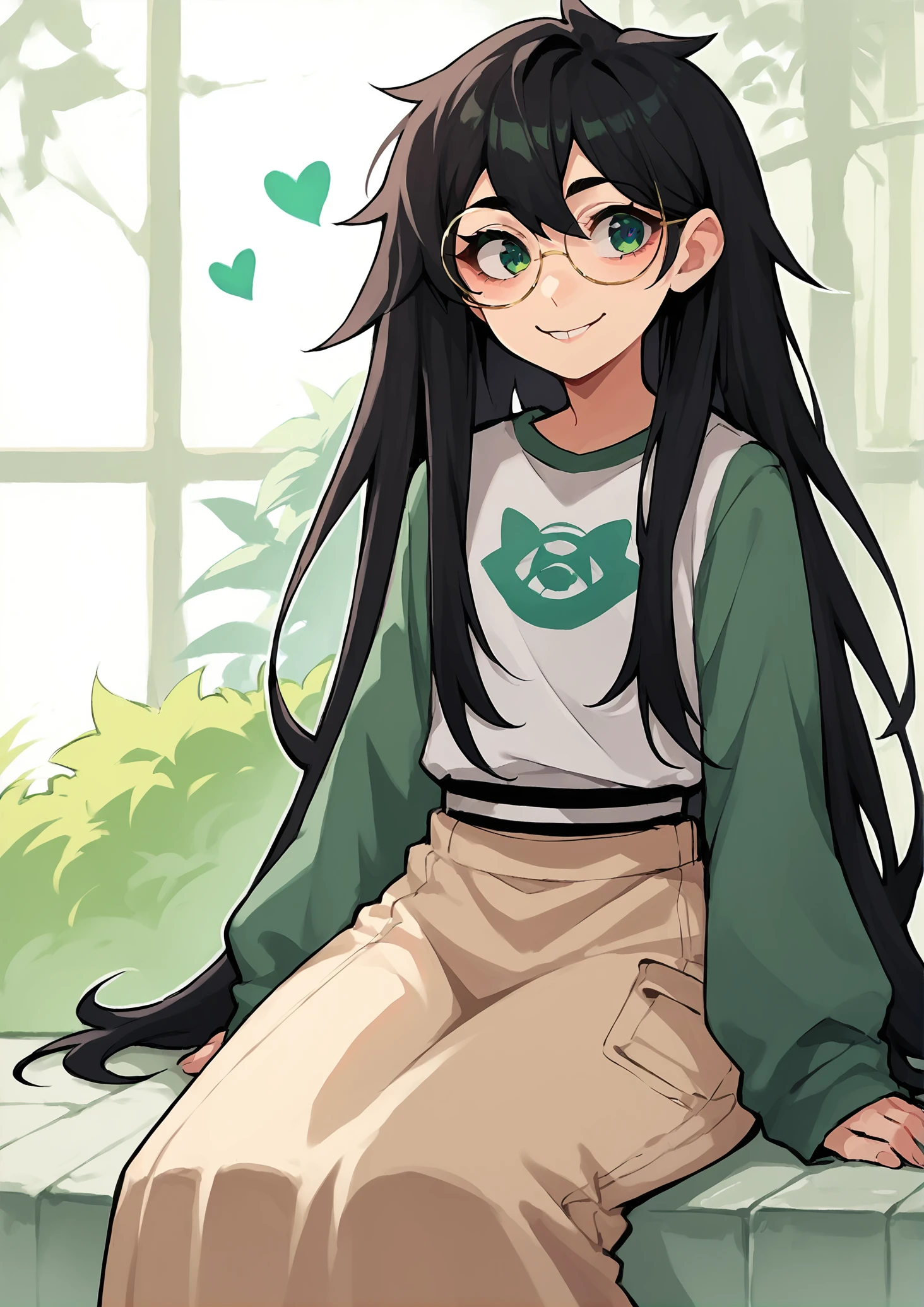 1girl, solo, black hair, long hair, glasses, green eyes, smile, white shirt, long skirt