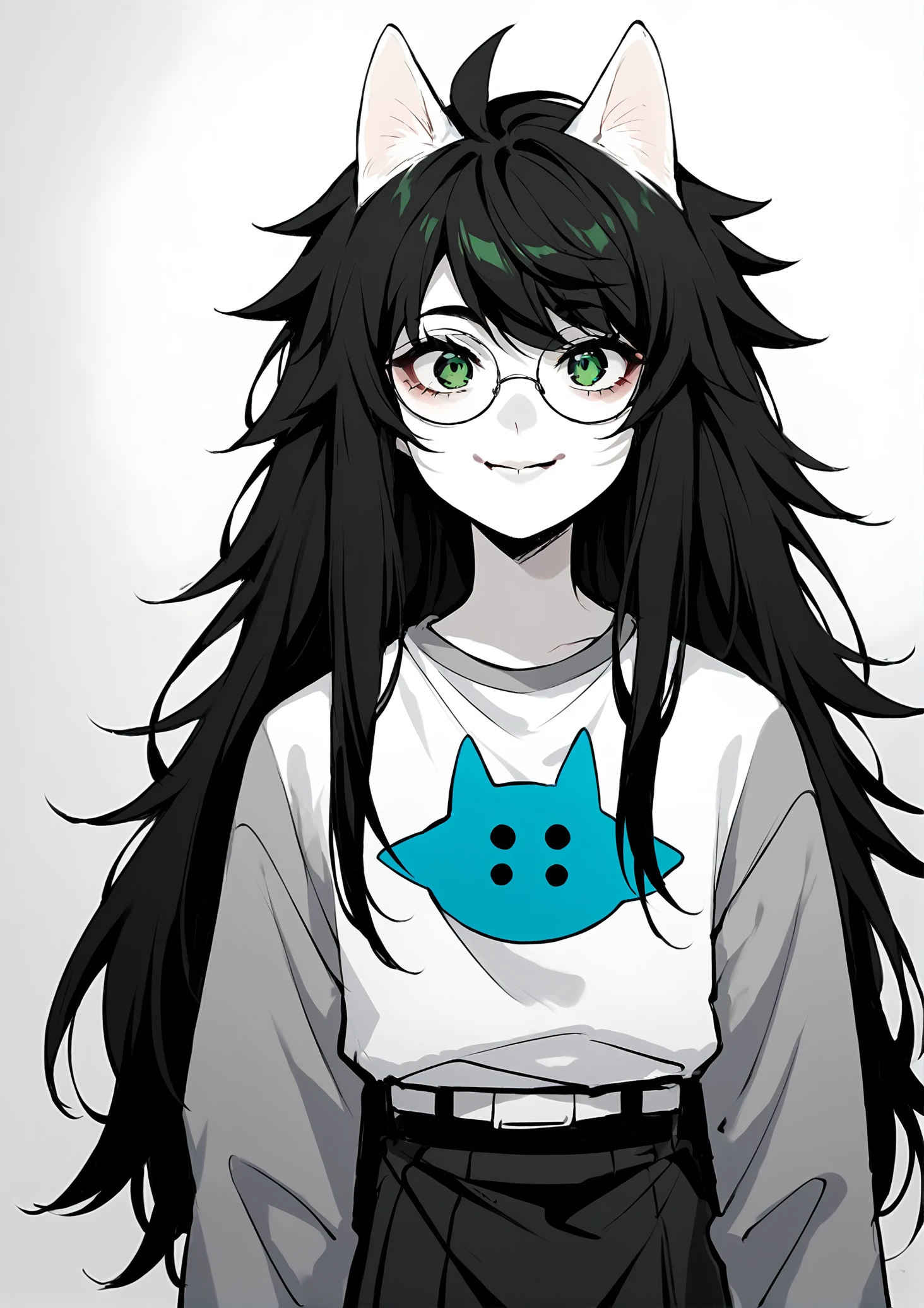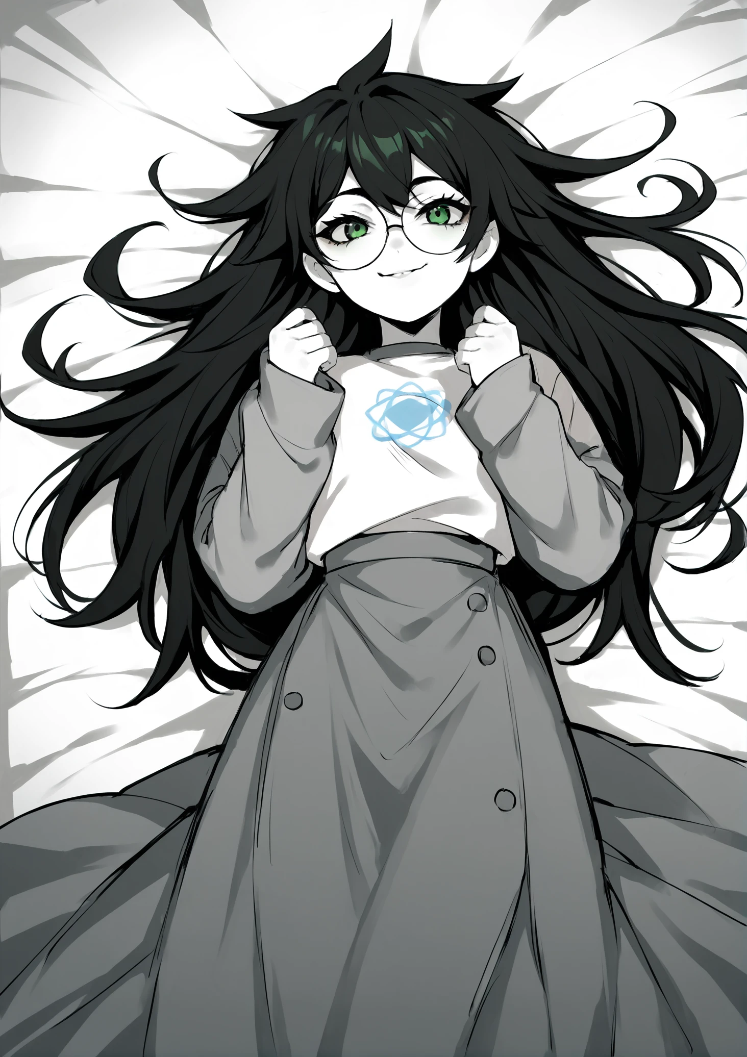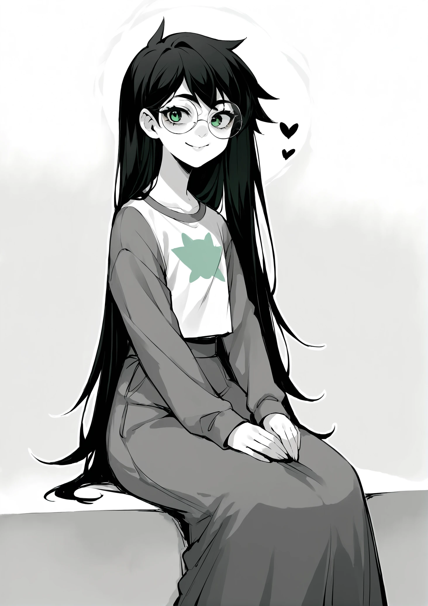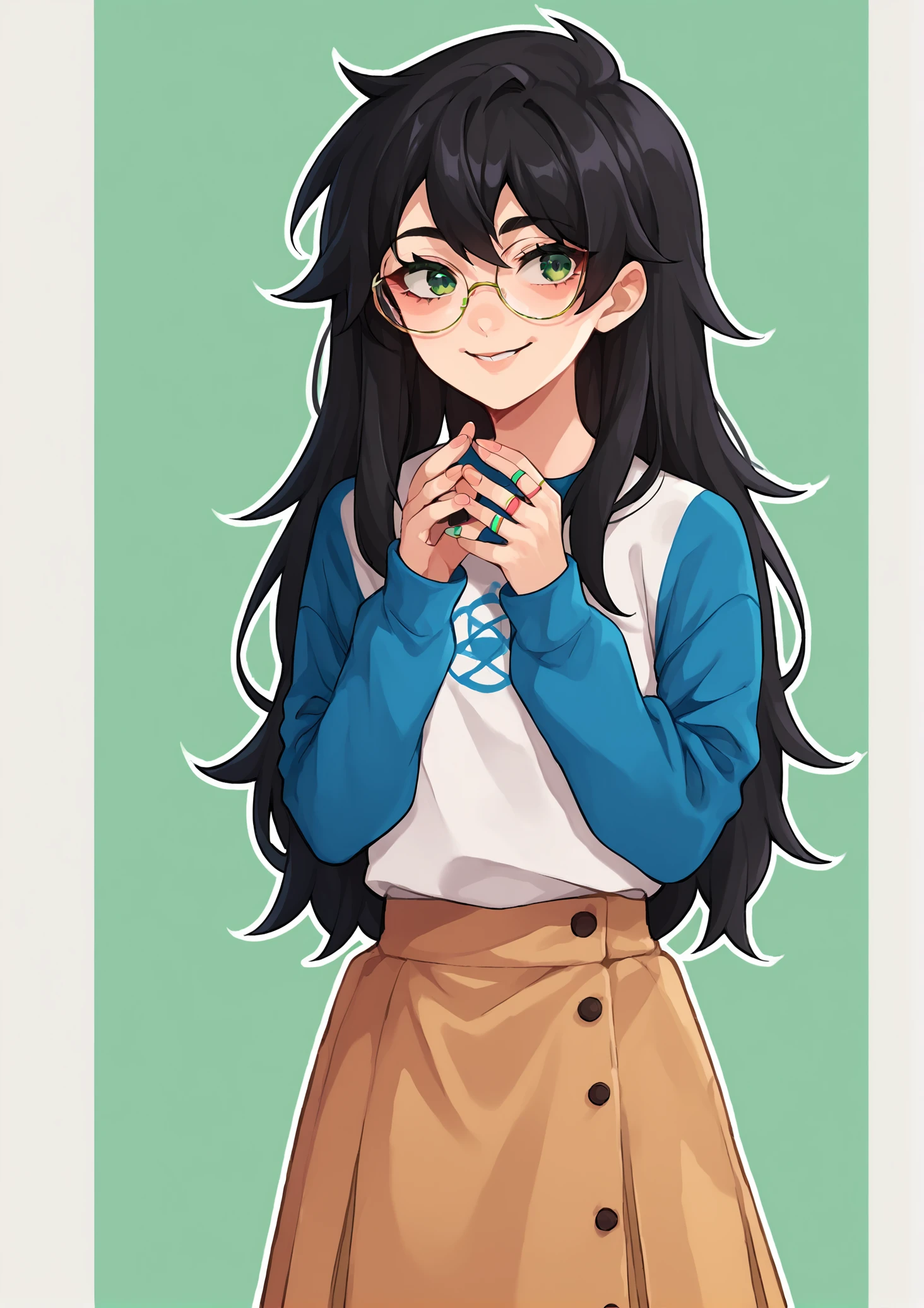 Relevant prompts: 1girl, solo, black hair, long hair, glasses, green eyes, smile, white shirt, long sleeves, blue sleeves, long skirt, monochrome, grey sleeves