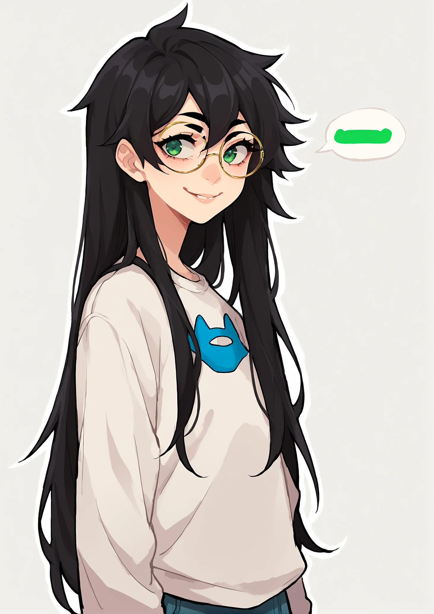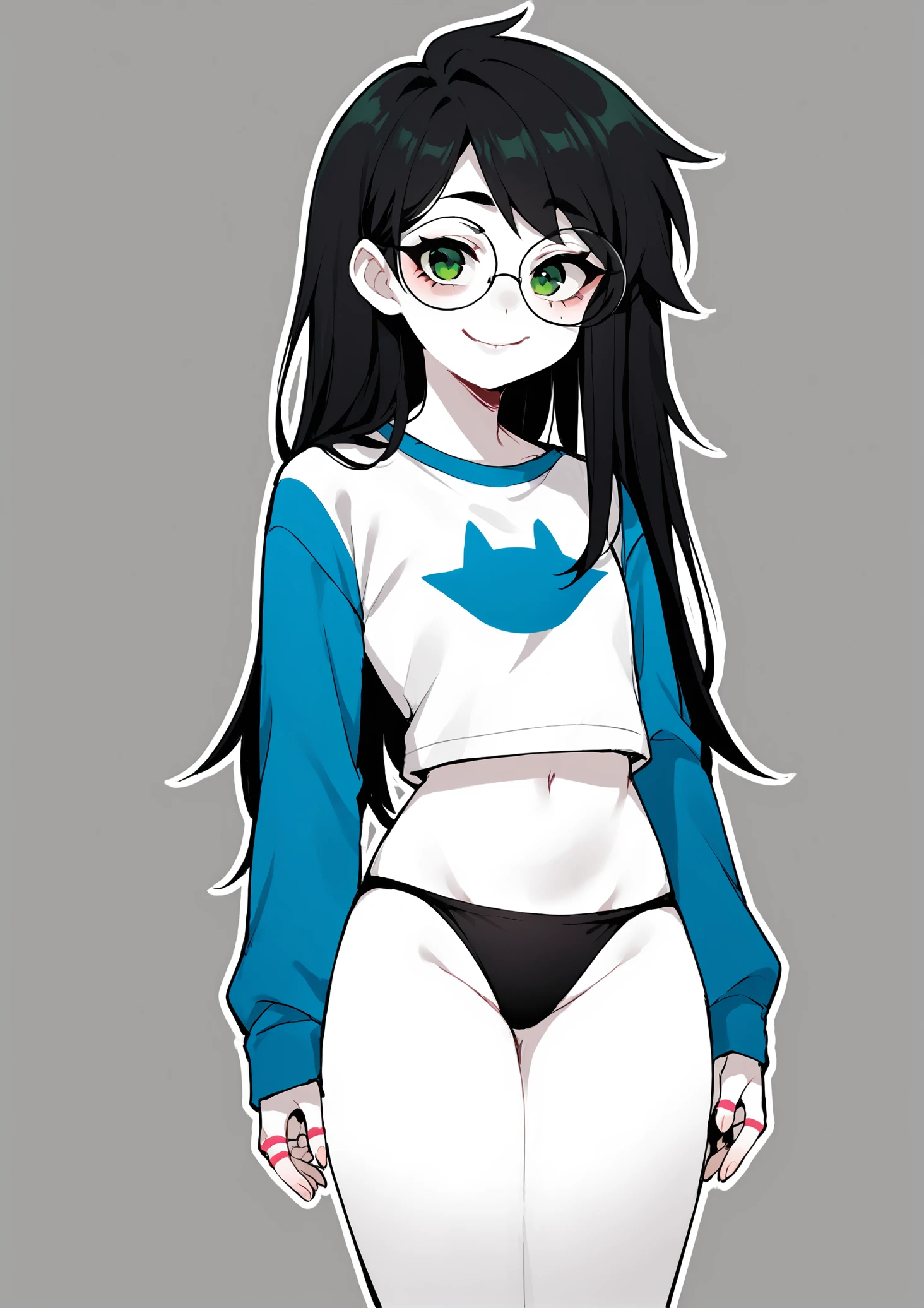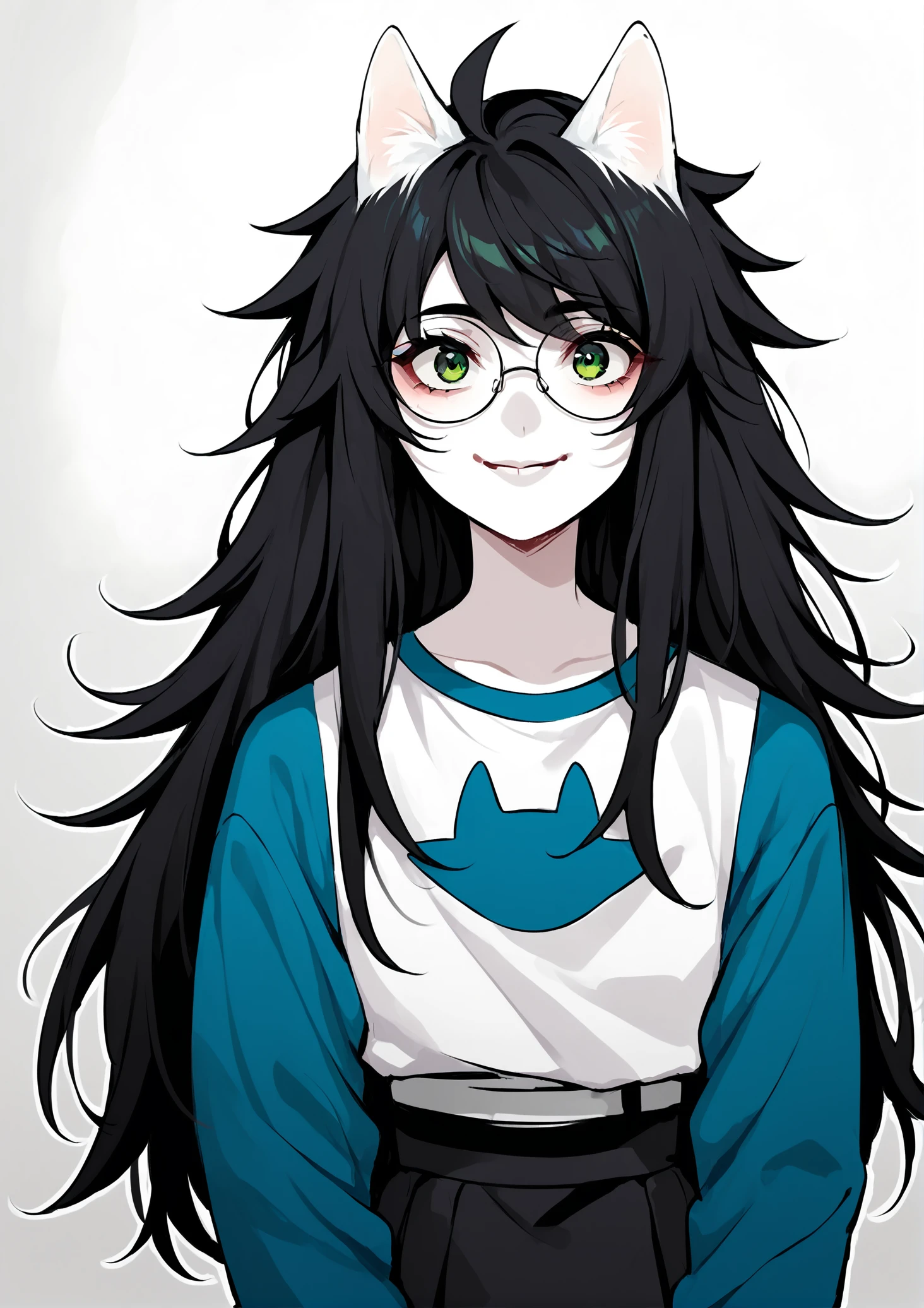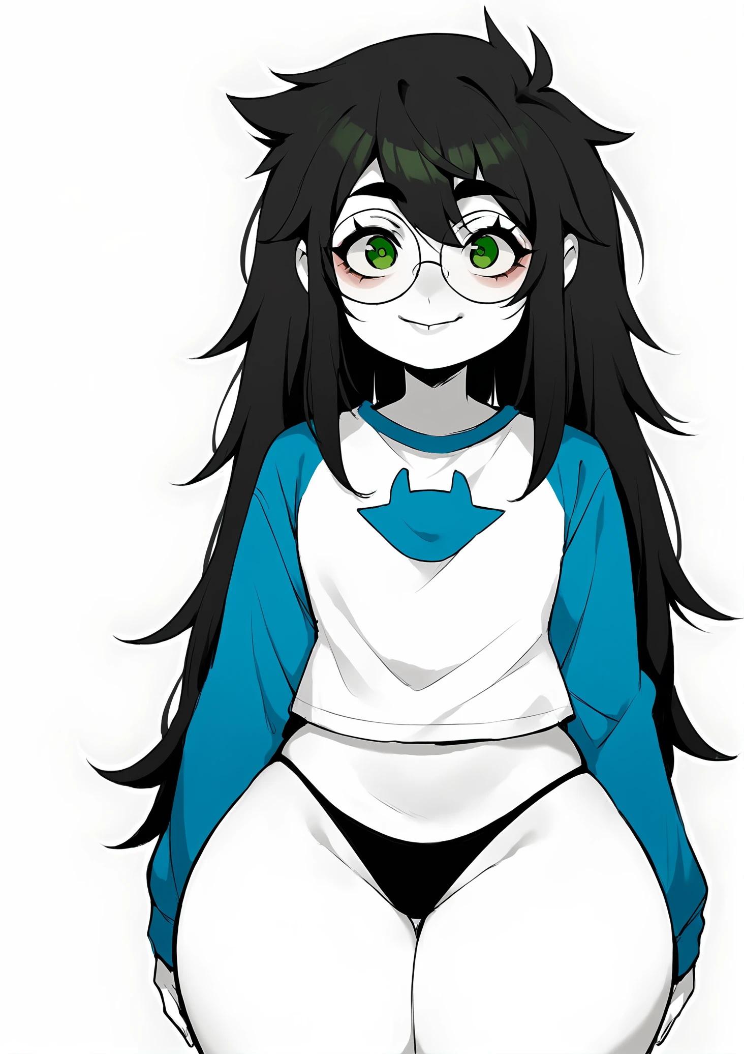 Relevant prompts: 1girl, solo, black hair, long hair, glasses, green eyes, smile, white shirt, long sleeves, blue sleeves, long skirt, monochrome, grey sleeves