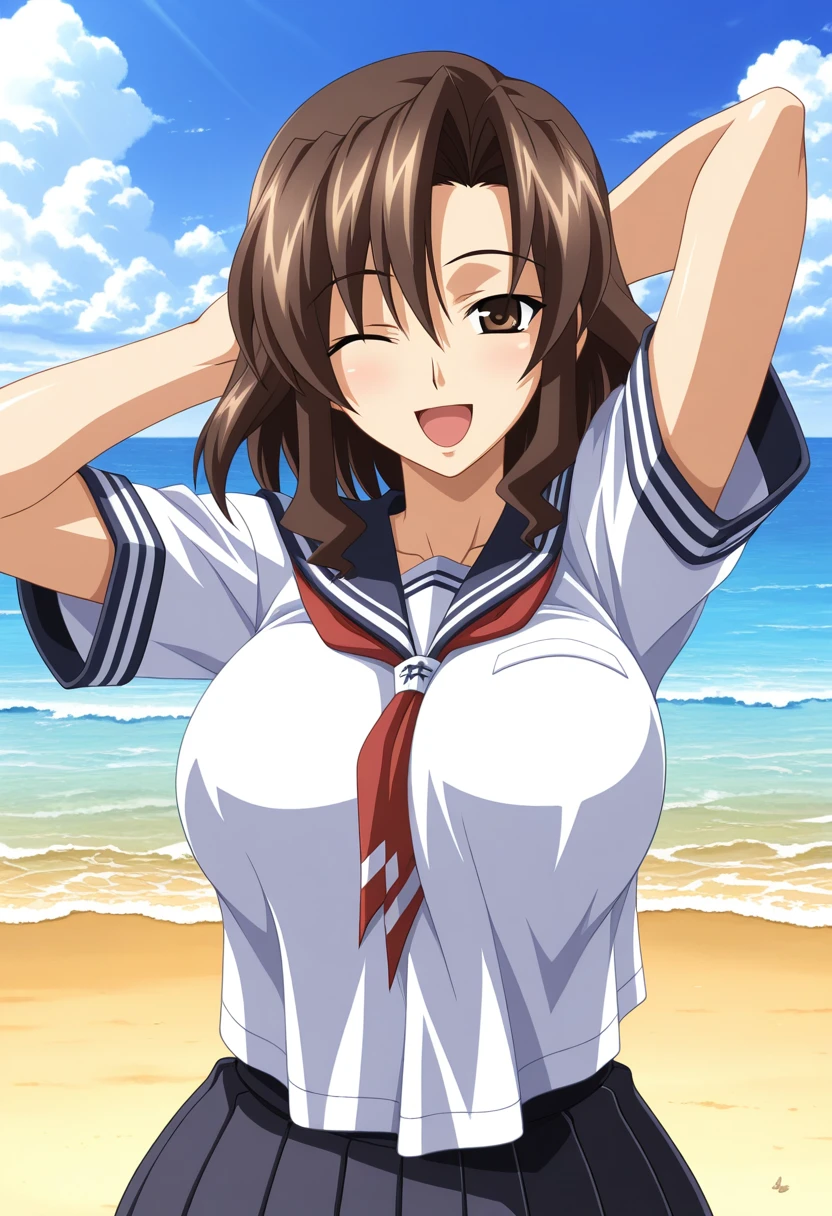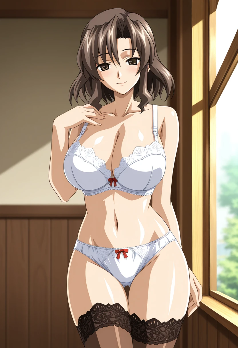 - honokaww, mature female, curvy, brown eyes, brown hair, medium hair, asymmetrical bangs, large breasts,