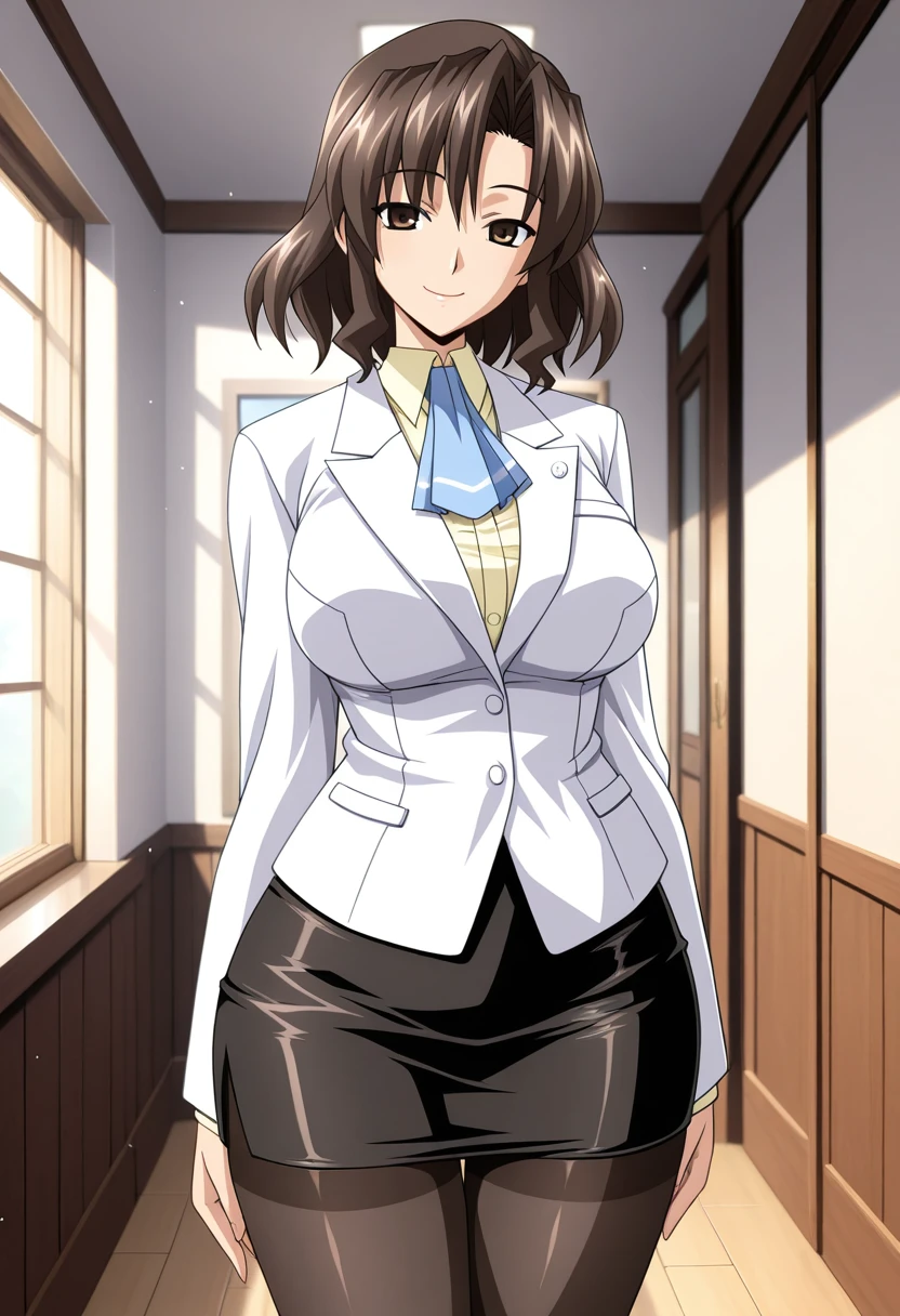 - skirt suit, light blue ascot, white jacket, blazer, light yellow shirt, long sleeves, black pencil skirt, black pantyhose, thighband pantyhose, high heels,