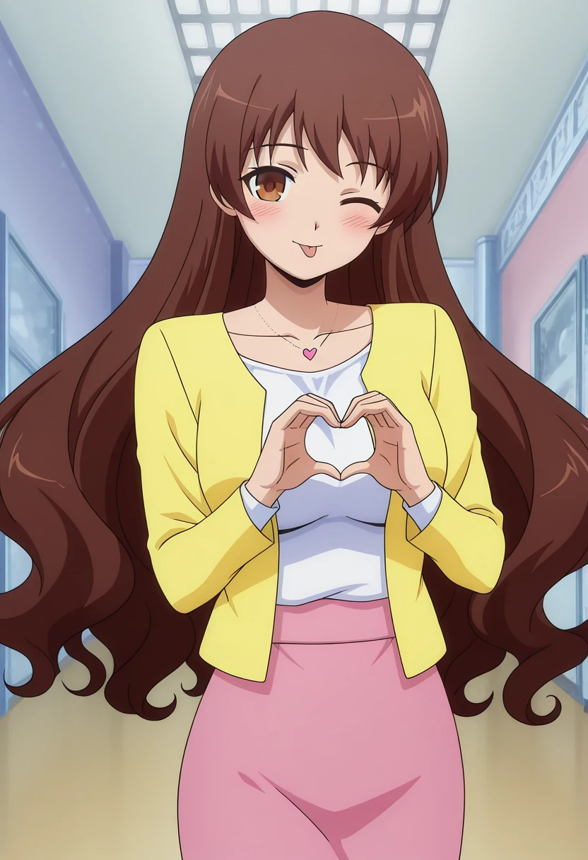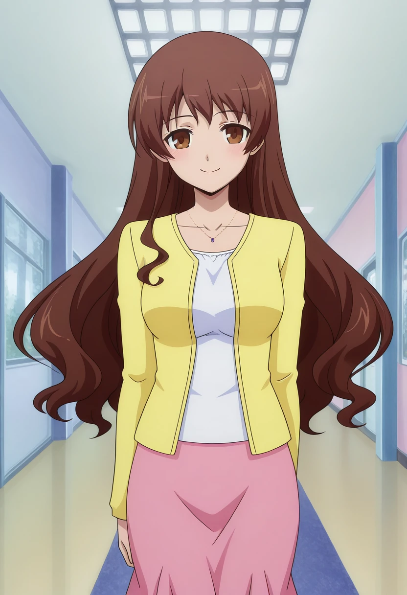 casual, necklace, yellow jacket, white shirt, long sleeves, pink skirt,