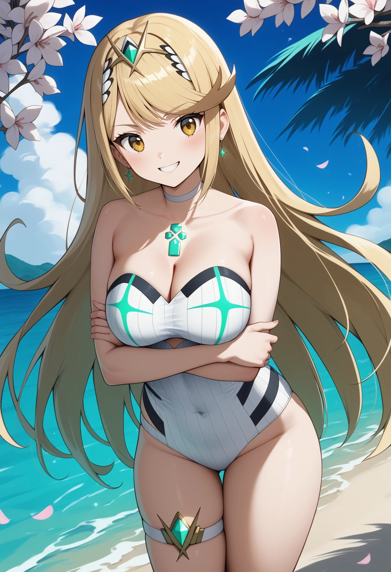 outfit4 (hikari)aahikari, long hair, blonde hair, swept bangs, earrings, yellow eyes, breasts, jewelry, choker, cleavage, bare shoulders, strapless swimsuit, white one-piece swimsuit, thigh strap