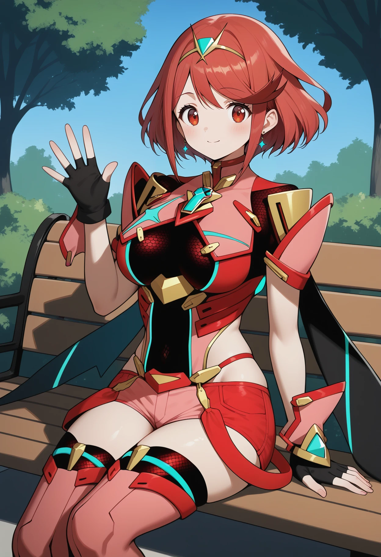 outfit1 (homura)aahomura, short hair, red hair, tiara, swept bangs, earrings, red eyes, breasts, jewelry, cape, armor, short sleeves, fingerless gloves, black gloves, short shorts, red shorts, red thighhighs